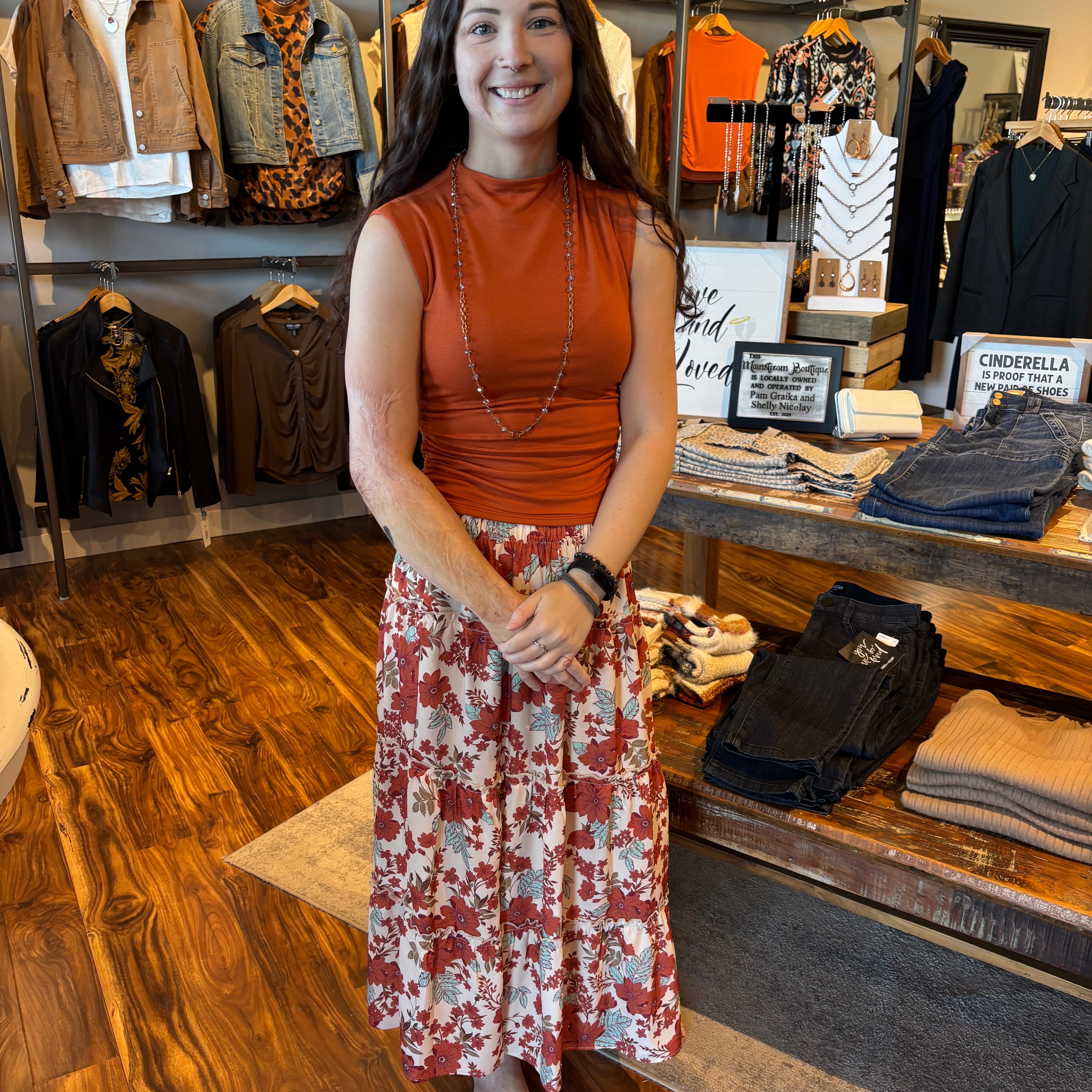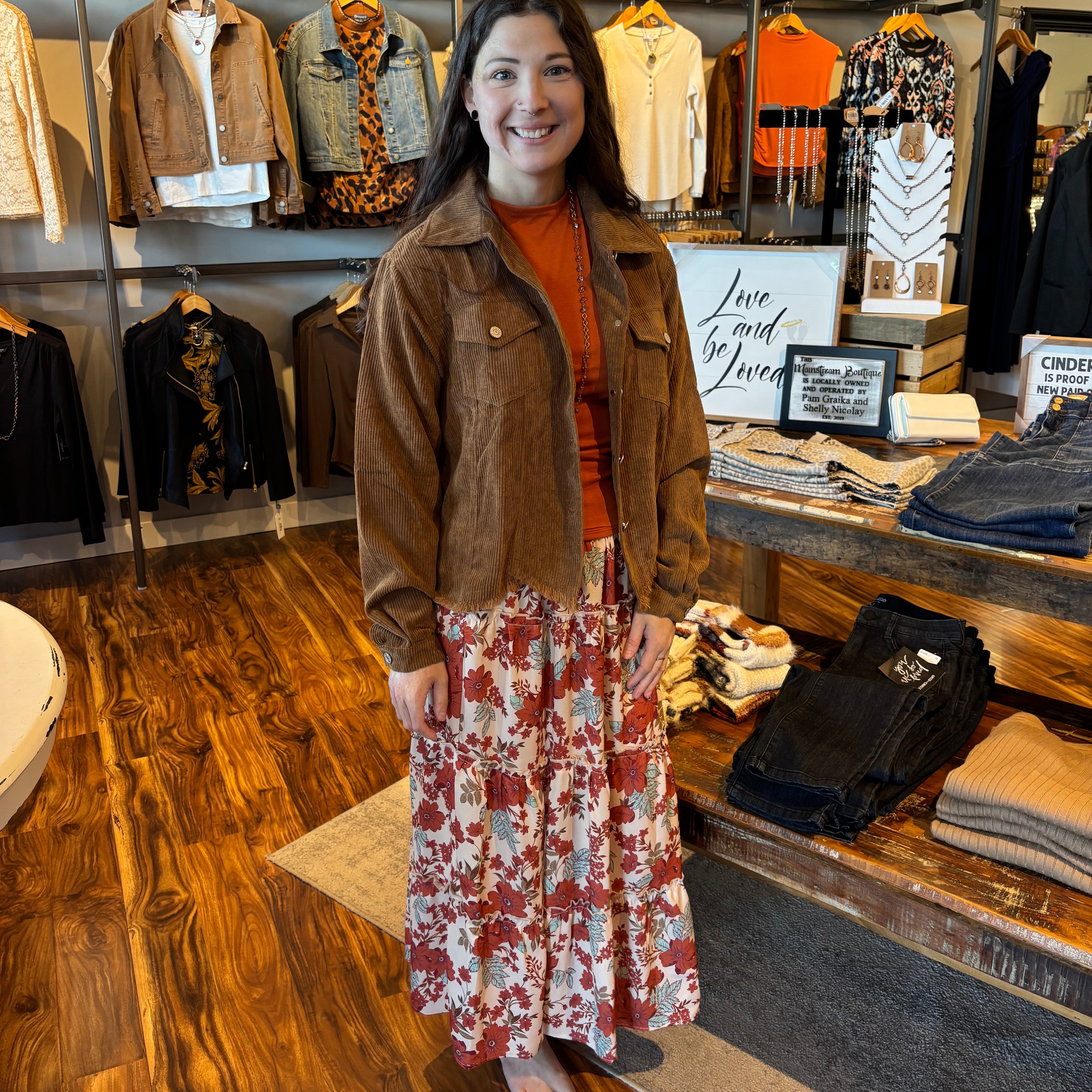 This Tiered Maxi Skirt brings feminine elegance with a modern edge. Featuring the same fall-inspired print you love, it flows beautifully with soft tiers that create graceful movement from every angle. A subtle side slit adds just the right touch of sophistication, balancing ease and allure. Lightweight and fully lined, it’s designed for all-day comfort and effortless versatility.