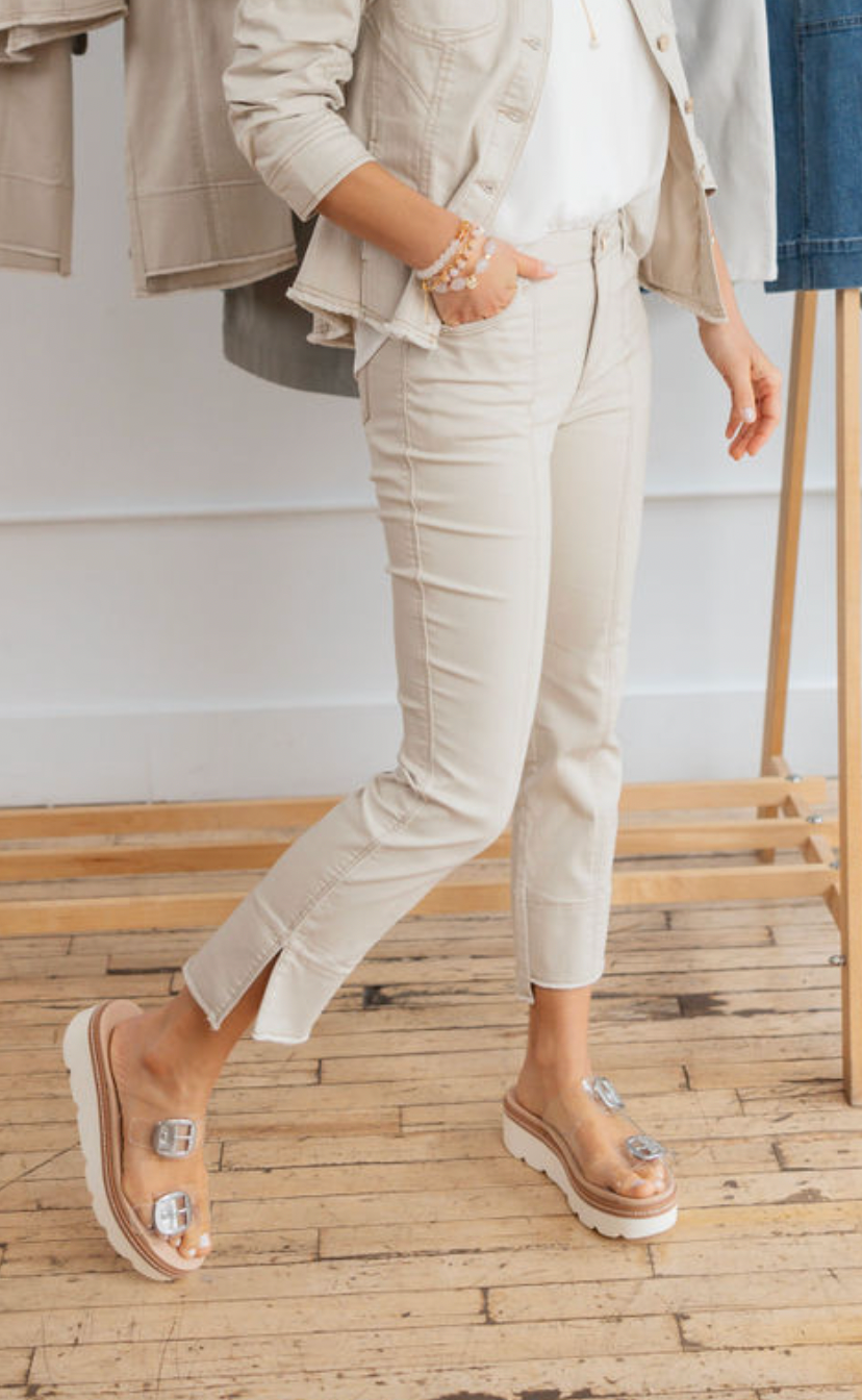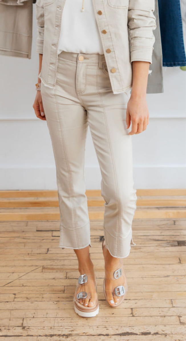 Upgrade your wardrobe with these stylish kick flare denim pants, featuring a trendy cropped silhouette and a subtle flared hem. Designed with soft, neutral-toned fabric in a birch color, they offer a clean, minimalistic look that pairs perfectly with casual or dressy outfits. The structured front seam detail adds a touch of sophistication, while the raw edge hem keeps it modern and fresh. With an inseam of 26.5", a leg opening of 16", and a rise of 9.5", these pants are both comfortable and flattering. A must-have staple for versatile styling in any season!