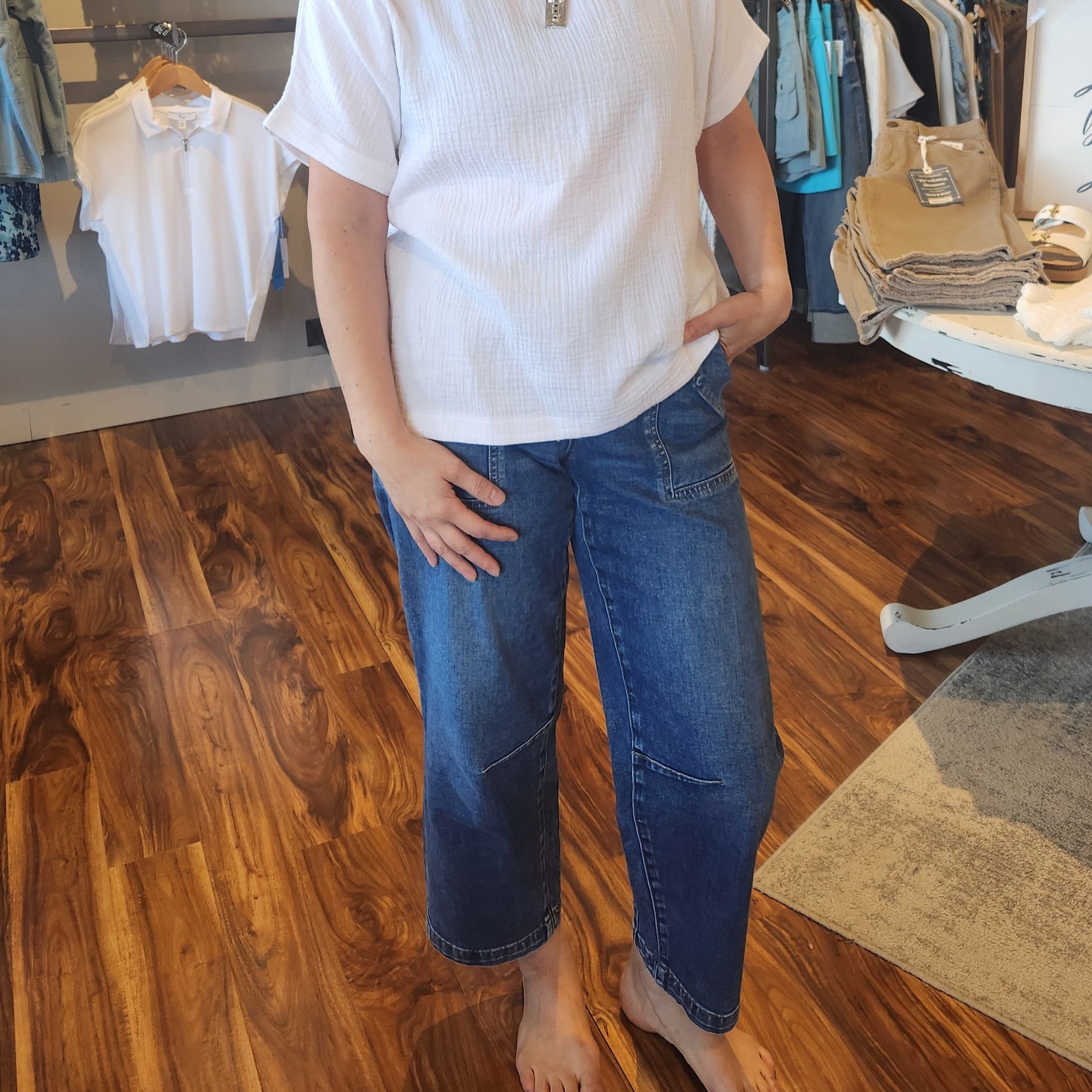 These barrel jeans showcase a slight barrel leg design that offers a modern, tailored fit distinct from traditional wide-leg styles. Featuring unique porkchop pockets, they combine trendy details with practical functionality, making them a versatile addition to any wardrobe seeking contemporary denim with subtle edge.