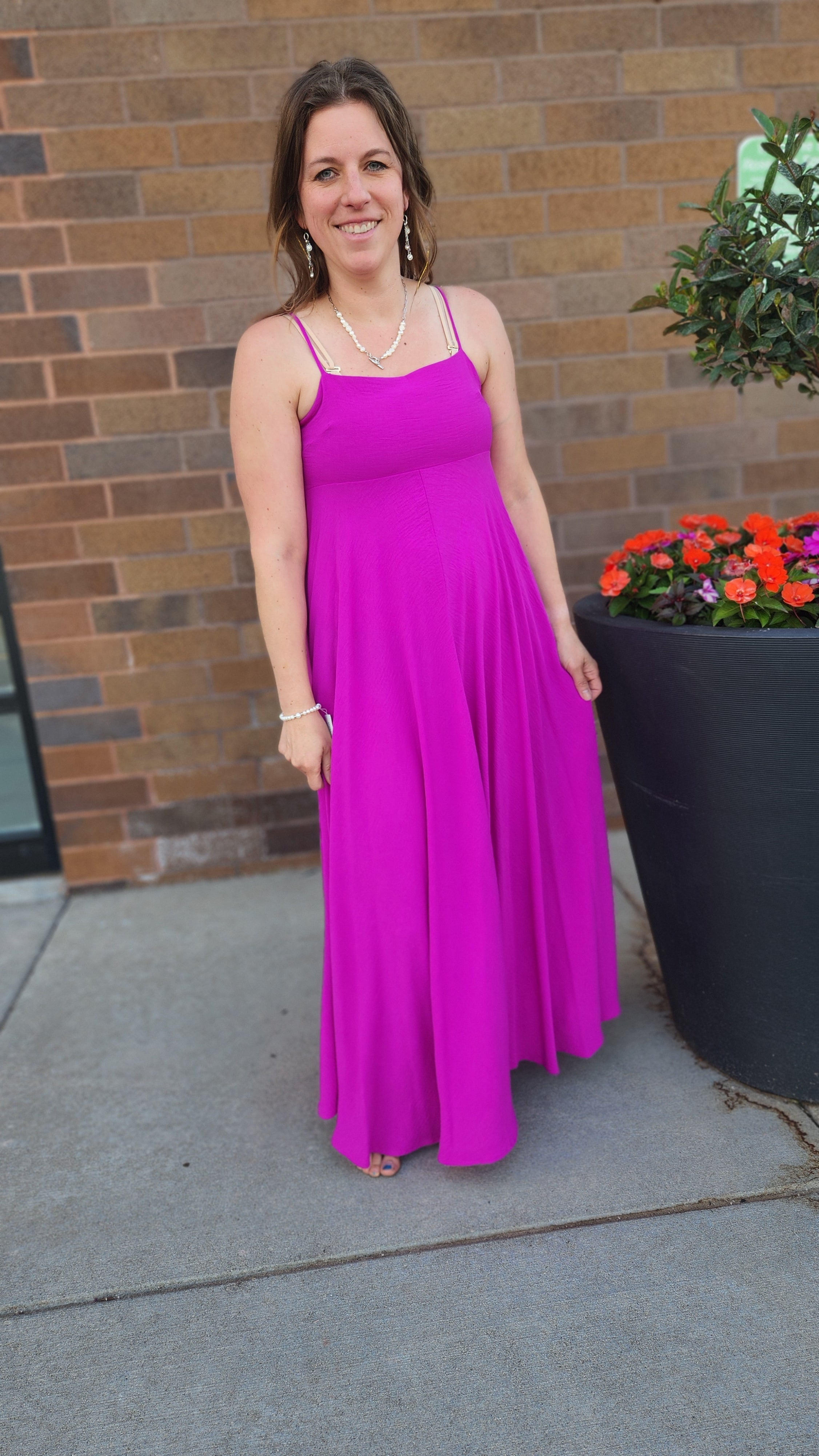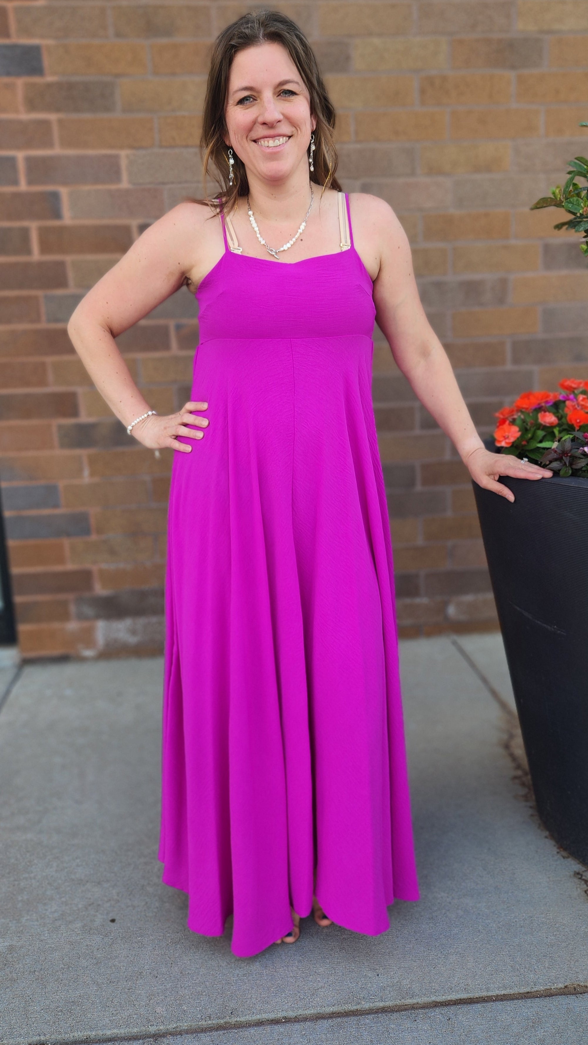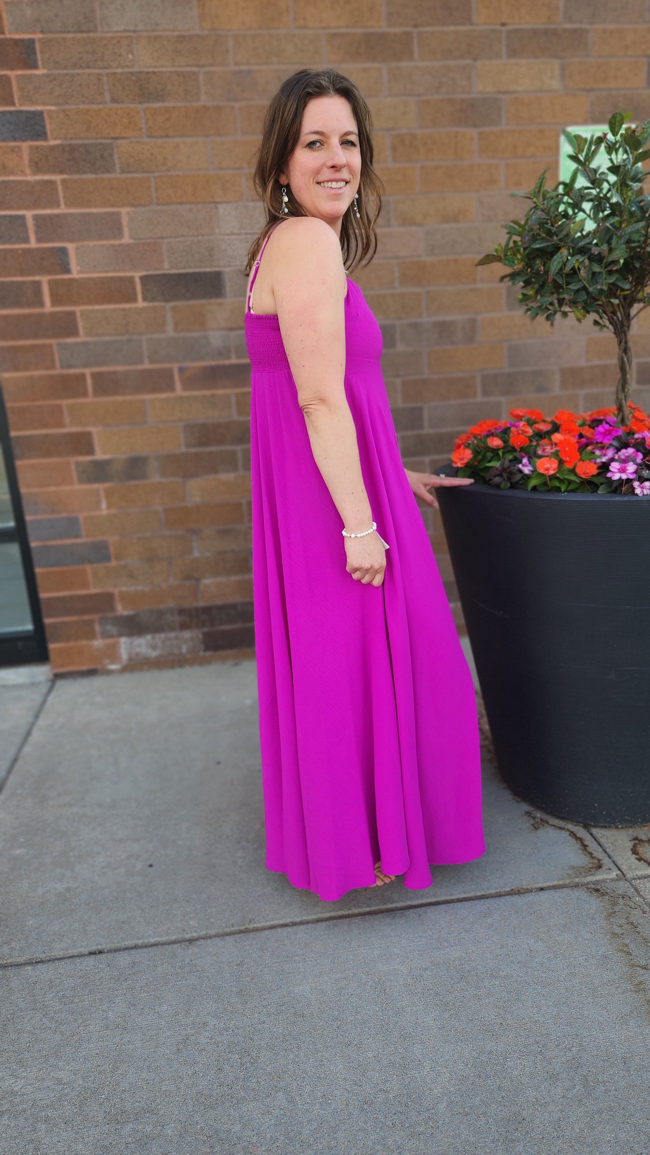 This full-length dress features adjustable spaghetti straps for a customized fit and a smocked back that enhances comfort and shape. Designed in a vibrant color, its flared silhouette creates an elegant, flowing look perfect for various occasions. The combination of flattering fit and striking hue ensures a confident, polished appearance.
