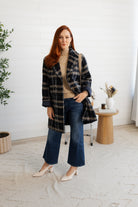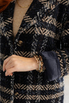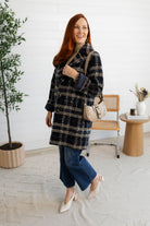 A timeless layer with standout style, this fully lined boucle coat features a classic notched lapel and structured silhouette for that refined, blazer-inspired look. The richly textured plaid—woven in shades of navy, taupe, white, black, and sky blue—adds depth and dimension while keeping things versatile. Whether dressed up or down, this coat brings elevated warmth to any outfit.