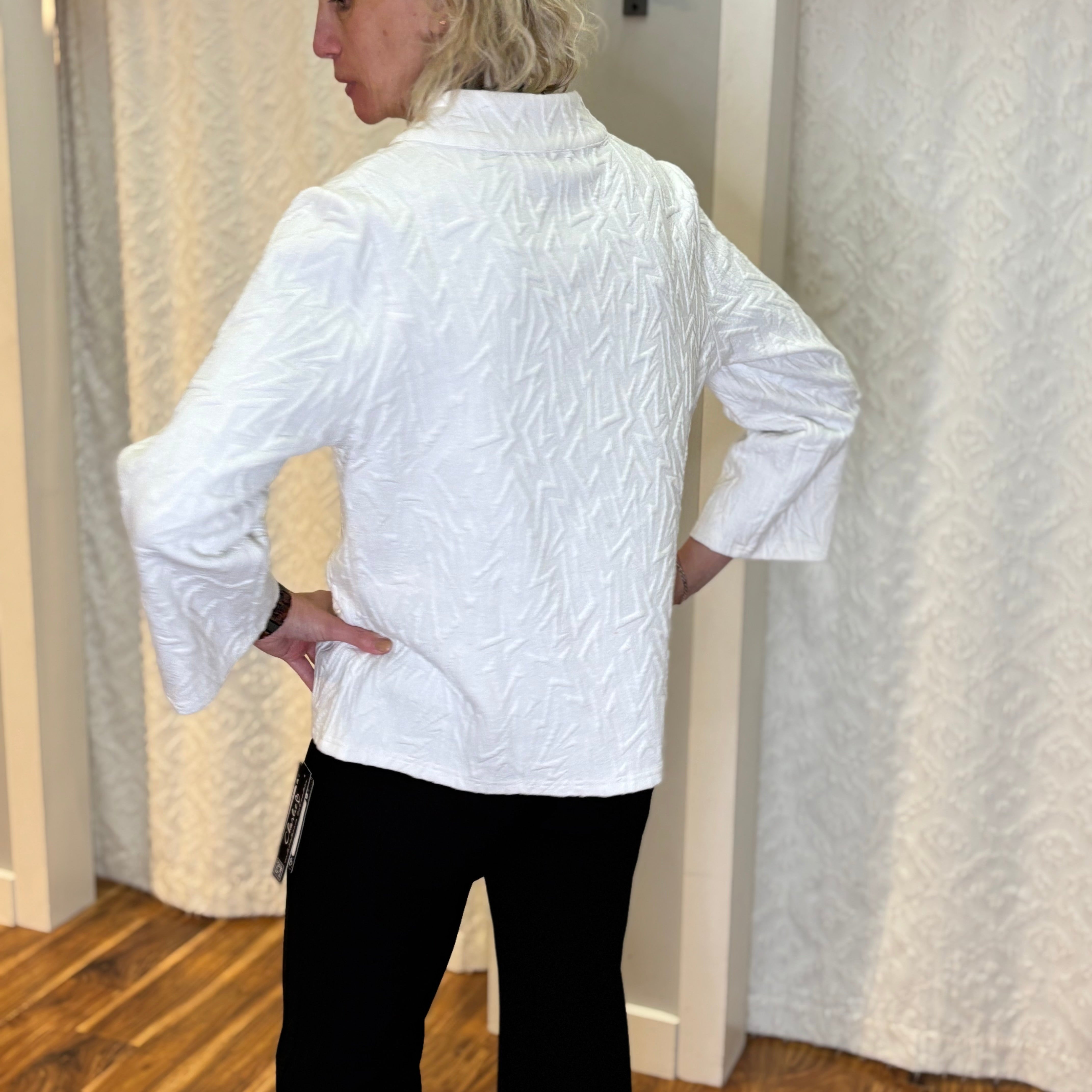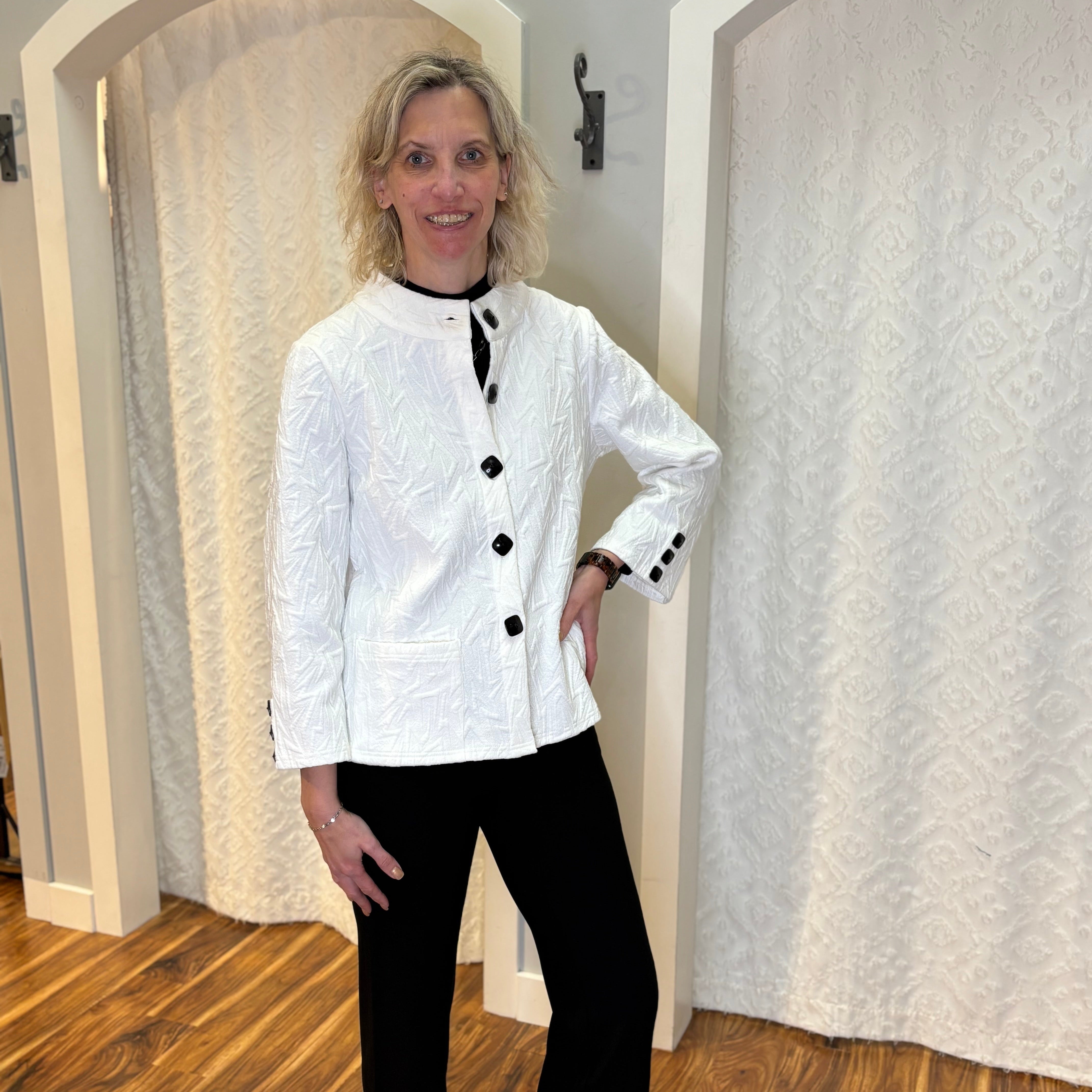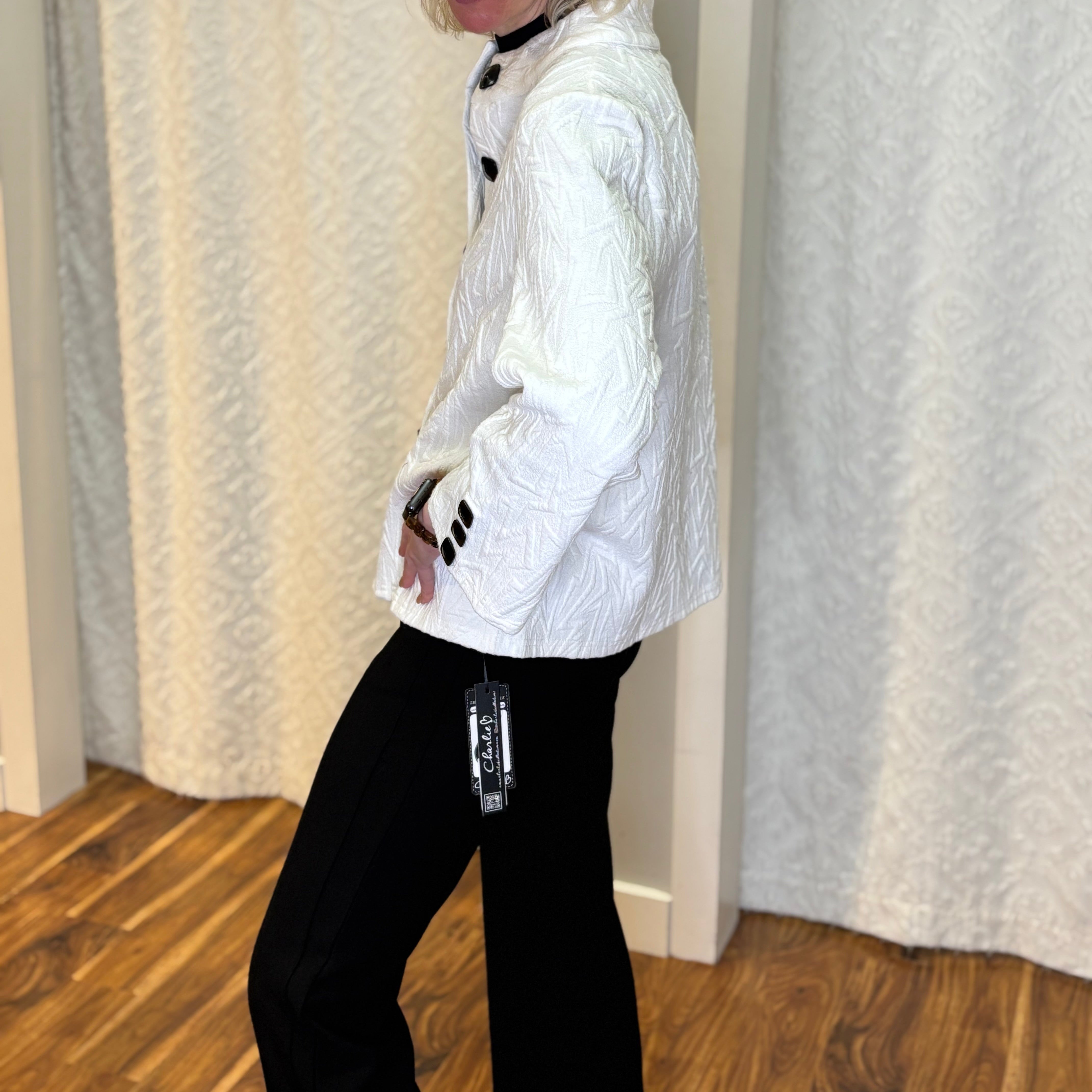Clean, crisp, and effortlessly refined, this White Textured Jacket brings a modern twist to classic layering. Crafted with a soft drape and a touch of stretch, it’s finished with large square black buttons that stand out beautifully against the bright white backdrop — giving it that artful, gallery-ready vibe. Lightweight yet polished, it transitions seamlessly from work to weekend.