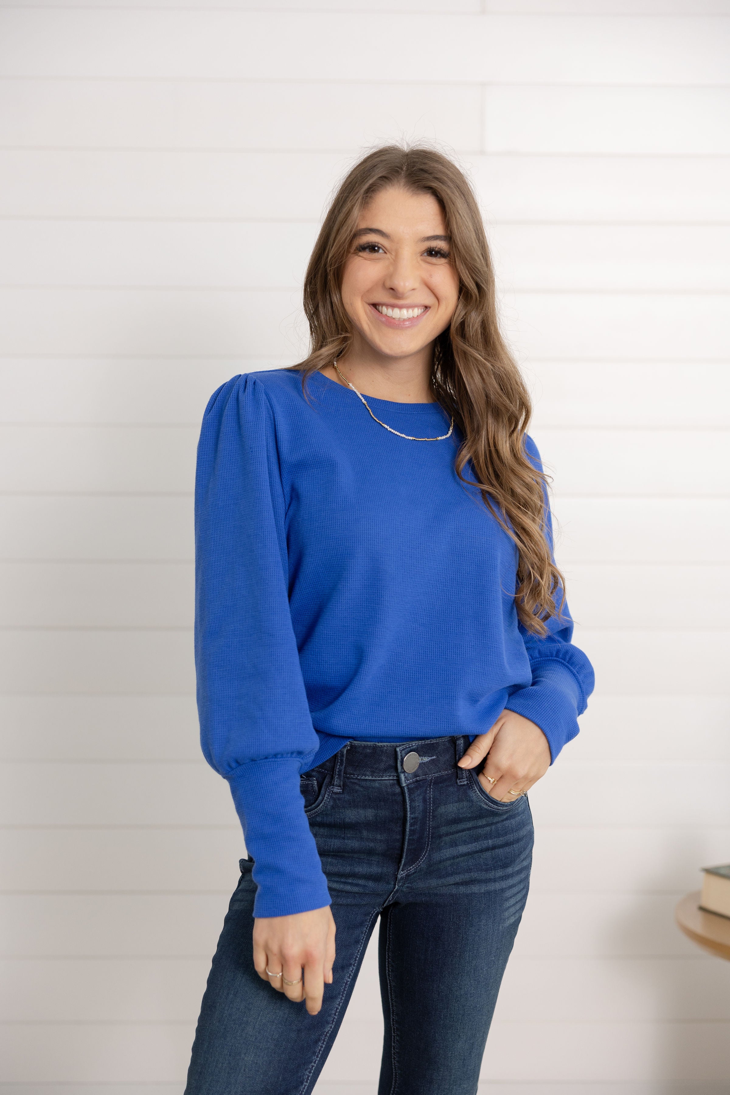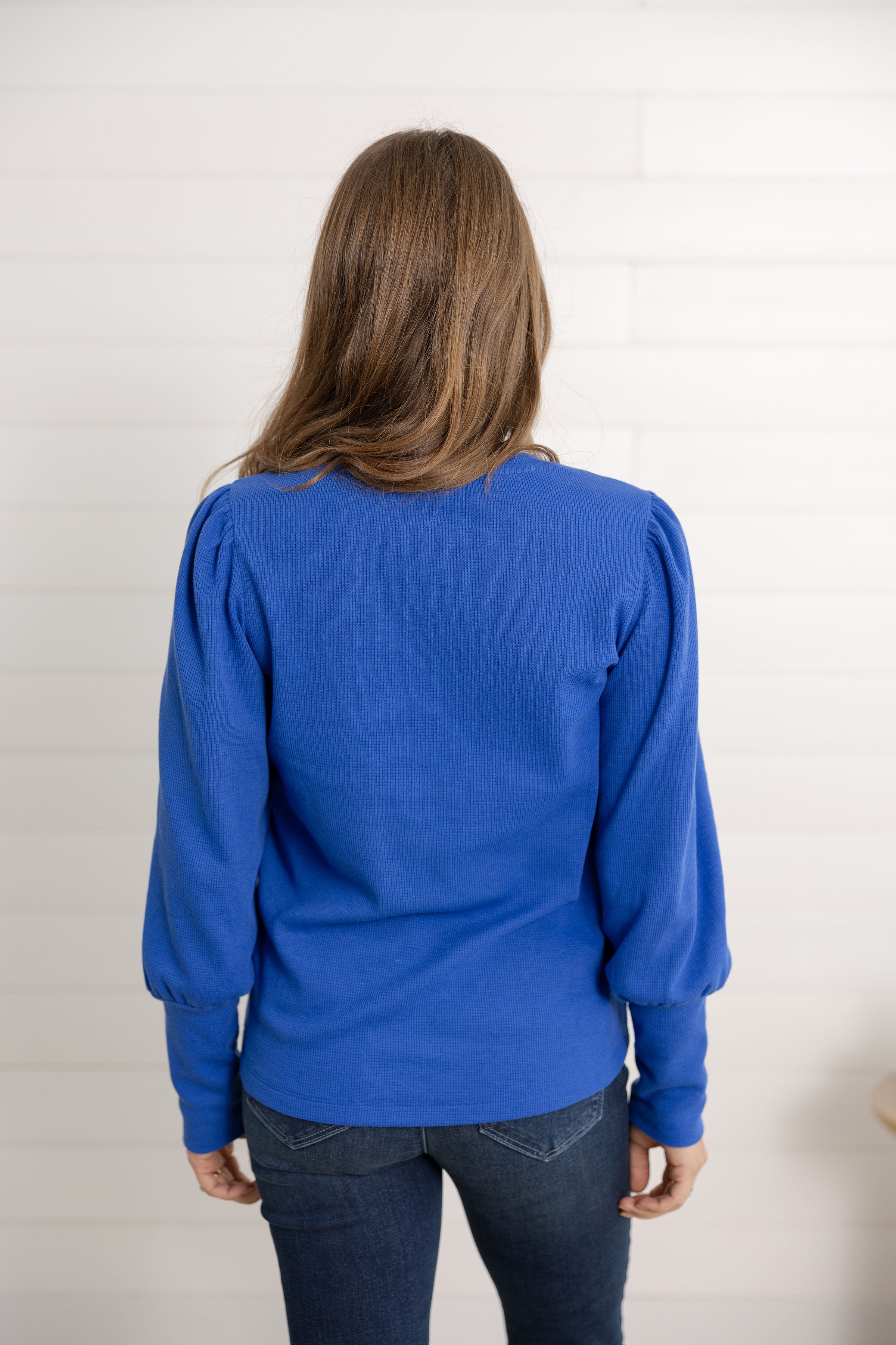 Feminine and flattering, the Mac and Me Gathered Shoulder Top is your new go-to for elevated everyday style. Crafted in a lightweight mini waffle knit, it features gently gathered shoulders and puffed sleeves with extra-long cuffs for a chic, modern finish. The classic crew neckline keeps it versatile, while the soft stretch makes it perfect for all-day wear.