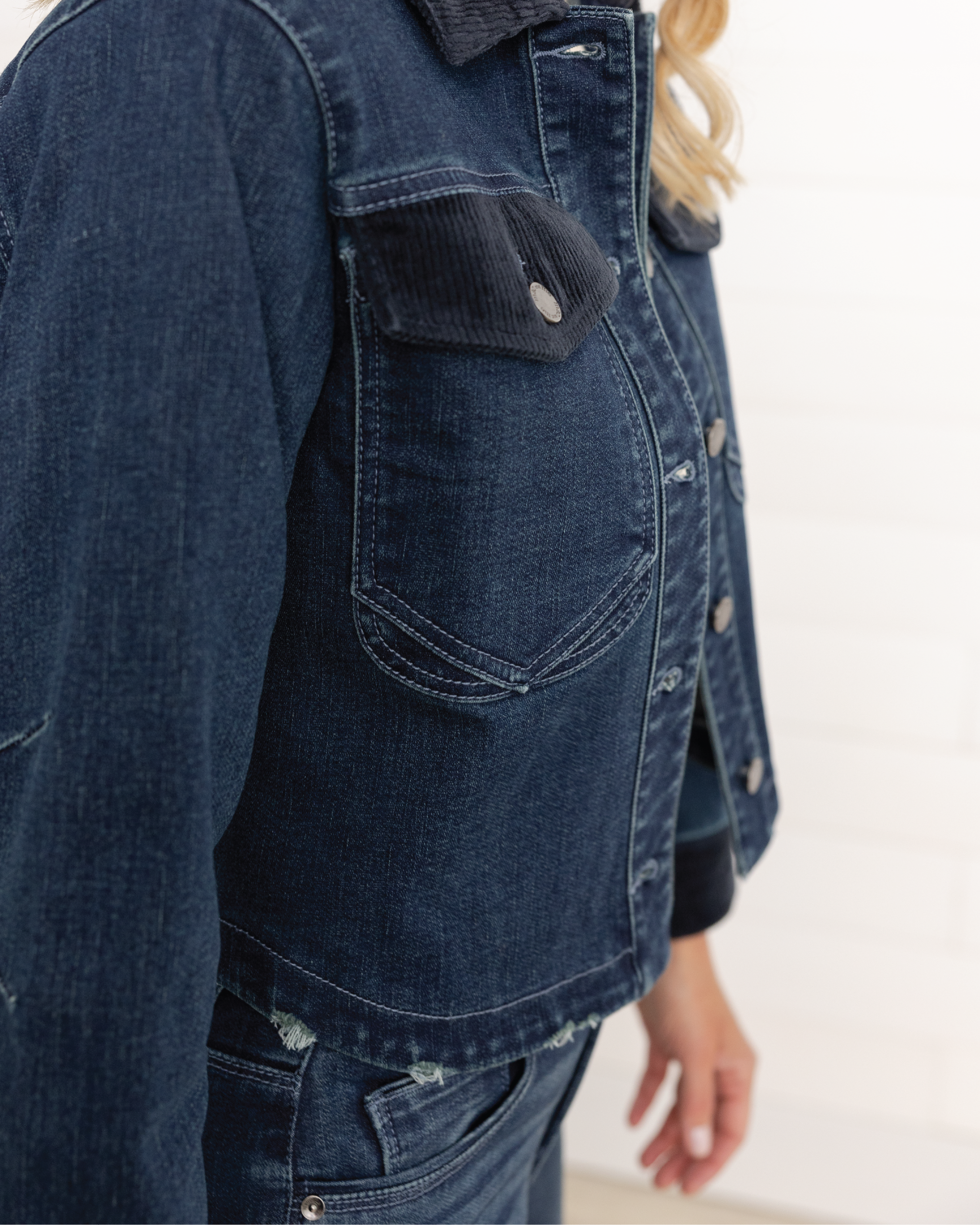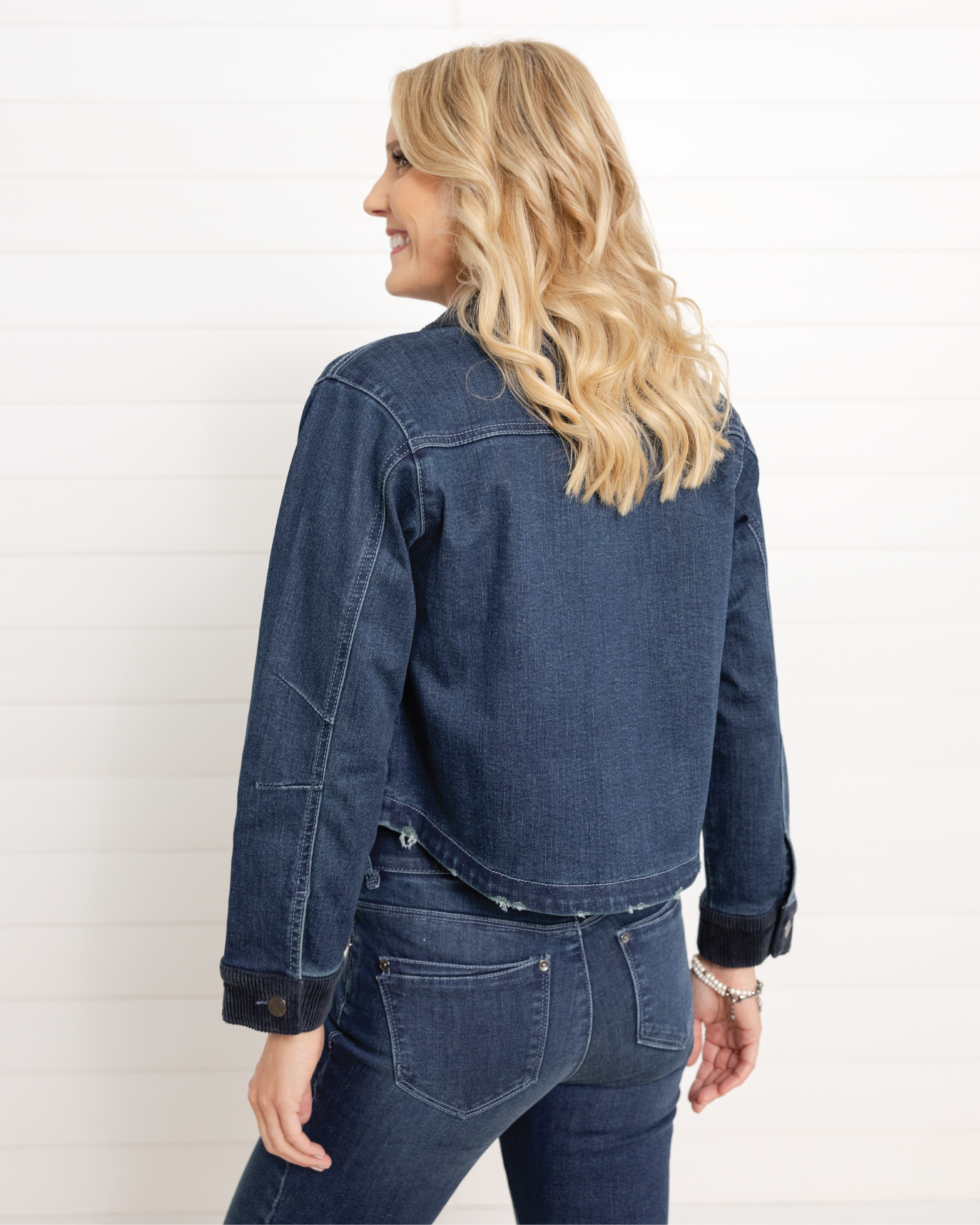Say hello to your new go-to layer: the Mac and Me Corduroy Contrast Denim Jacket. This slightly oversized stunner pairs rich navy corduroy accents with classic denim in the most effortlessly cool way. With subtle distressing at the hem and our signature Mac and Me charm sewn right in, it’s the kind of jacket that turns a casual outfit into a whole look.