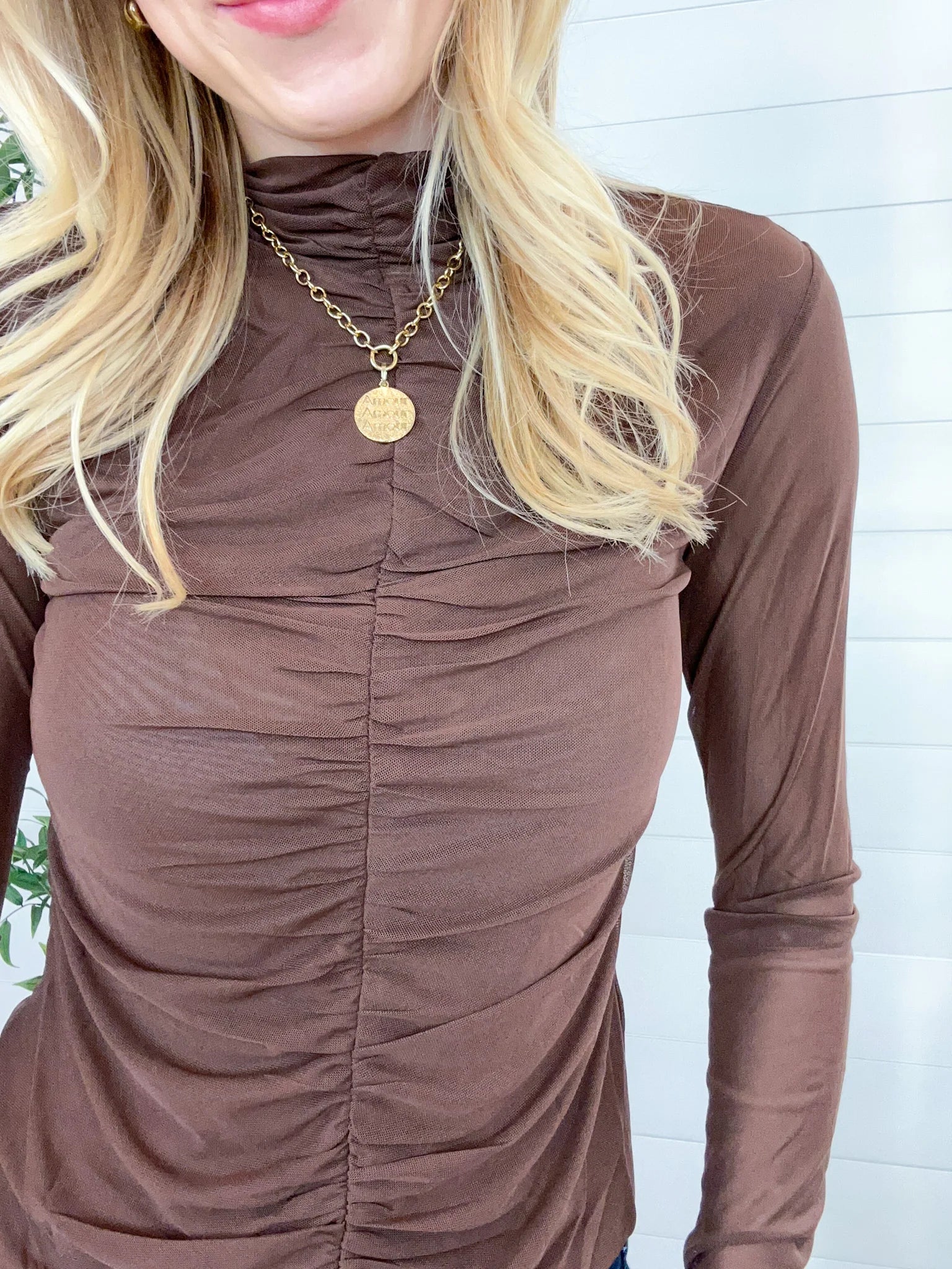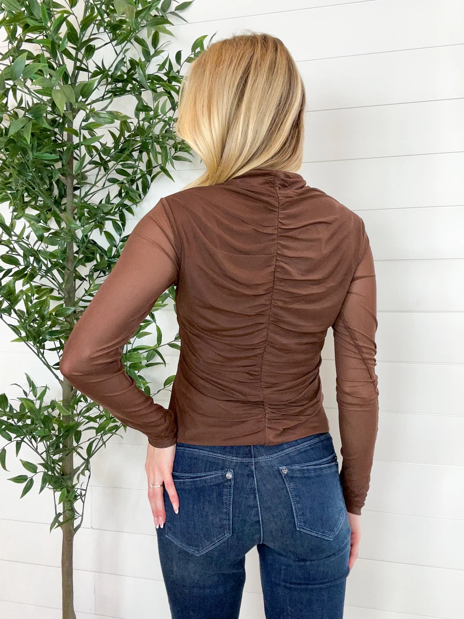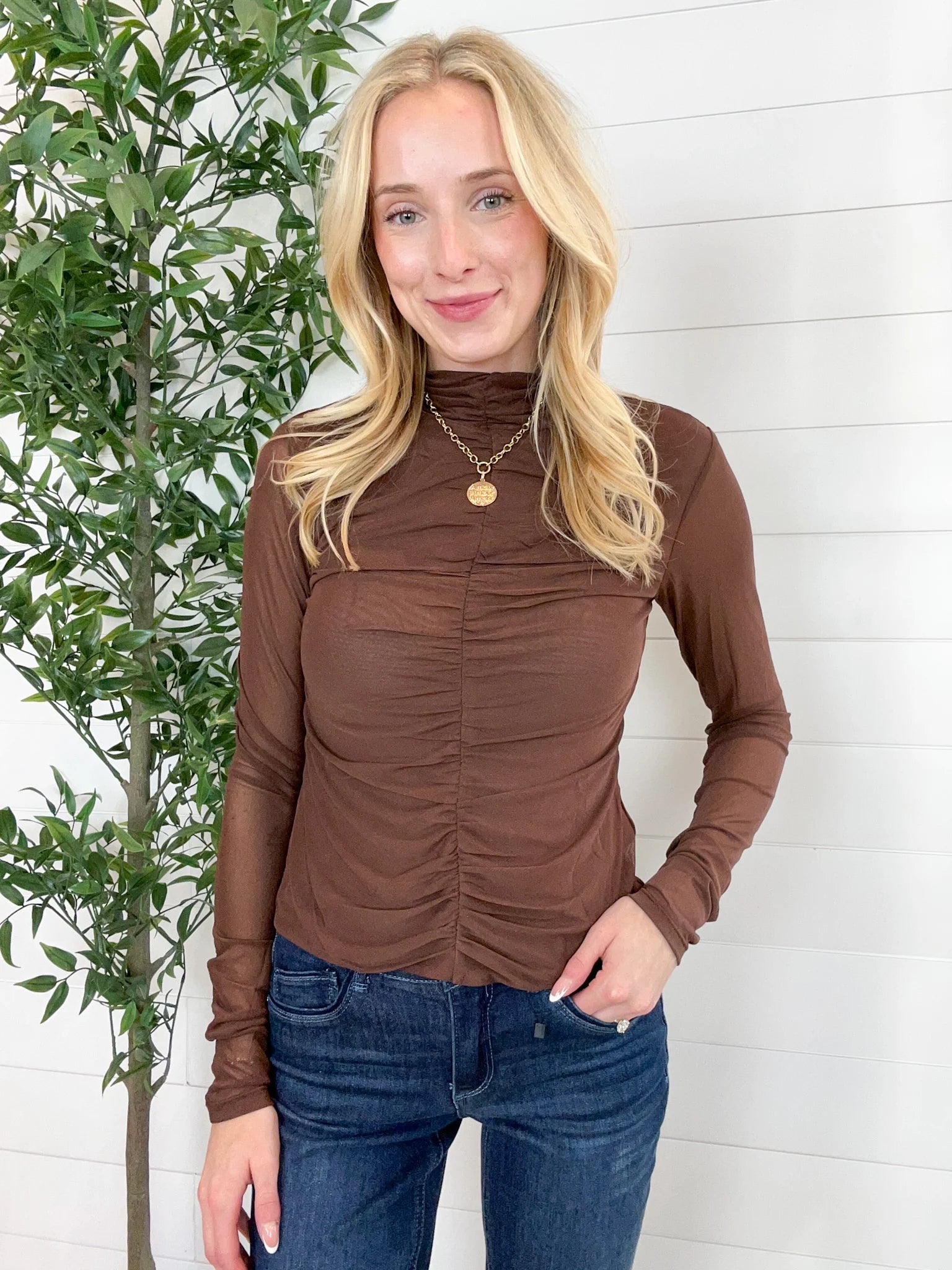 Our Mac and Me Ruched Front Mesh Top is that perfect mix of edgy and elegant. With its ruched detailing down both the front and back, this fitted mesh top adds texture, shape, and just the right amount of drama. The mock neckline gives it a polished touch, while the sheer long sleeves keep things flirty and fun.