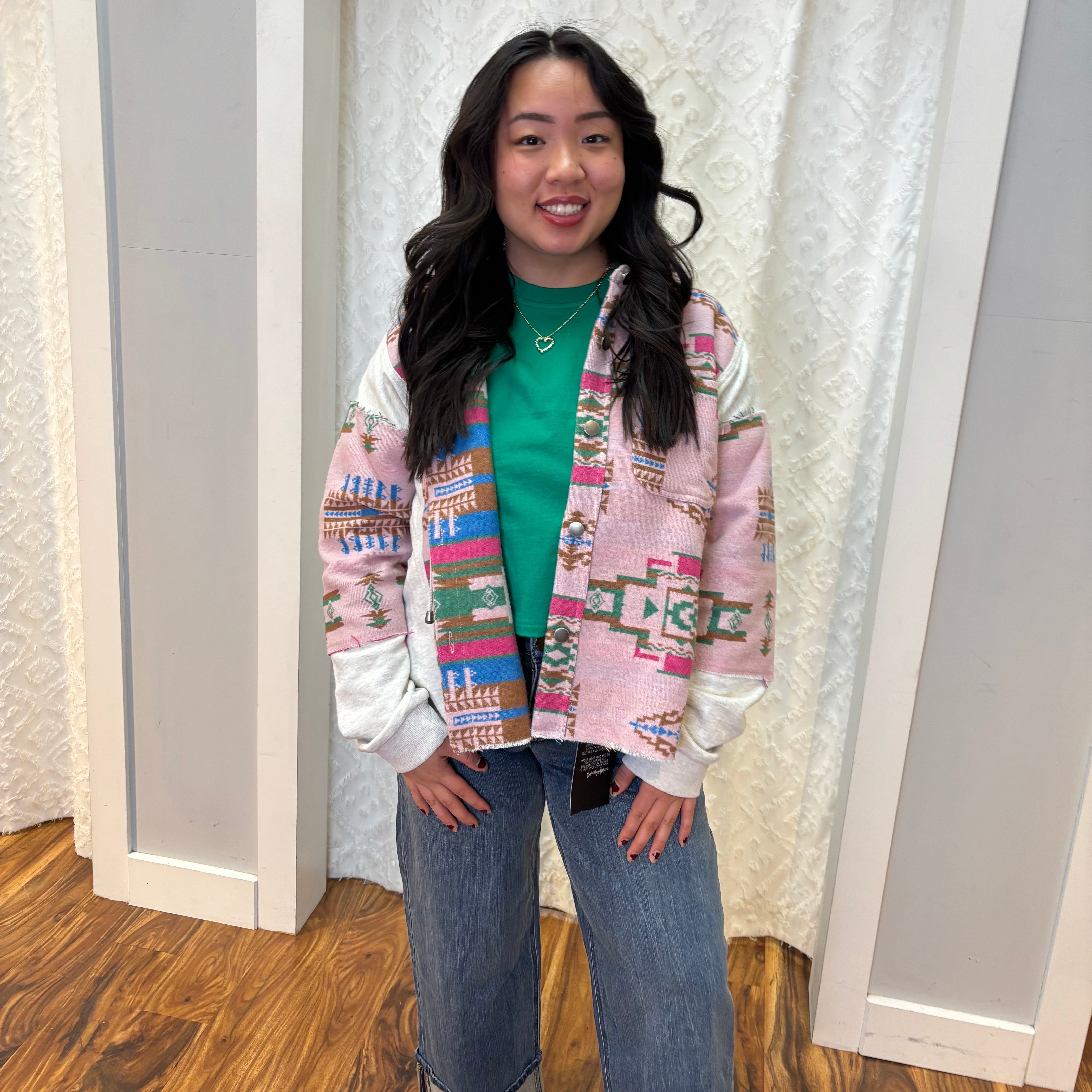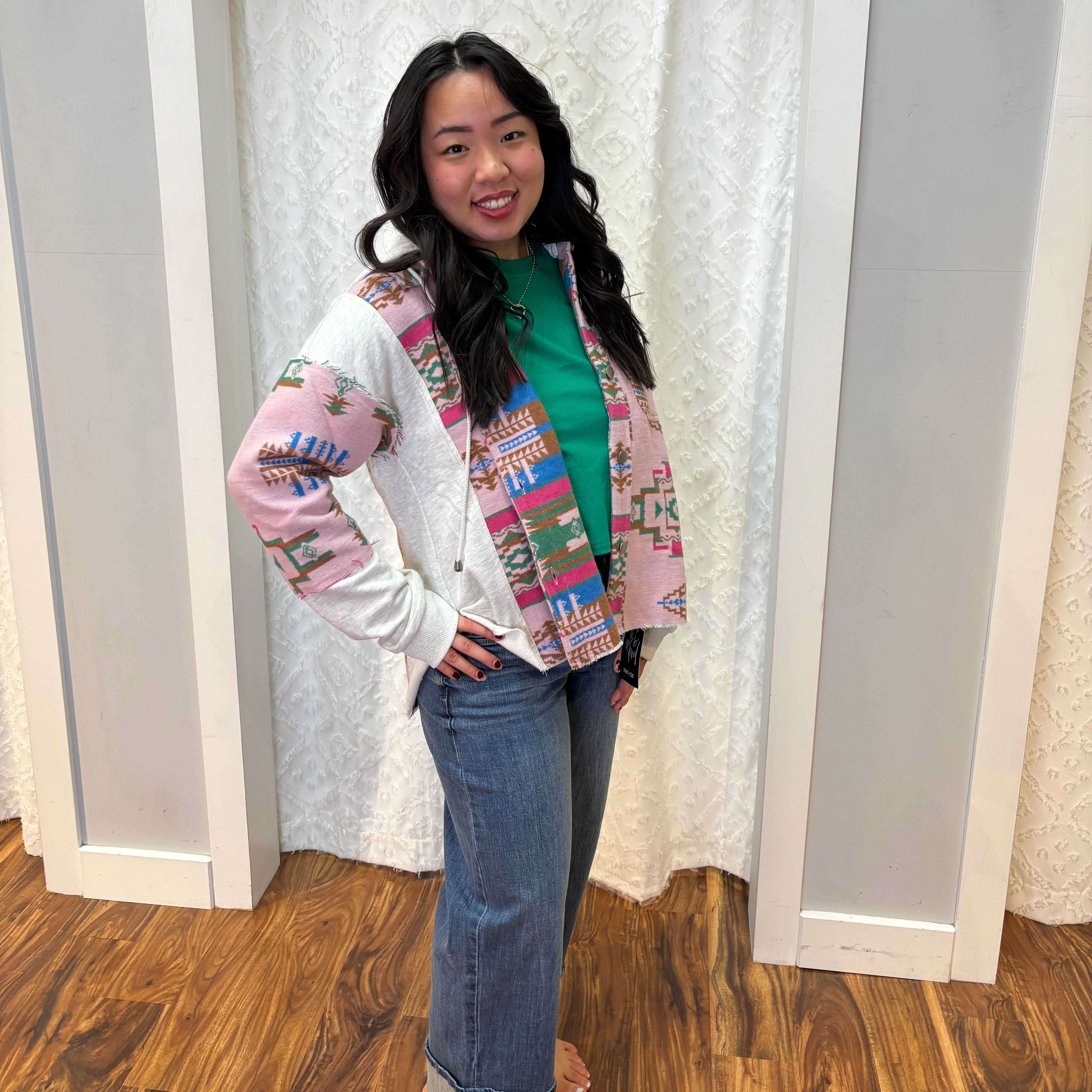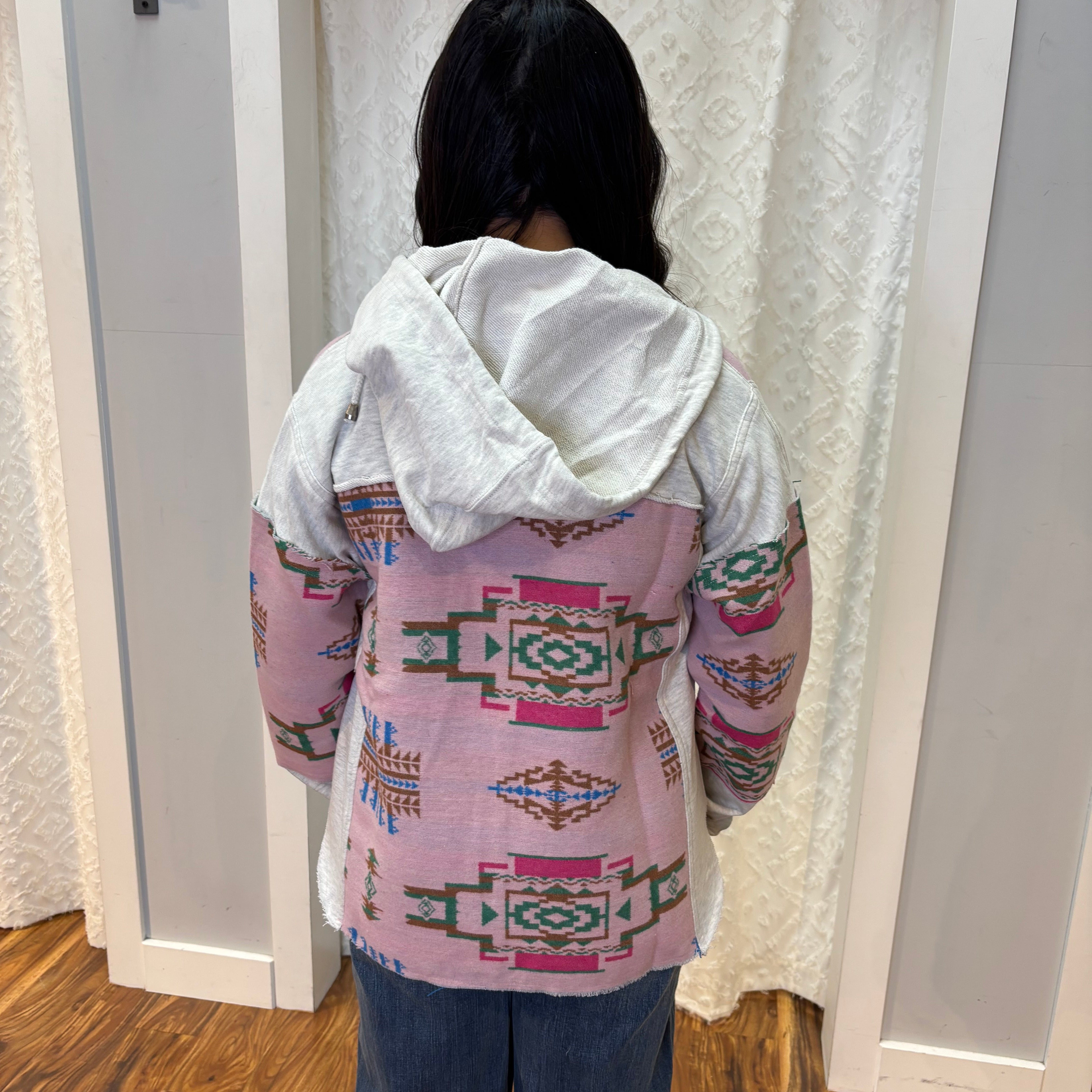 Statement style meets everyday function in this mixed media Aztec print jacket. Designed with eye-catching texture contrast, it features a removable, button-out hood for versatile wear and an elevated layered look. The bold Aztec pattern adds personality, while the structured-yet-comfortable fabrication makes it an easy standout piece for casual days or styled-up moments.