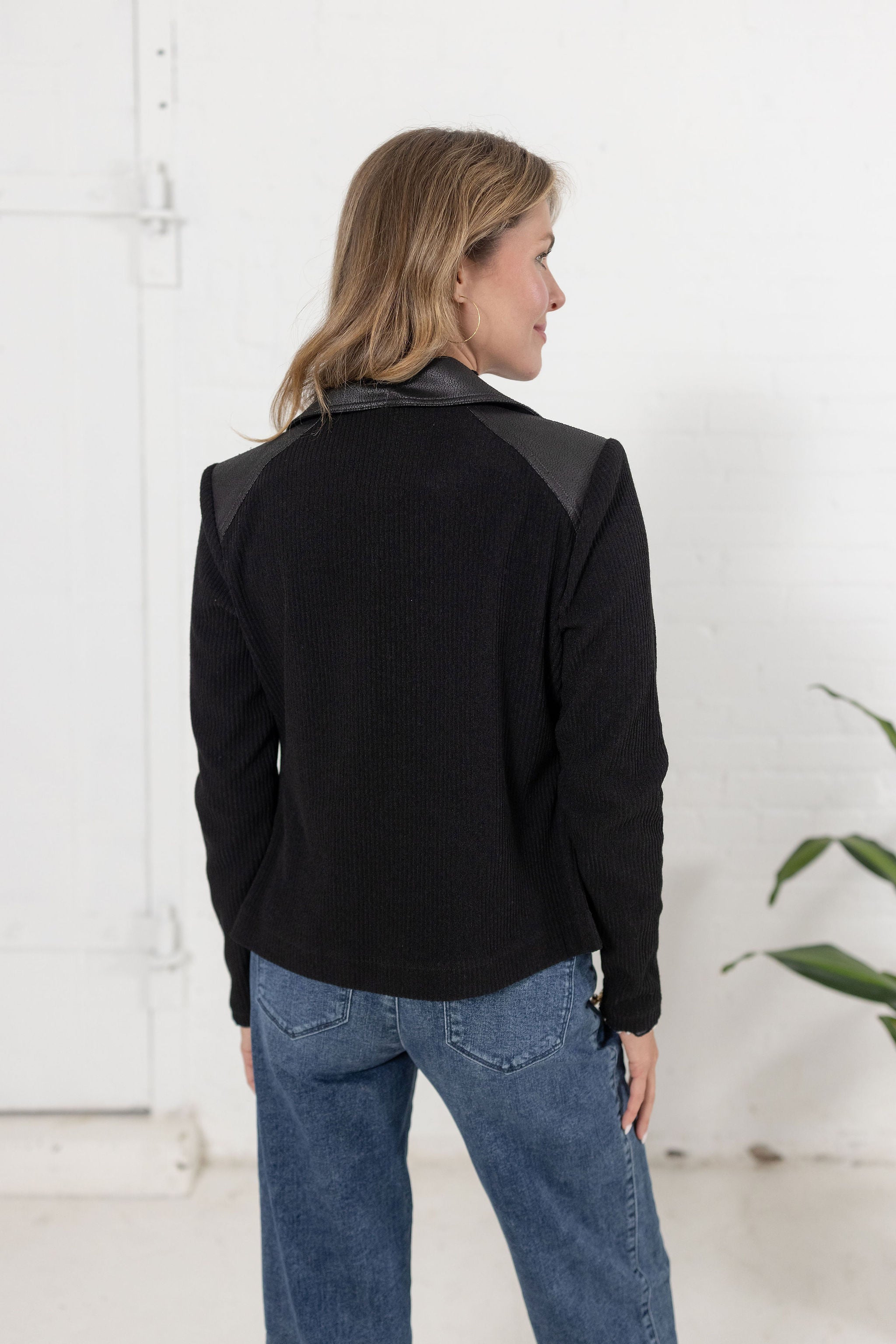 Get the best of both worlds with this sweater-meets-moto jacket hybrid! Soft stretch knit meets sleek vegan leather with zipper detailing along the lapel and placket, plus zippered faux pockets for a cool, effortless vibe. A single hook-and-eye closure keeps it streamlined.