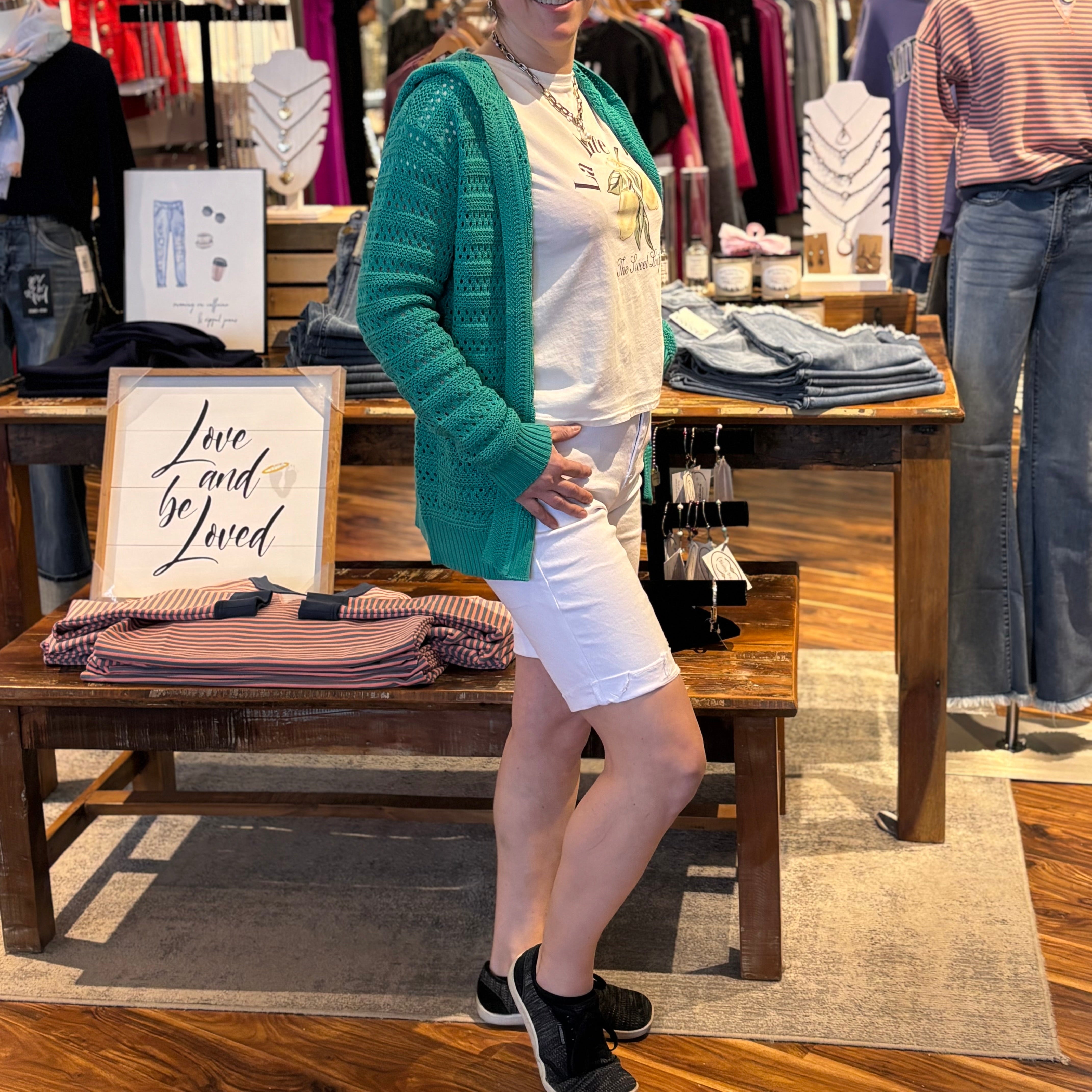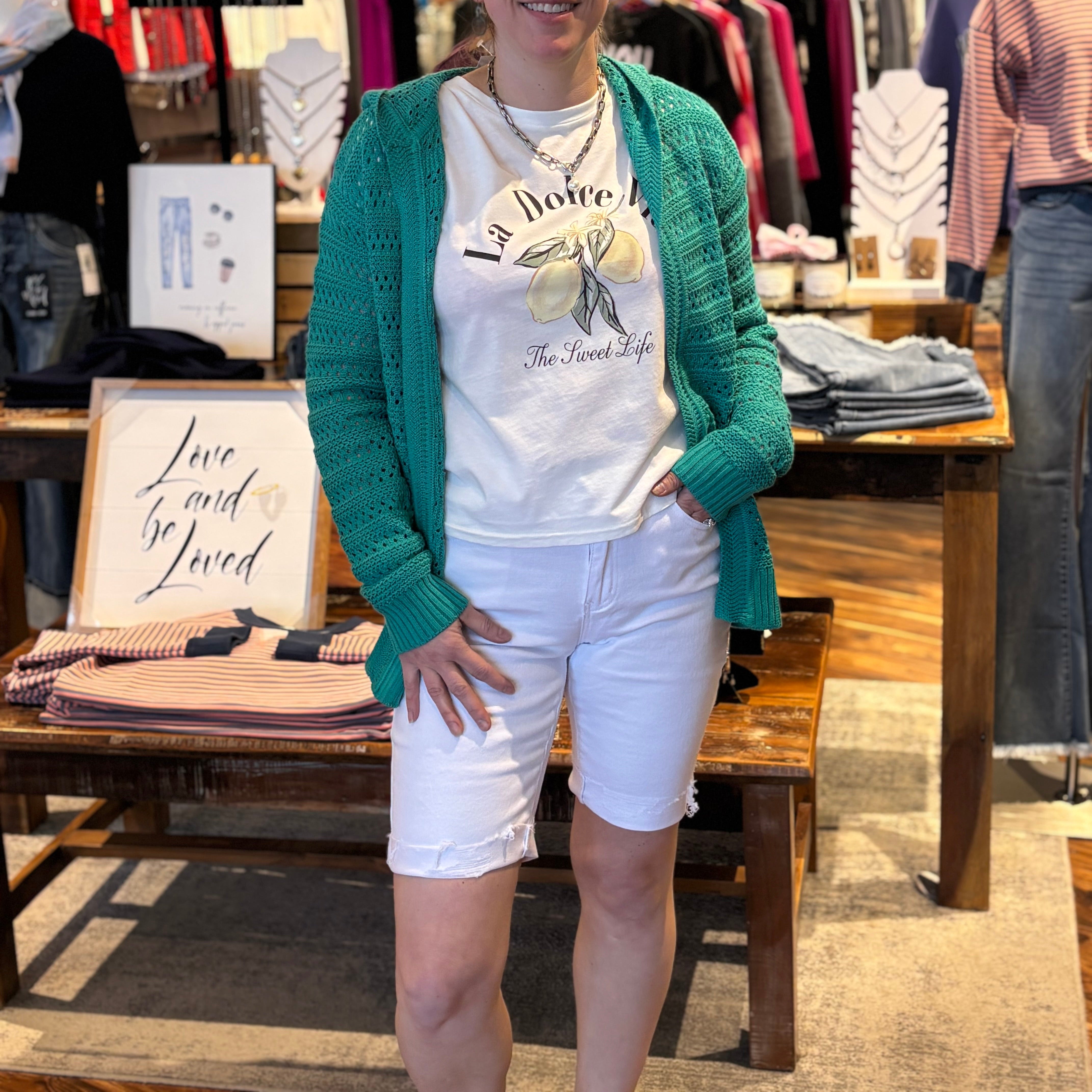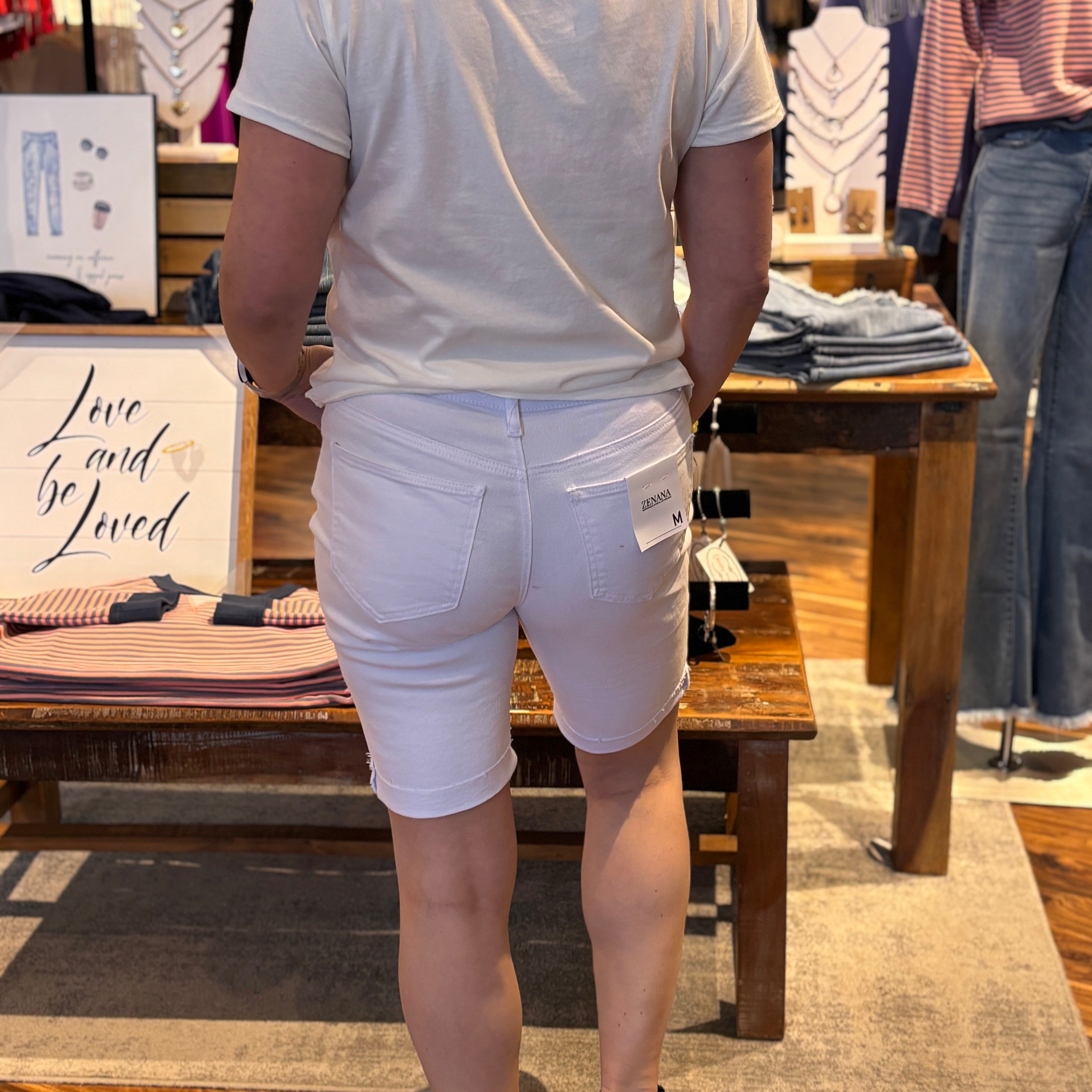 A fresh, warm-weather staple with a subtle twist. These white denim Bermuda shorts feature a flattering longer length with a cuffed hem and light distressing along the cuff for a touch of laid-back edge. Crafted from a cotton-rich stretch blend, they offer comfort, structure, and easy everyday wear.