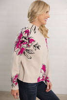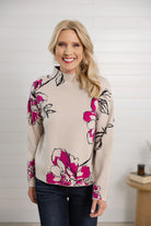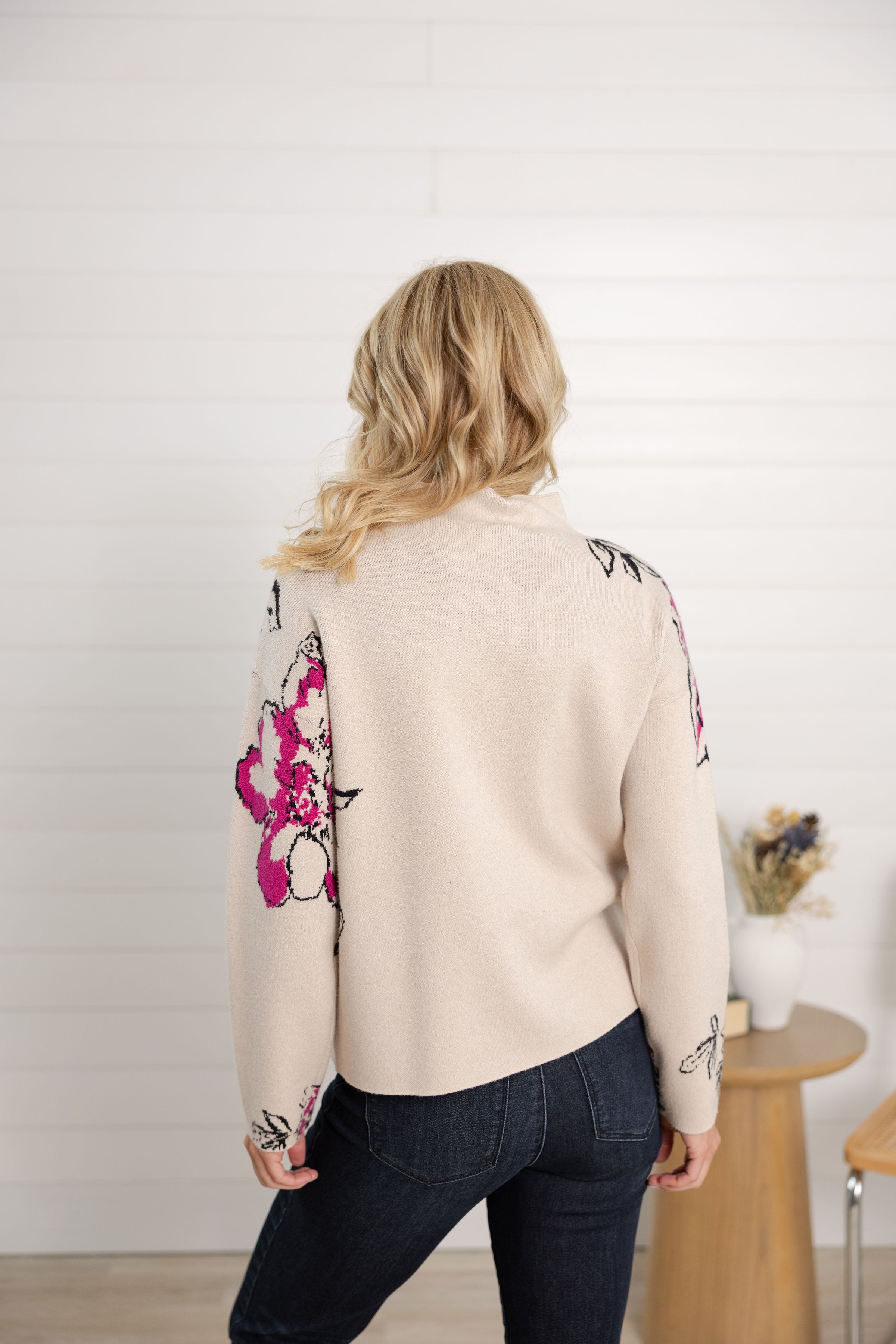 Bring a playful pop of color to your wardrobe with the MB Floral Sketch Funnel Neck Sweater. Featuring hot pink accents on delicate black sketched flowers set against a soft beige background, this sweater blends artistic charm with everyday wearability. The cozy funnel neckline and long sleeves make it perfect for layering or wearing solo for a statement look.