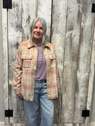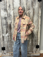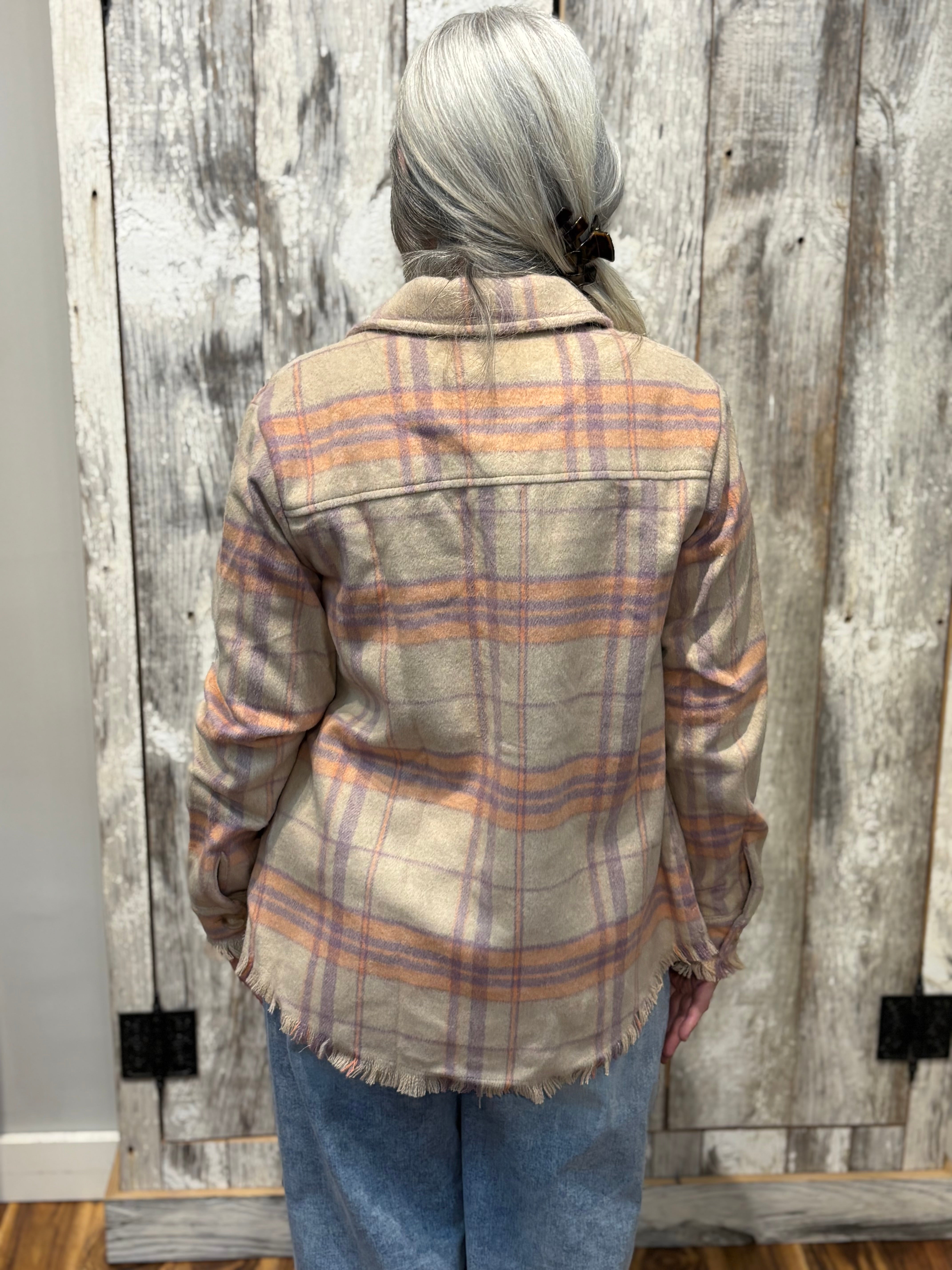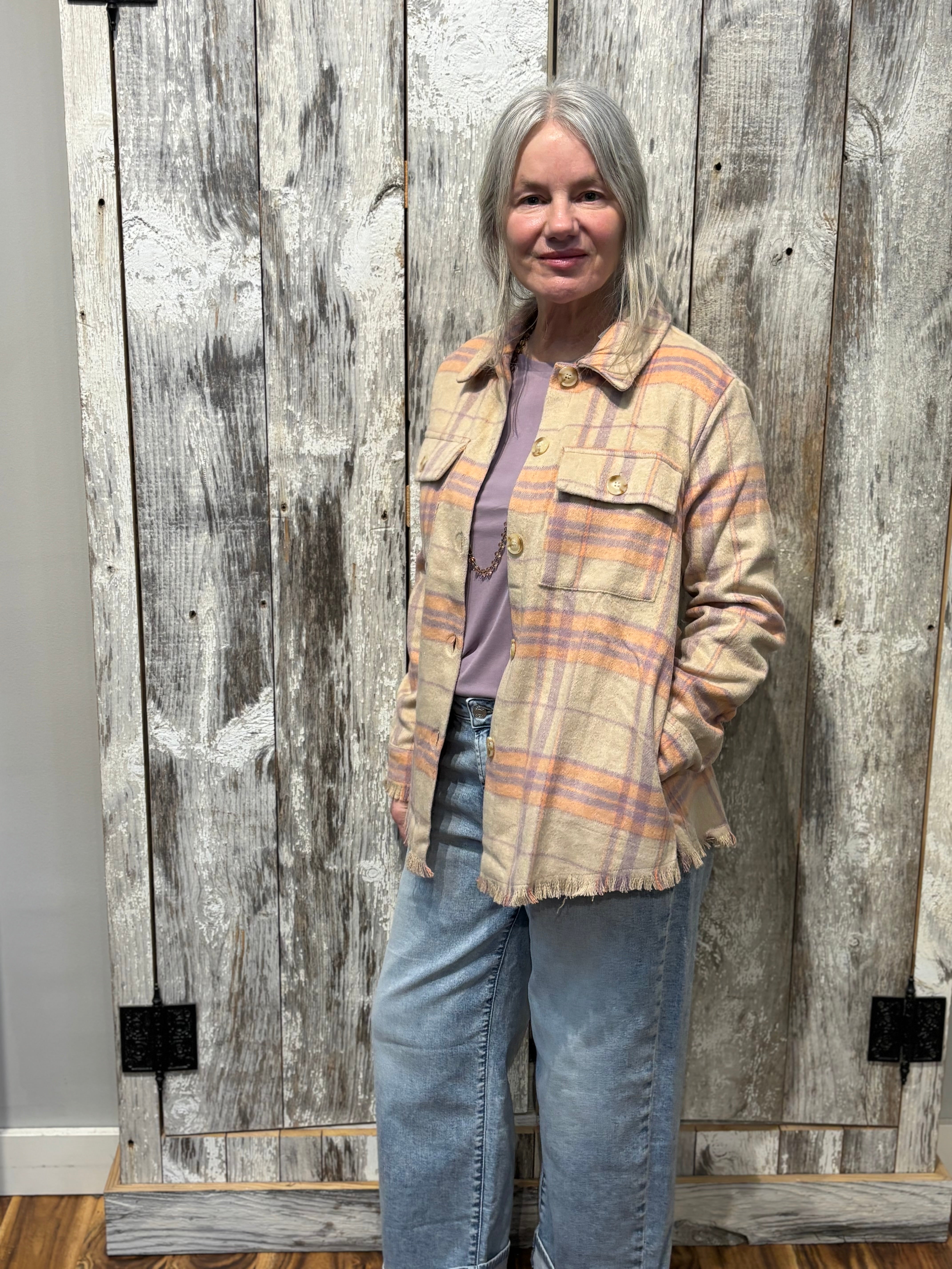 A fresh spring take on a classic layer. This plaid jacket features soft fringe detailing for added movement and texture, paired with light, spring-ready colors that brighten any outfit. Designed with a polished yet relaxed feel, it’s the perfect lightweight jacket to throw on over tees, dresses, or knits for an effortless seasonal upgrade.