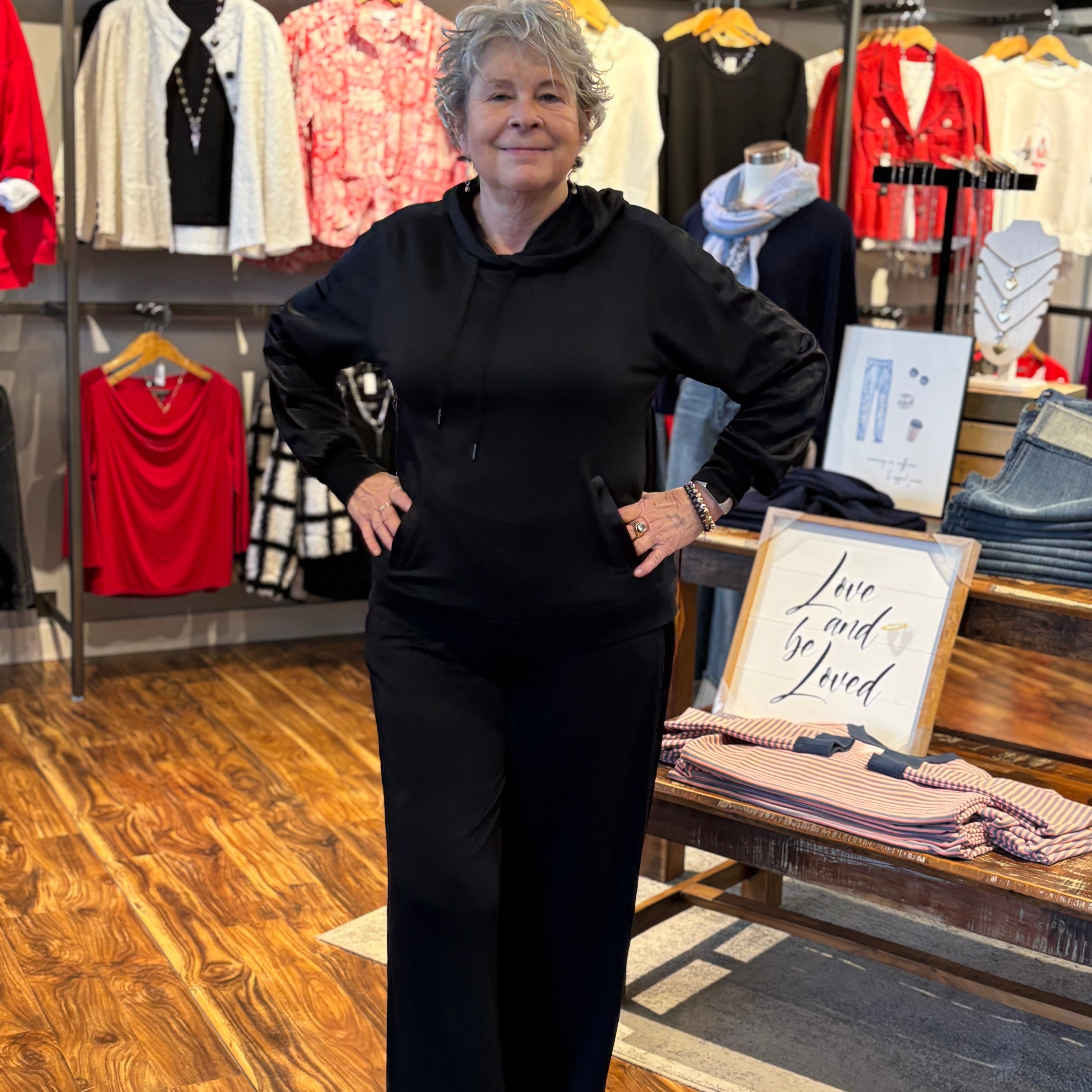 An elevated take on everyday comfort, this hoodie is crafted from ultra-soft Feather Fleece—lightweight, breathable, and brushed on the inside for a cloud-like feel. Tonal satin trim along the sleeves and pockets adds a refined touch of sheen, blending cozy lounge vibes with polished style. Finished with a relaxed fit, adjustable drawstring hood, and ribbed cuffs and hem, it’s the perfect piece for effortless, put-together comfort.