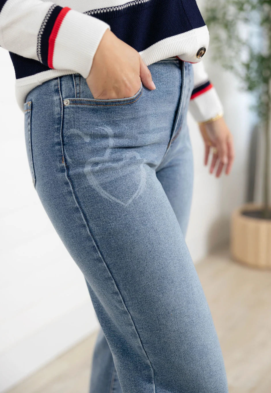 The MB Bleached Heart Print Sophia Straight Leg is where standout style meets feel-good fit. Crafted from premium stretch denim, this pair features a super straight leg silhouette that feels modern and flattering, while still hugging in all the right places. The bleached heart print adds a playful, elevated twist that sets these jeans apart without feeling over-the-top. Designed for comfort, flexibility, and shape retention, they’re made to look great from morning to night.