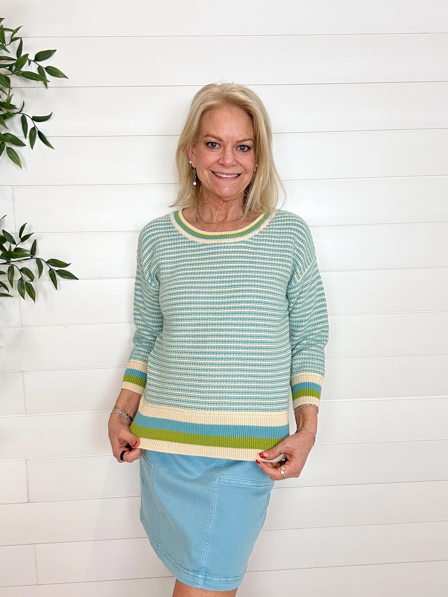 The MB Stripe Weave Scoop Neck Sweater is a beautifully balanced take on classic stripes. Crafted from breathable 100% cotton, this sweater features a subtly textured striped weave throughout the body, pulling together the same hues highlighted at the neckline, cuffs, and hem for a cohesive, elevated look. The scoop neckline feels soft and flattering, while the ¾-length sleeves keep it easy and versatile. Polished yet relaxed, it’s a wear-anywhere knit you’ll reach for again and again.