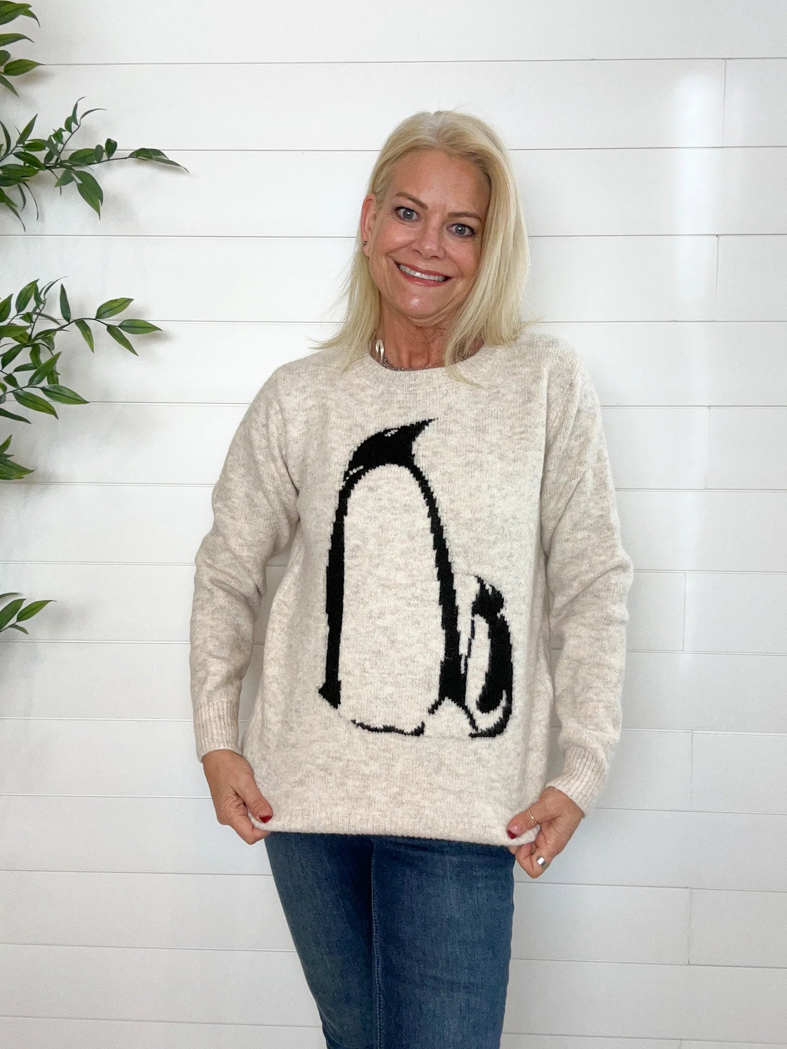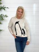 The Penguin Intarsia Pullover brings a touch of winter whimsy to your wardrobe. Featuring an adorable parent-and-baby penguin design on the front, this soft knit sweater is a sweet nod to the cozy season (and the trending animal motif look!). With its classic crew neckline and relaxed fit, it’s just as perfect for festive gatherings as it is for cuddling up on chilly days.
