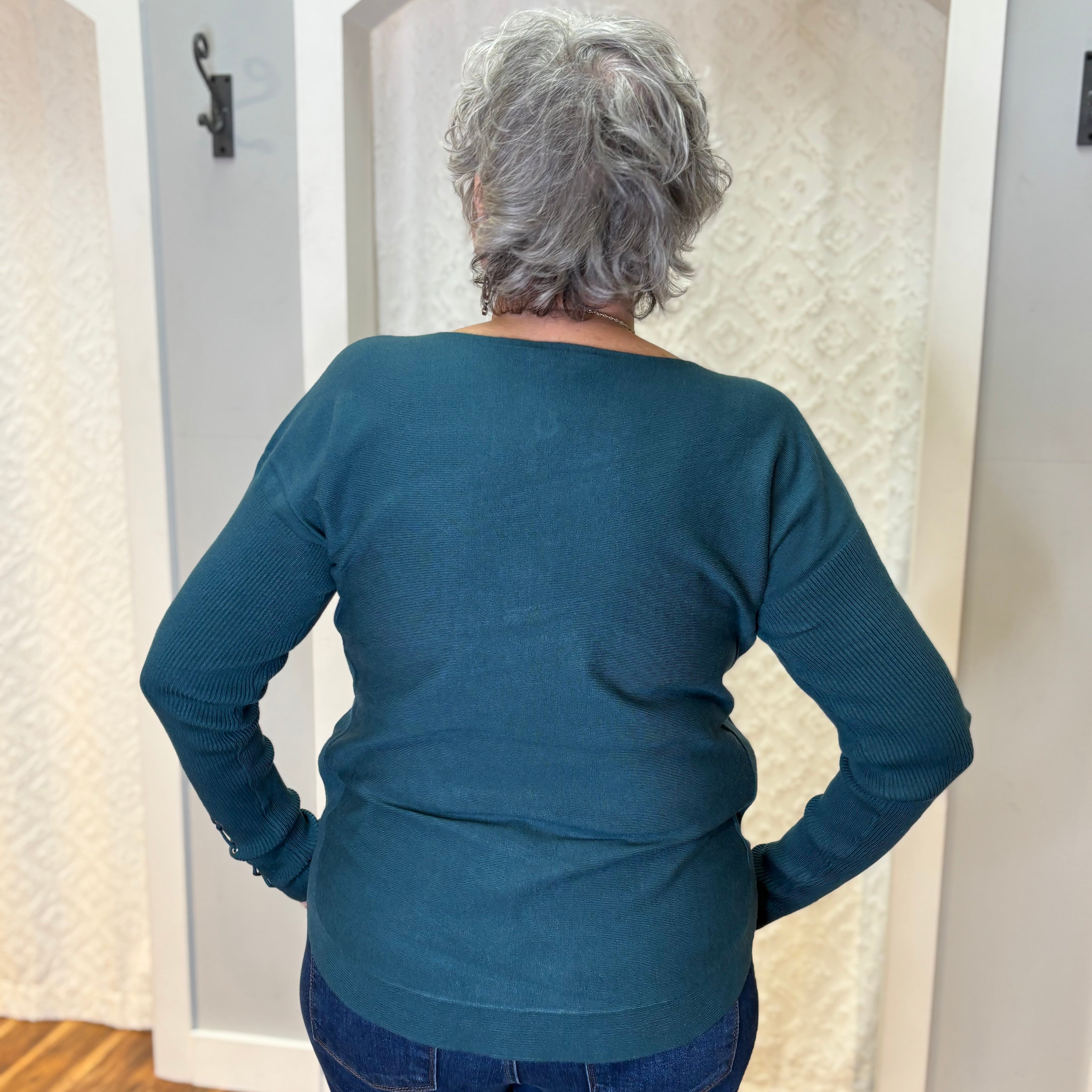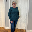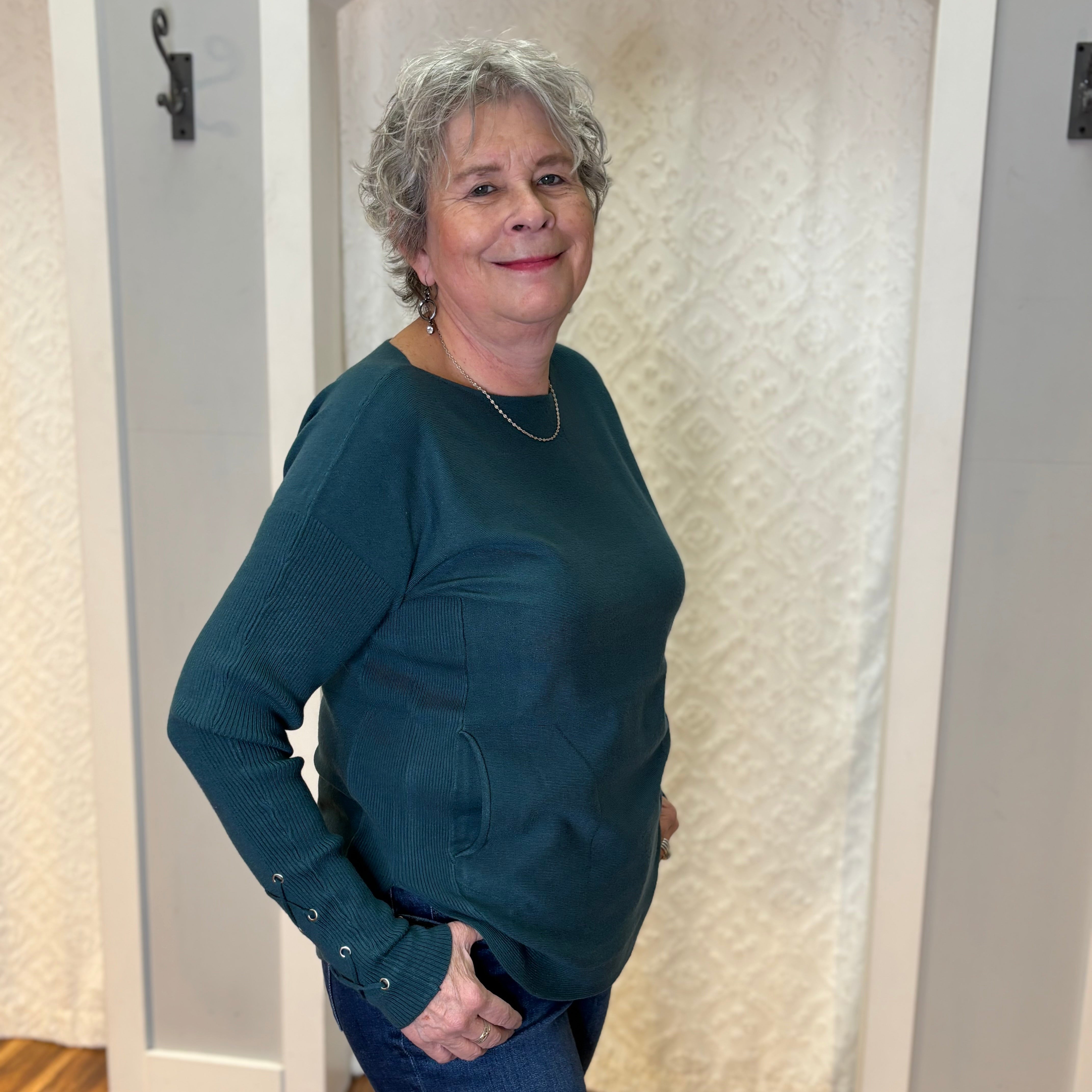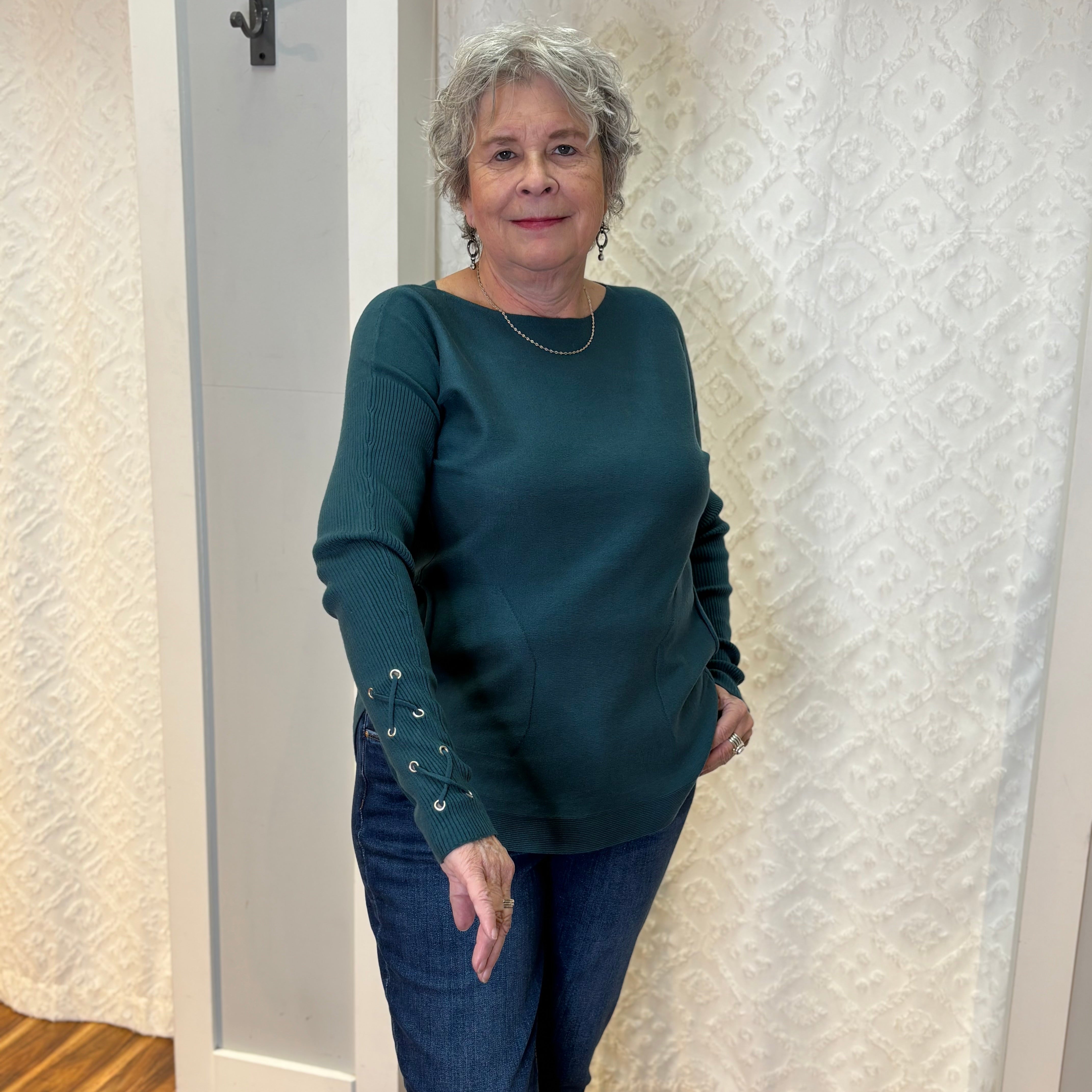 Step into winter in style with this Round Hem Sweater in a rich, perfect winter teal. A customer favorite, it features flattering side ribbing and a rounded hem that drapes beautifully, while functional pockets add everyday convenience. The standout sleeve lacing adds a playful, fashion-forward detail, making this sweater as stylish as it is cozy.