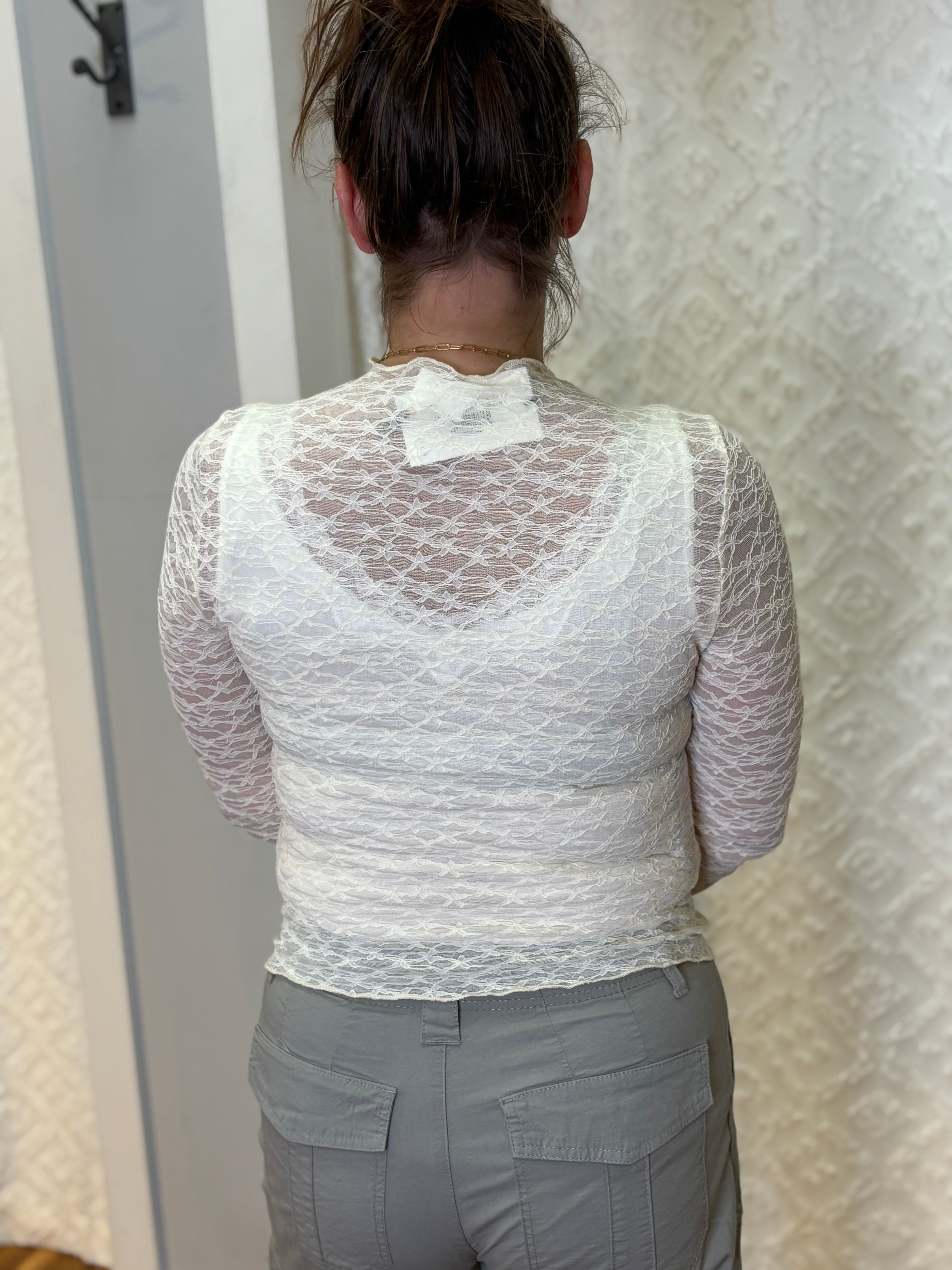 Crafted from soft, lightweight 100% polyester lace, it layers beautifully—ideal under blazers, cardigans, graphic tees, or vests for a chic, textured finish. The sheer design adds just the right touch of sophistication to both casual and dressy looks.