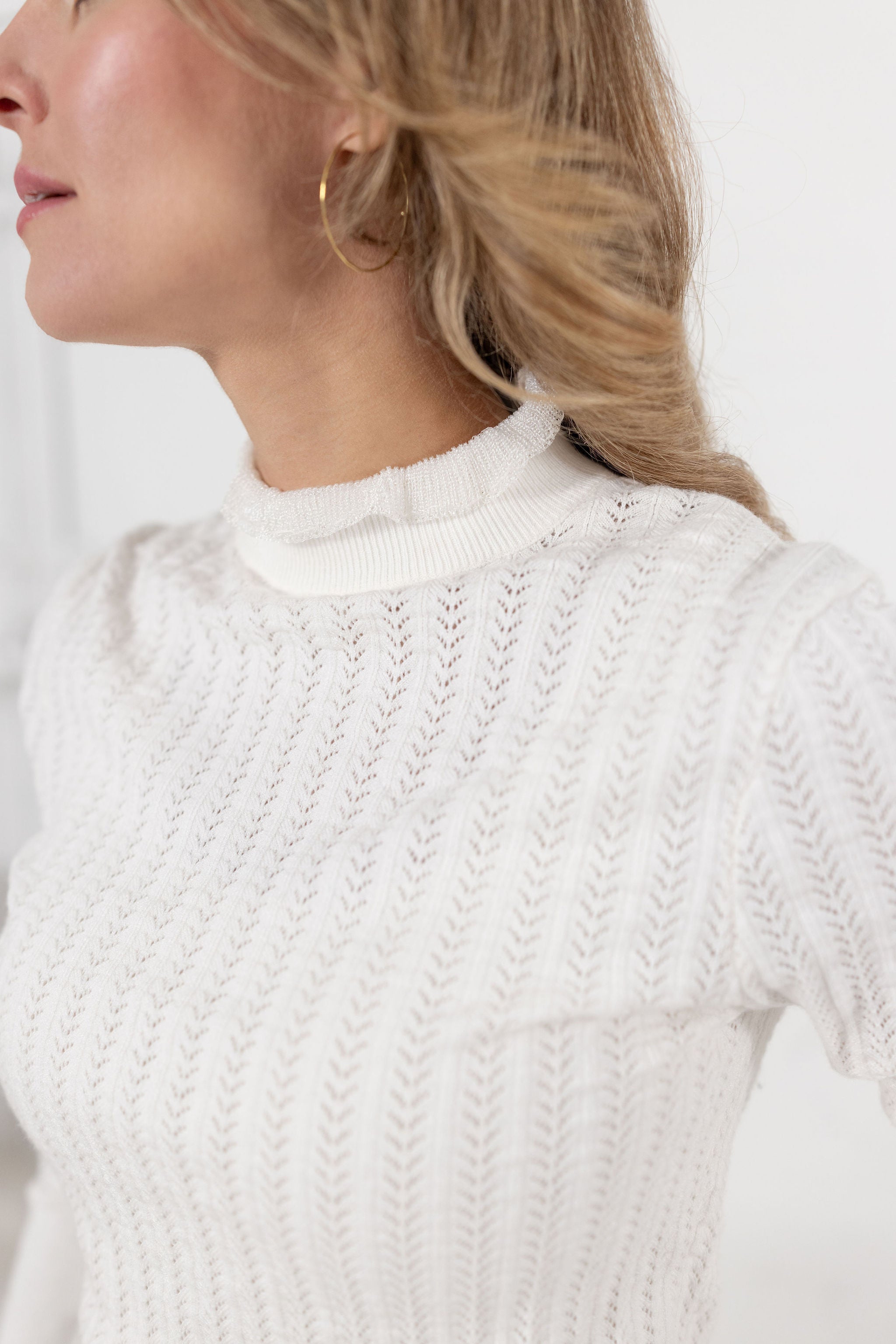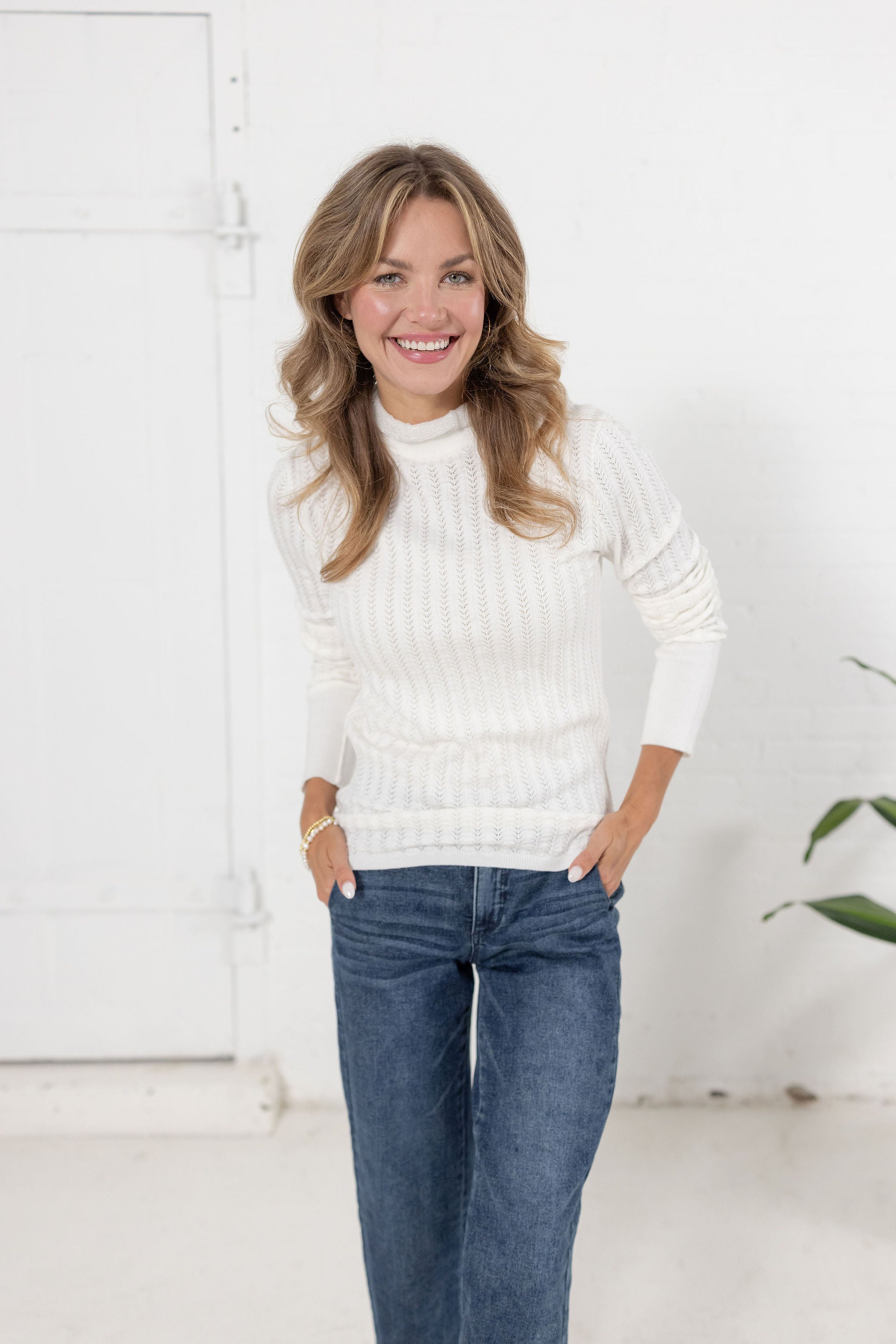 The Ruffled Mock Neck Pointelle Sweater combines feminine charm with refined detail. Crafted from a delicate, lightweight knit, it features an intricate pointelle pattern and a softly ruffled neckline accented with a touch of sequins for understated shimmer. The result is a sweater that feels both timeless and modern—perfect for dressing up your everyday looks with effortless grace.