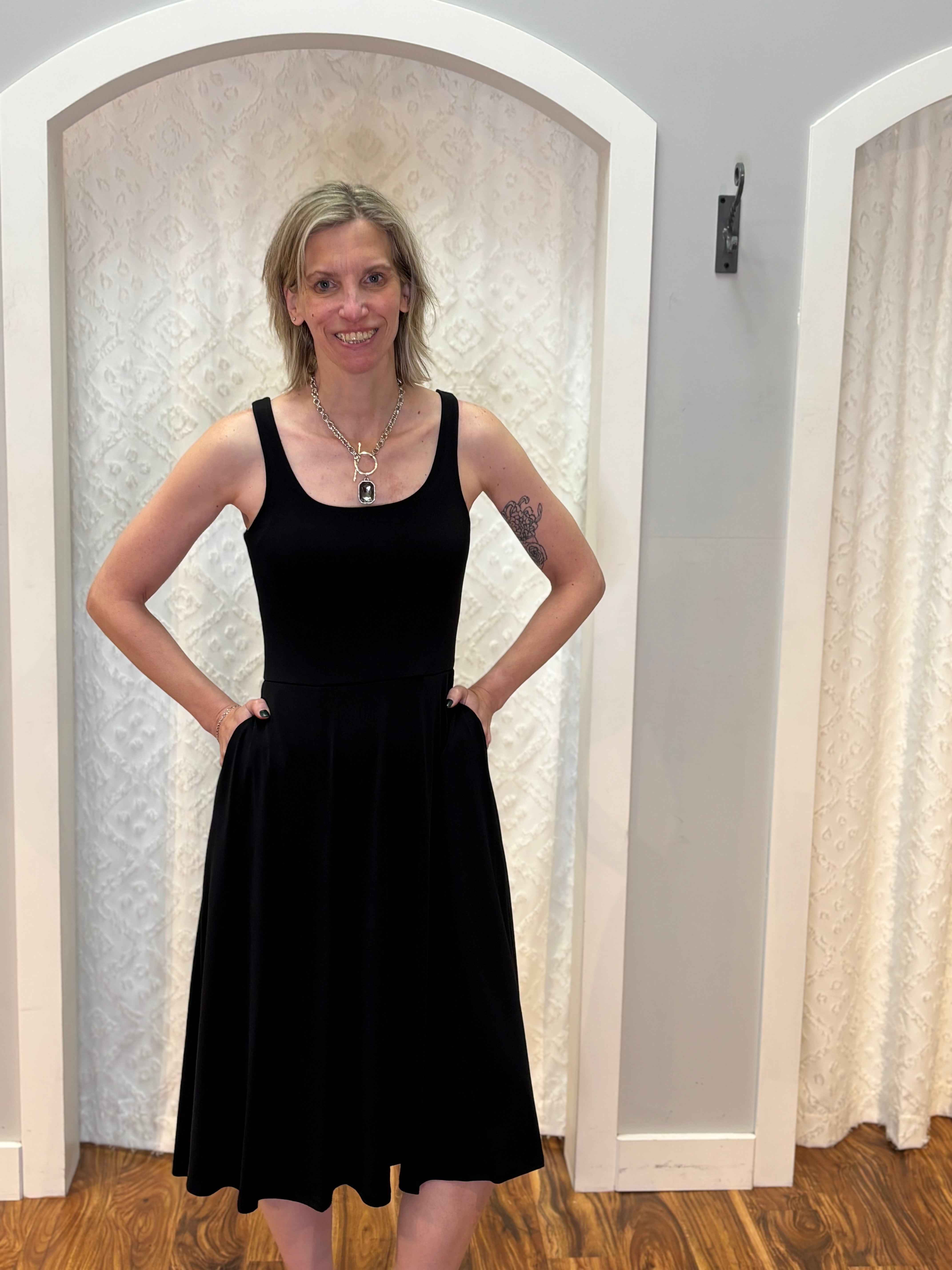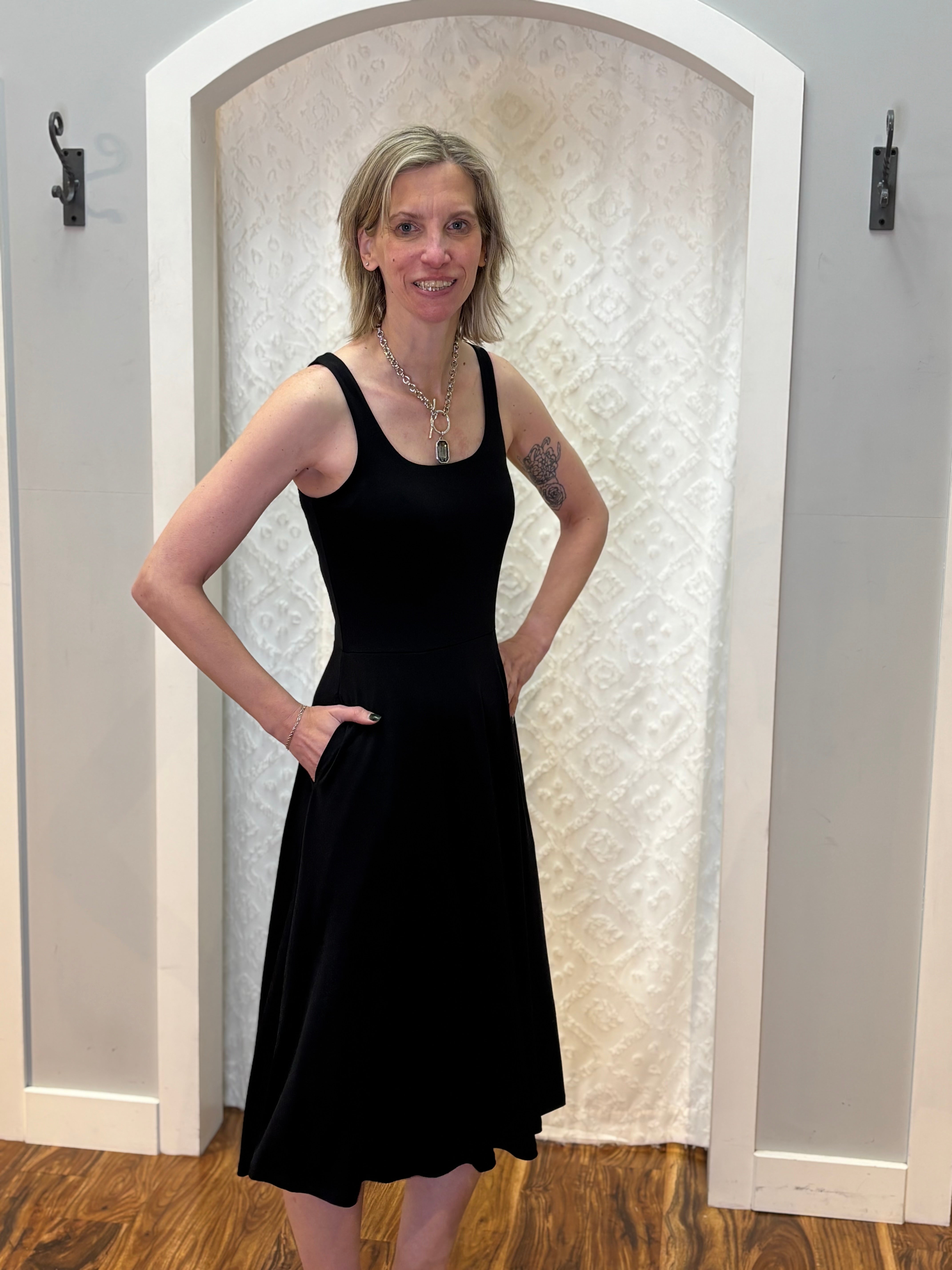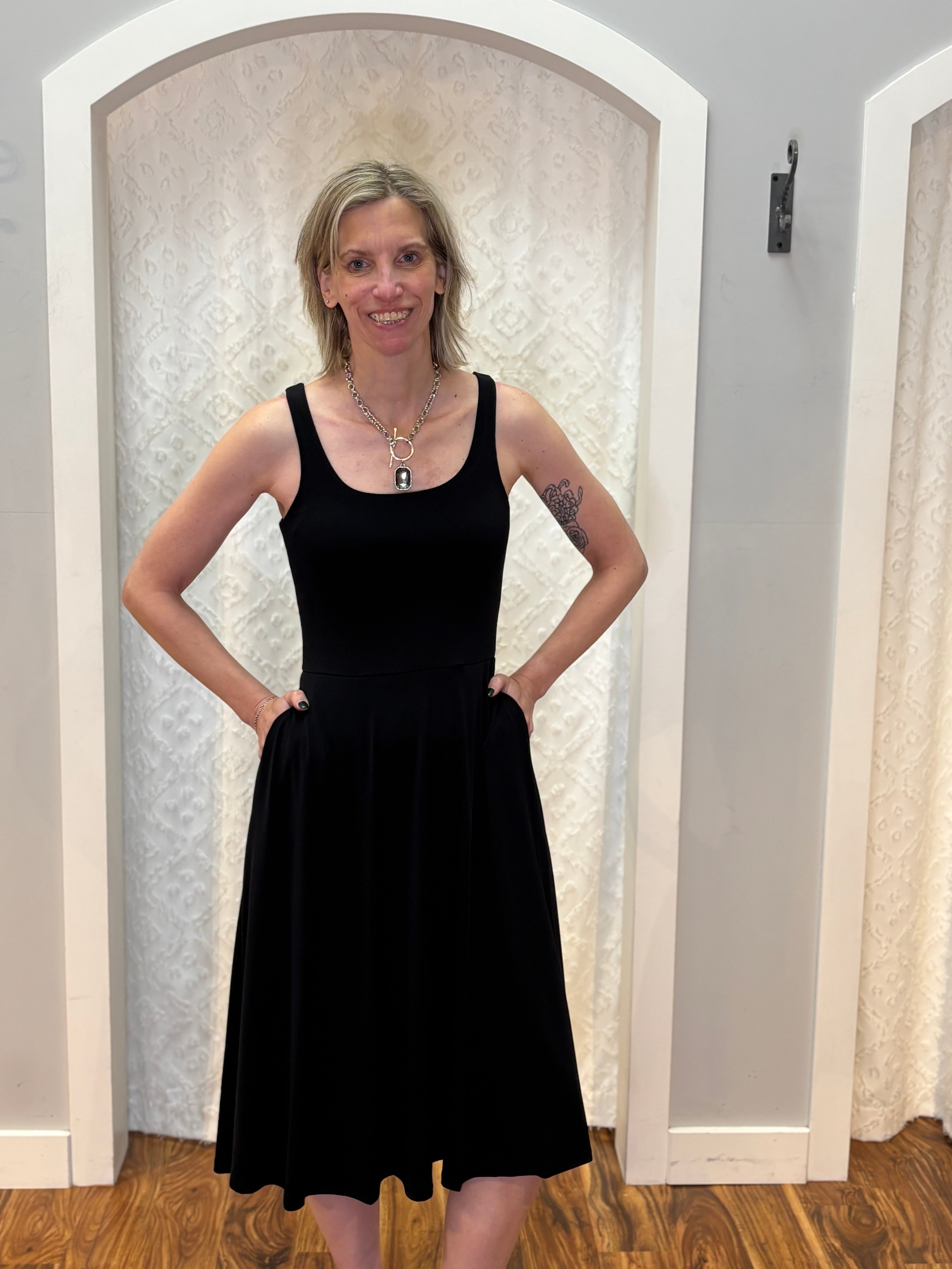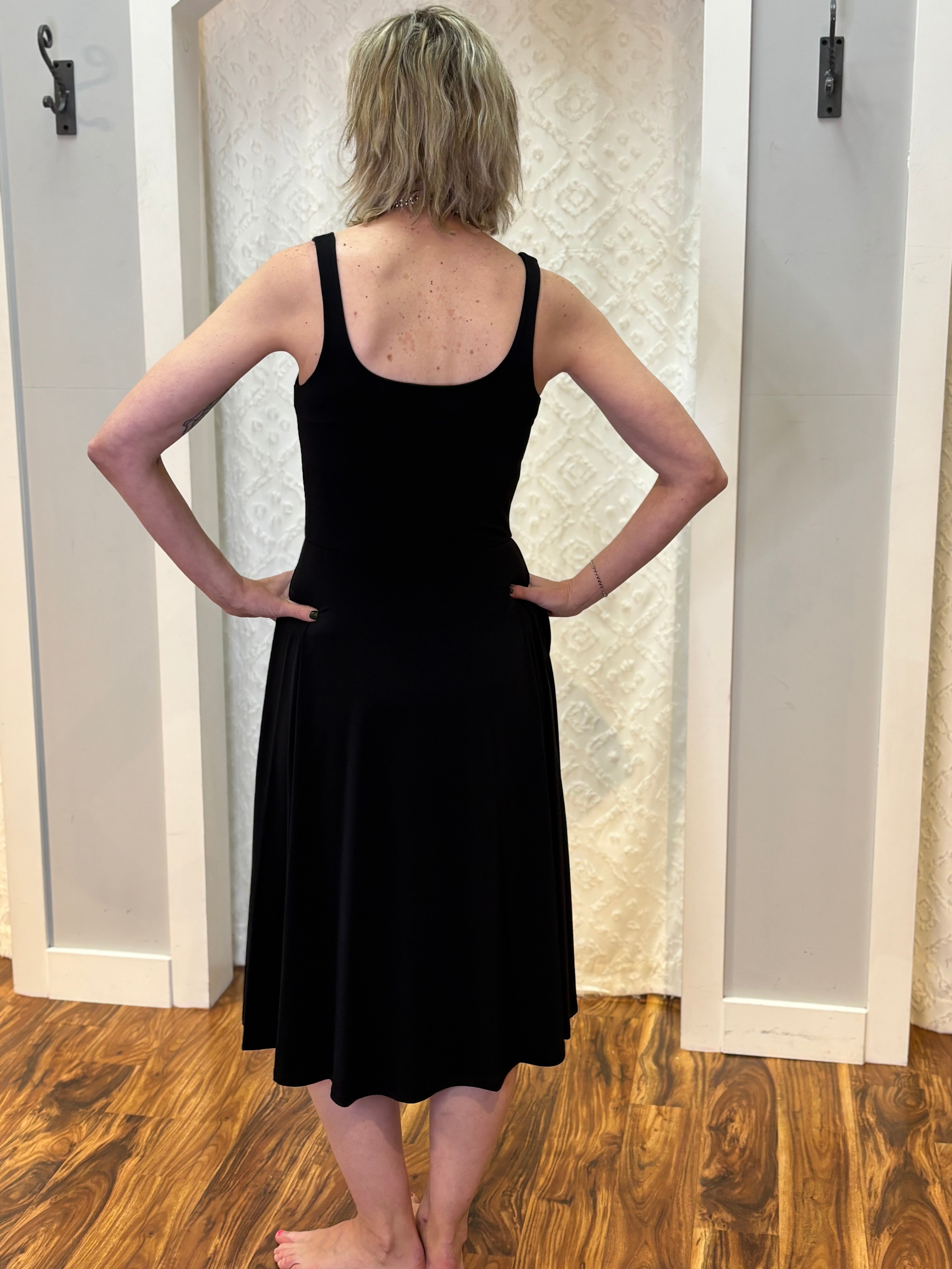 Effortlessly chic and endlessly wearable, this Made in the USA flare midi dress is a true wardrobe staple. Designed in classic black with a flattering flared silhouette, it features bra-friendly tank straps and—yes—pockets (because perfection matters). The soft, stretchy fabric moves with you, making it ideal for everything from casual days to dressed-up evenings.