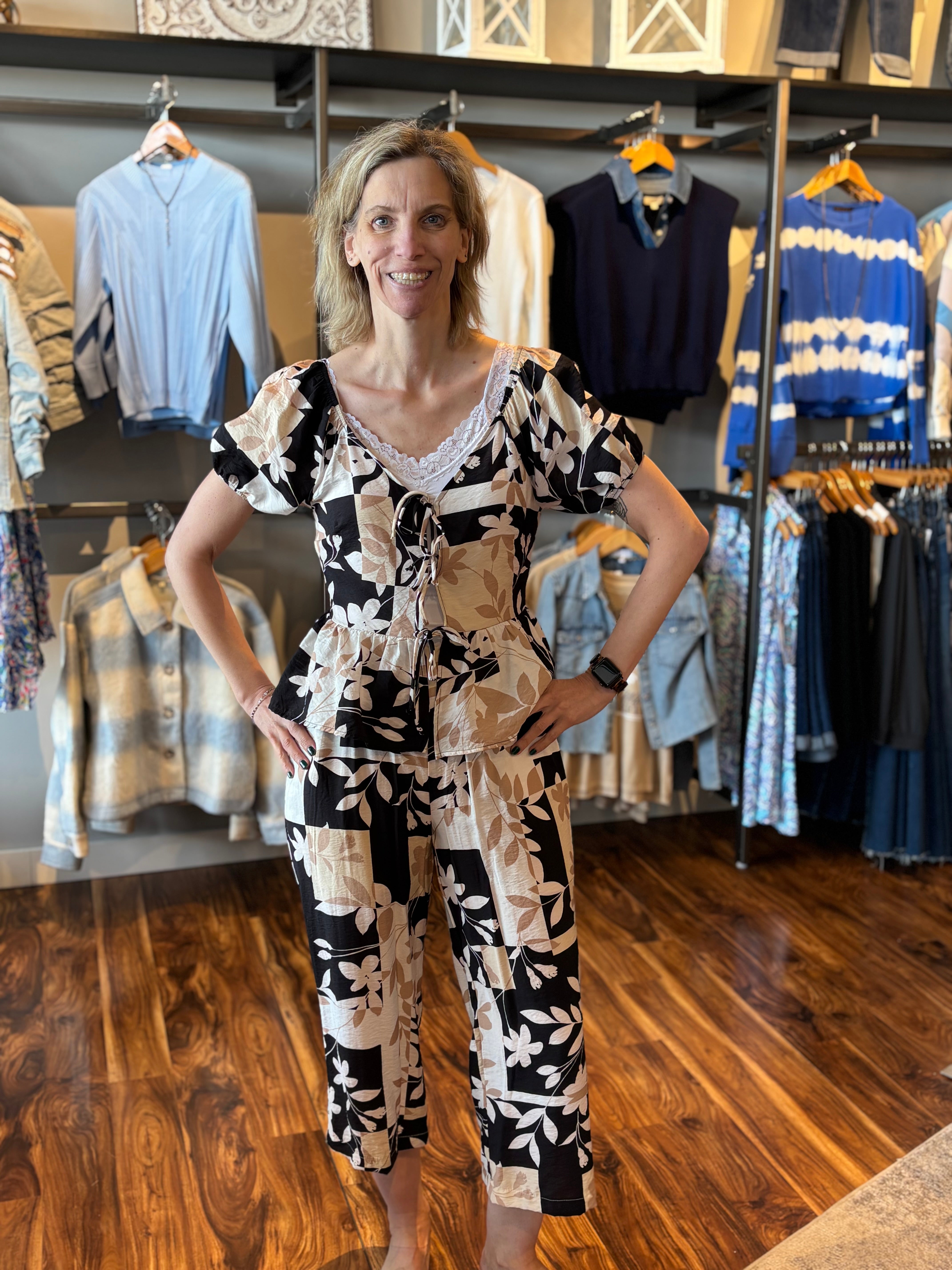 The perfect partner to our printed crop pant, this trendy short sleeve tie-front top brings effortless summer style. Designed in the same versatile black, white, and neutral print, it features stretch along the shoulders so it can be worn traditionally or styled off-the-shoulder for a more relaxed, on-trend look. Lightweight and flattering, it works beautifully as part of the set or styled on its own.