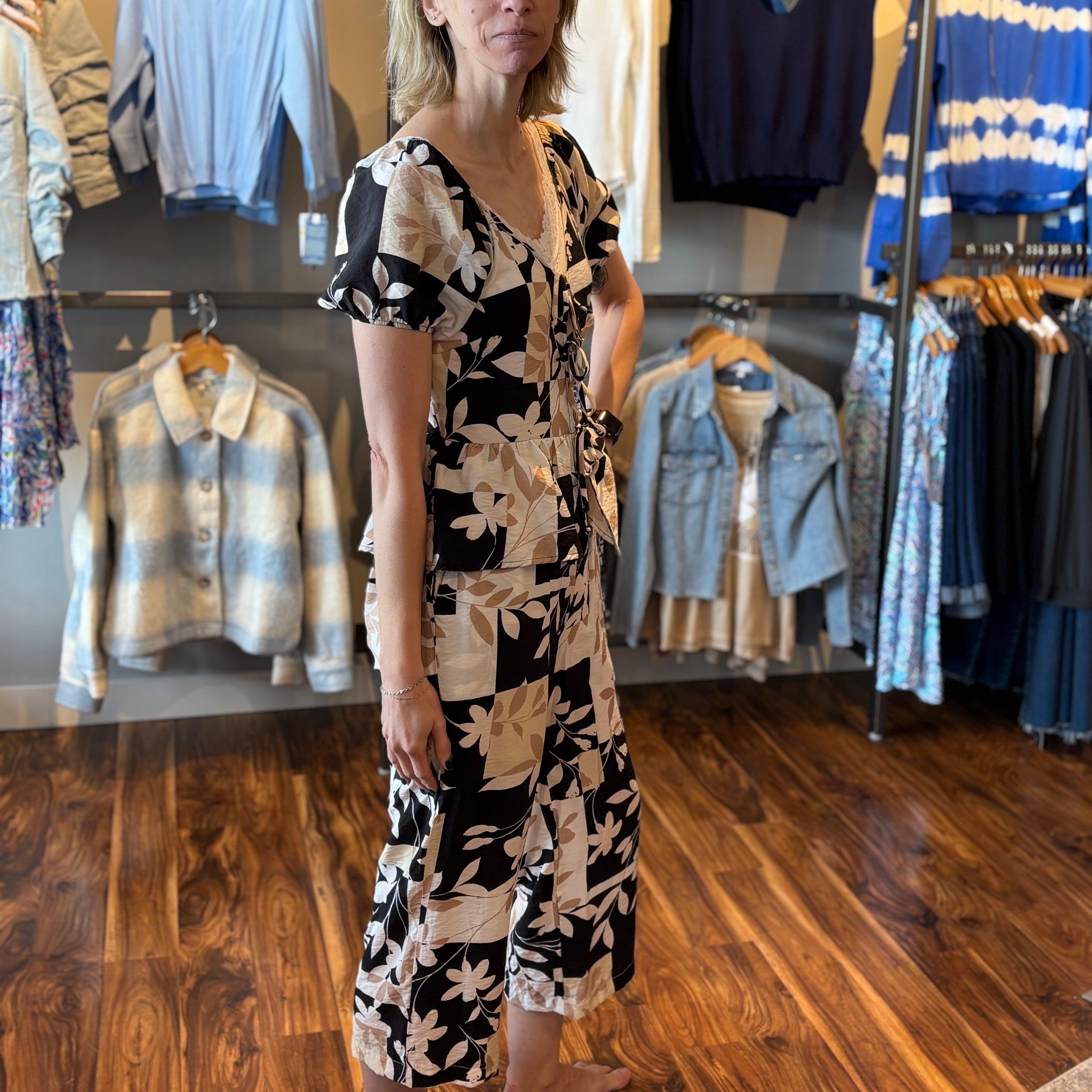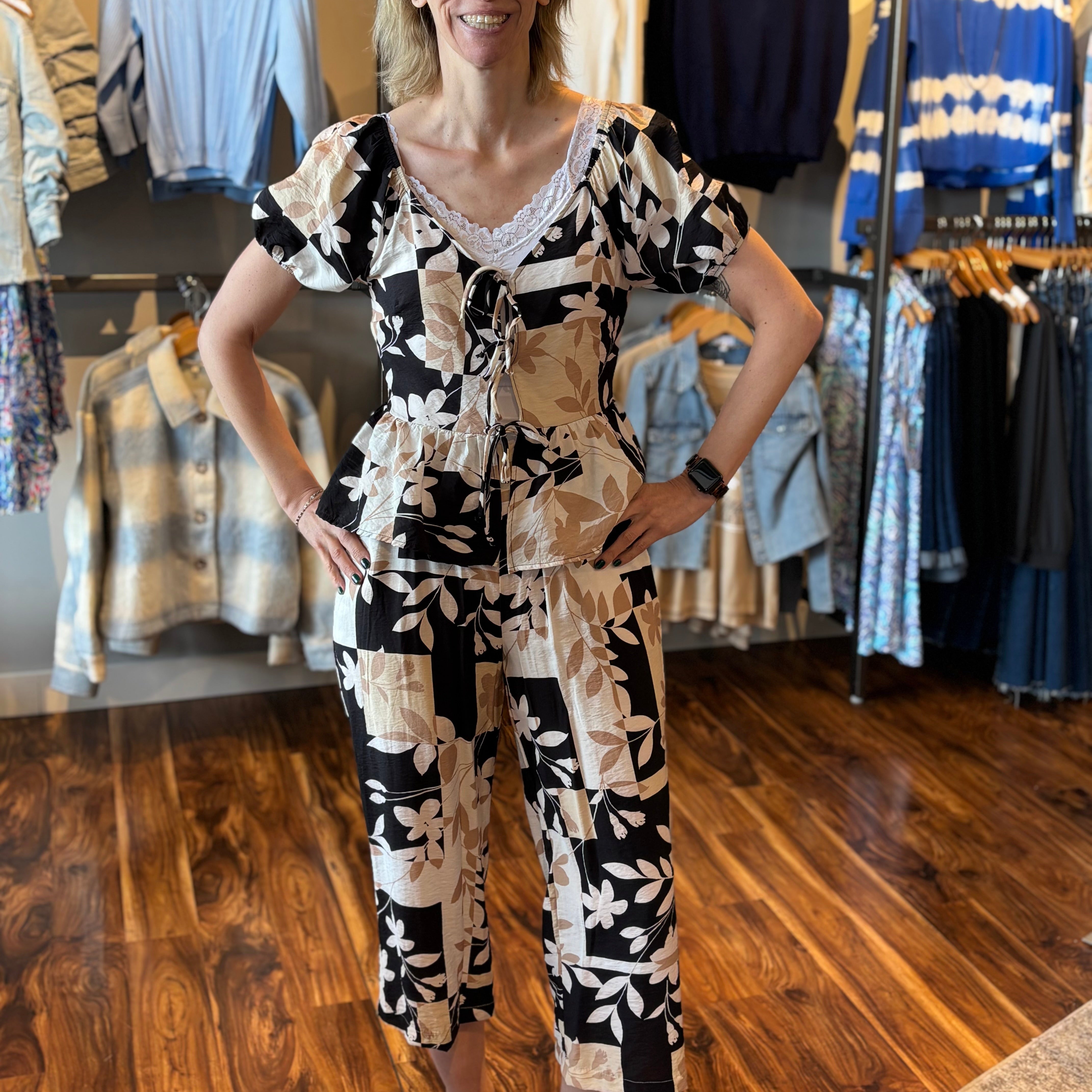 Tropical Block Print Tie Front Top