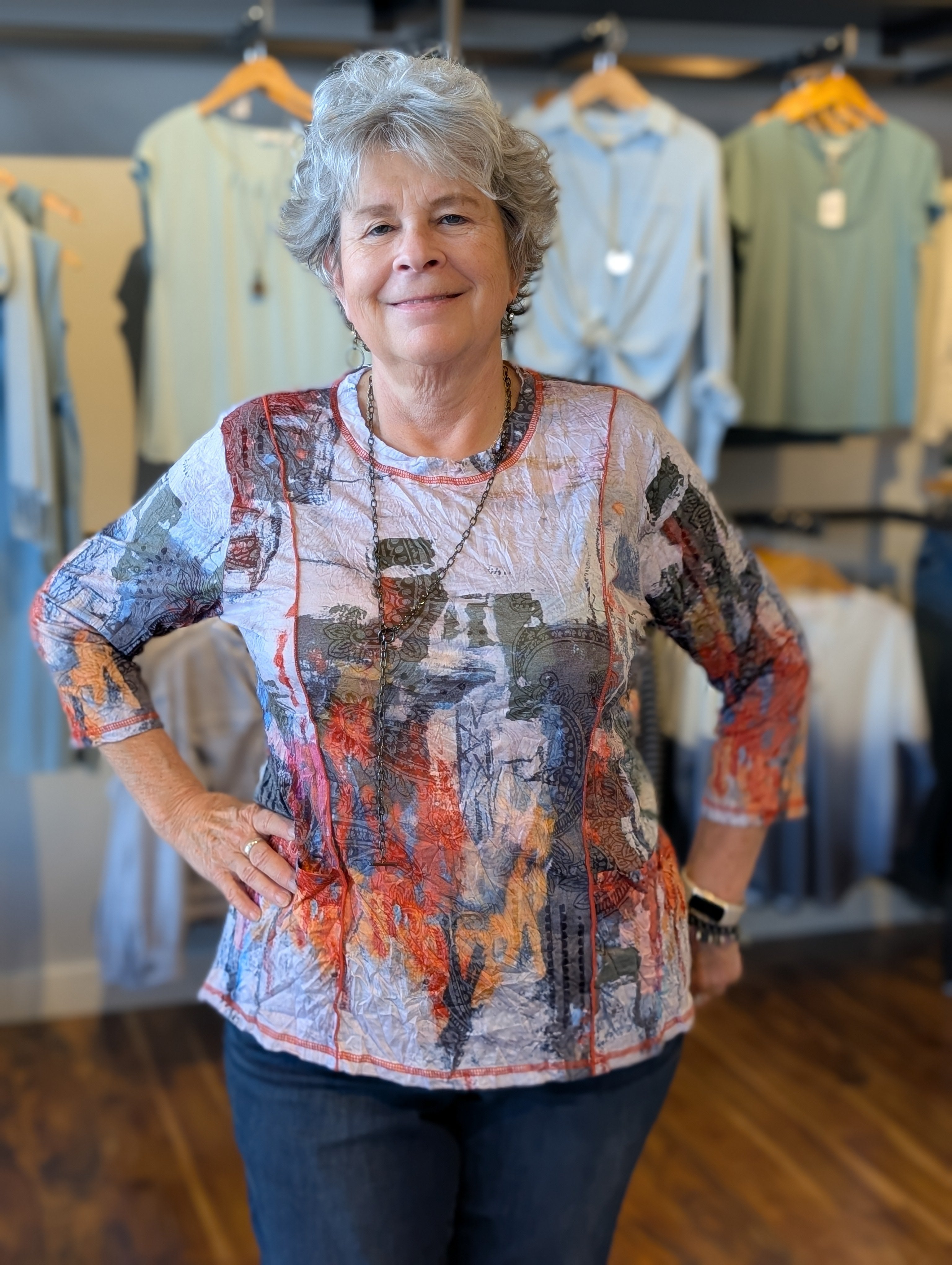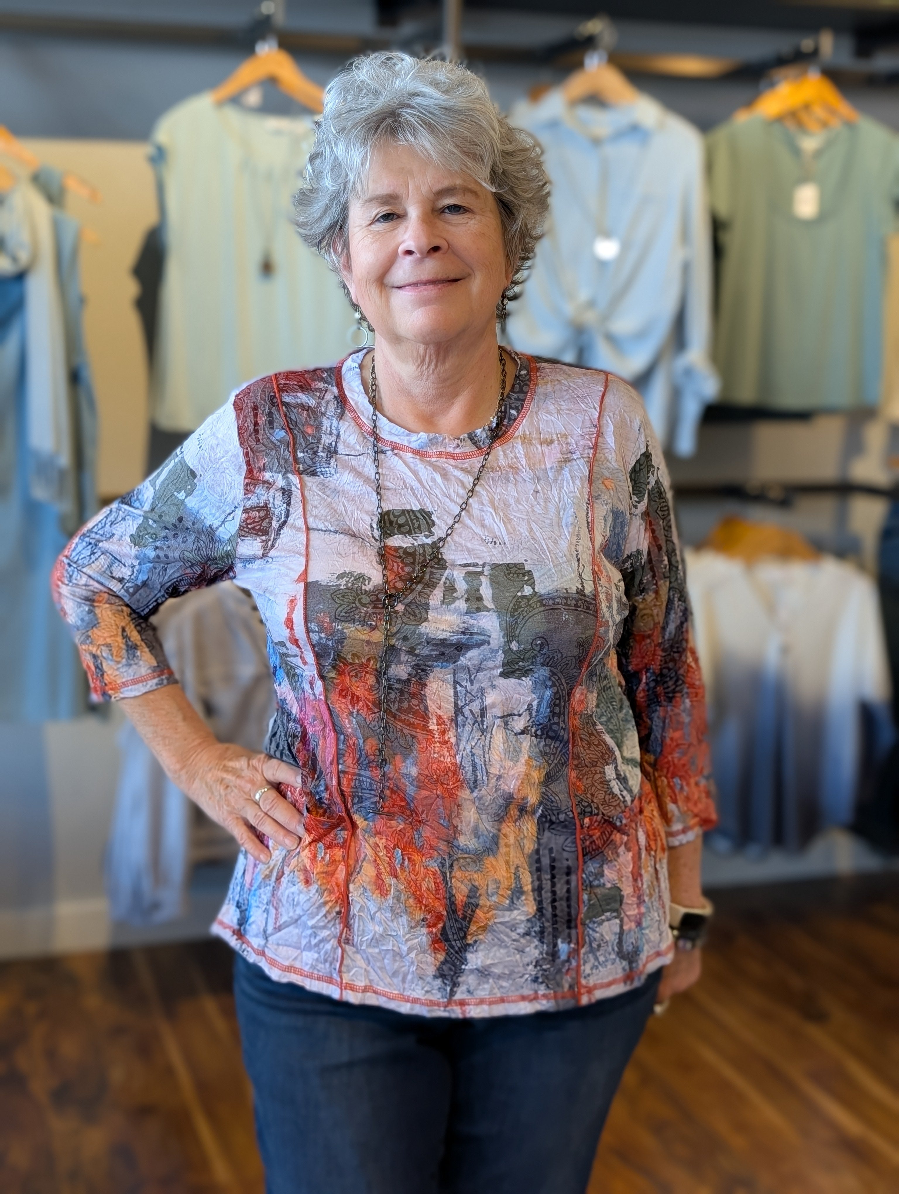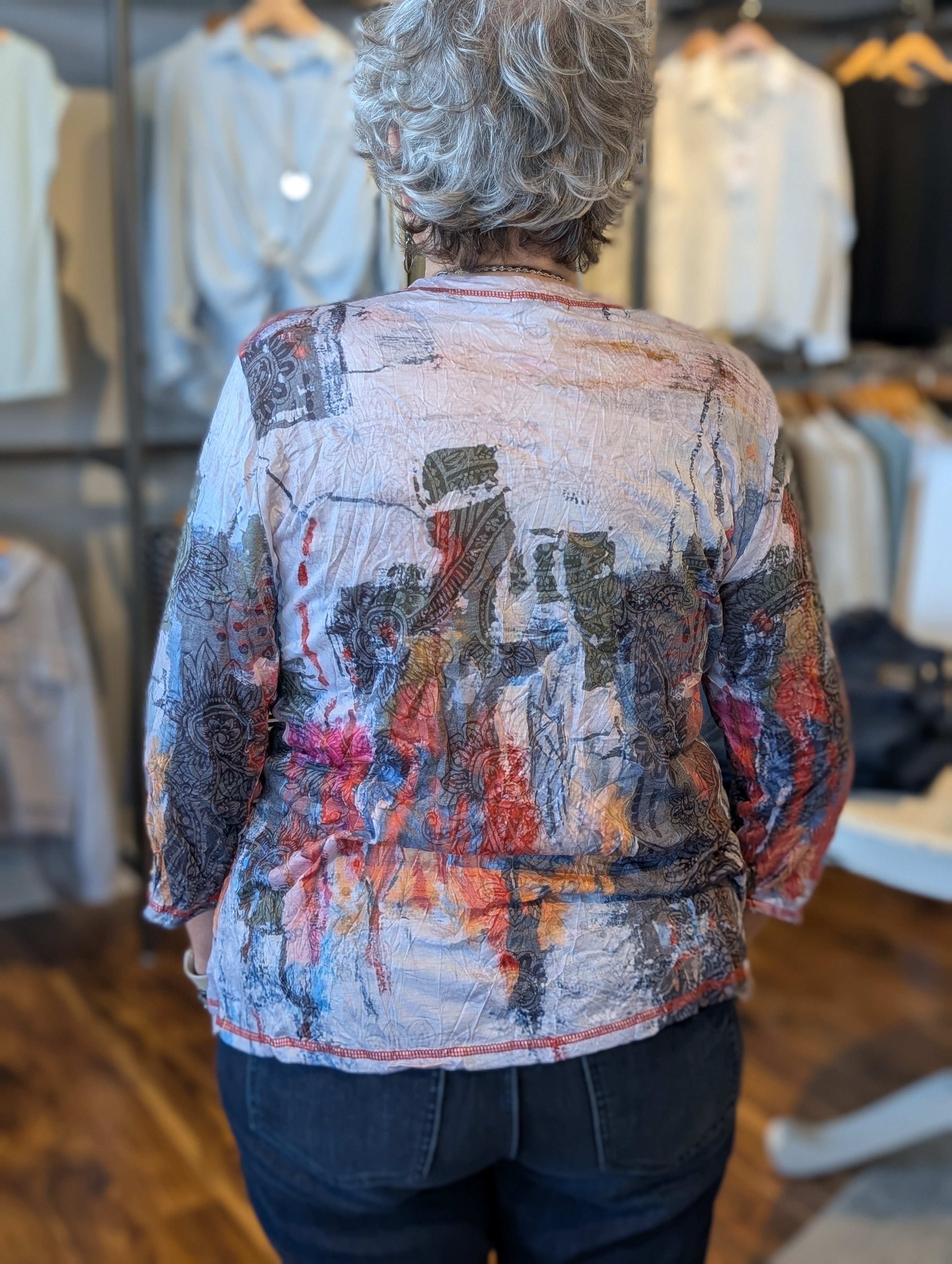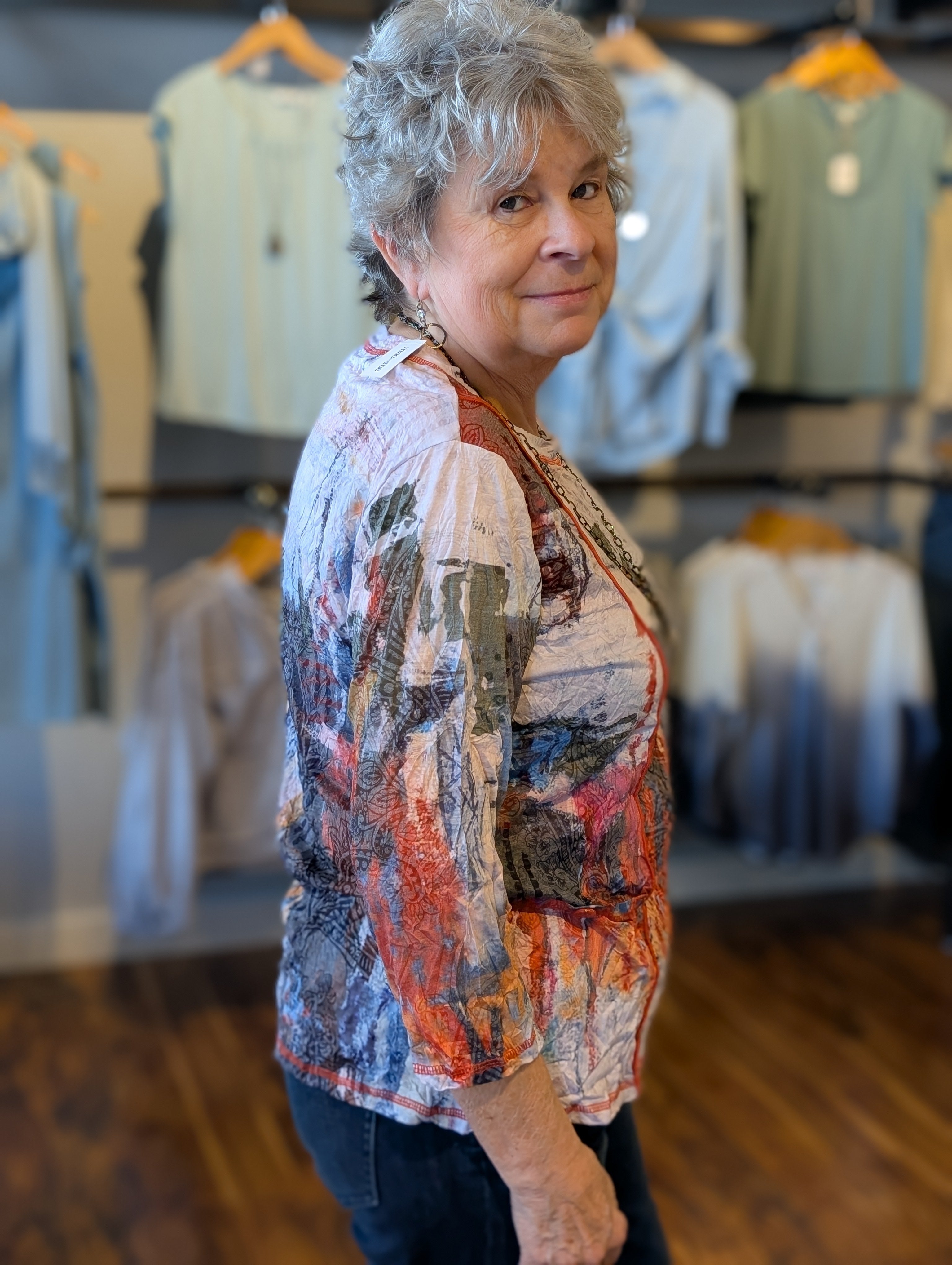 Crafted from soft crinkle fabric, this top combines comfort with easy care, making it ideal for travel. It features two practical pockets and contrast stitch detailing for added style and functionality. Lightweight and wrinkle-resistant, it ensures you stay polished and comfortable on the go.