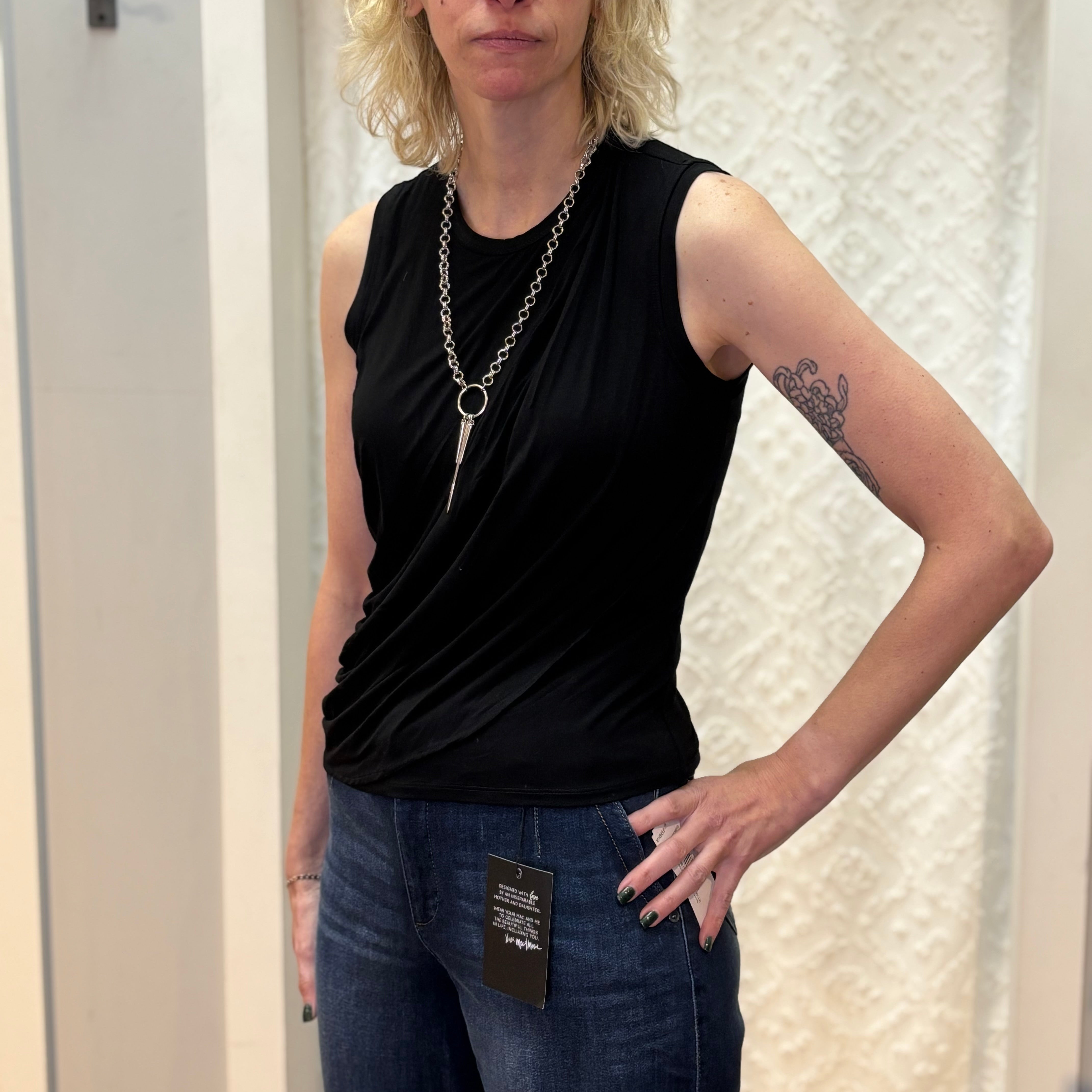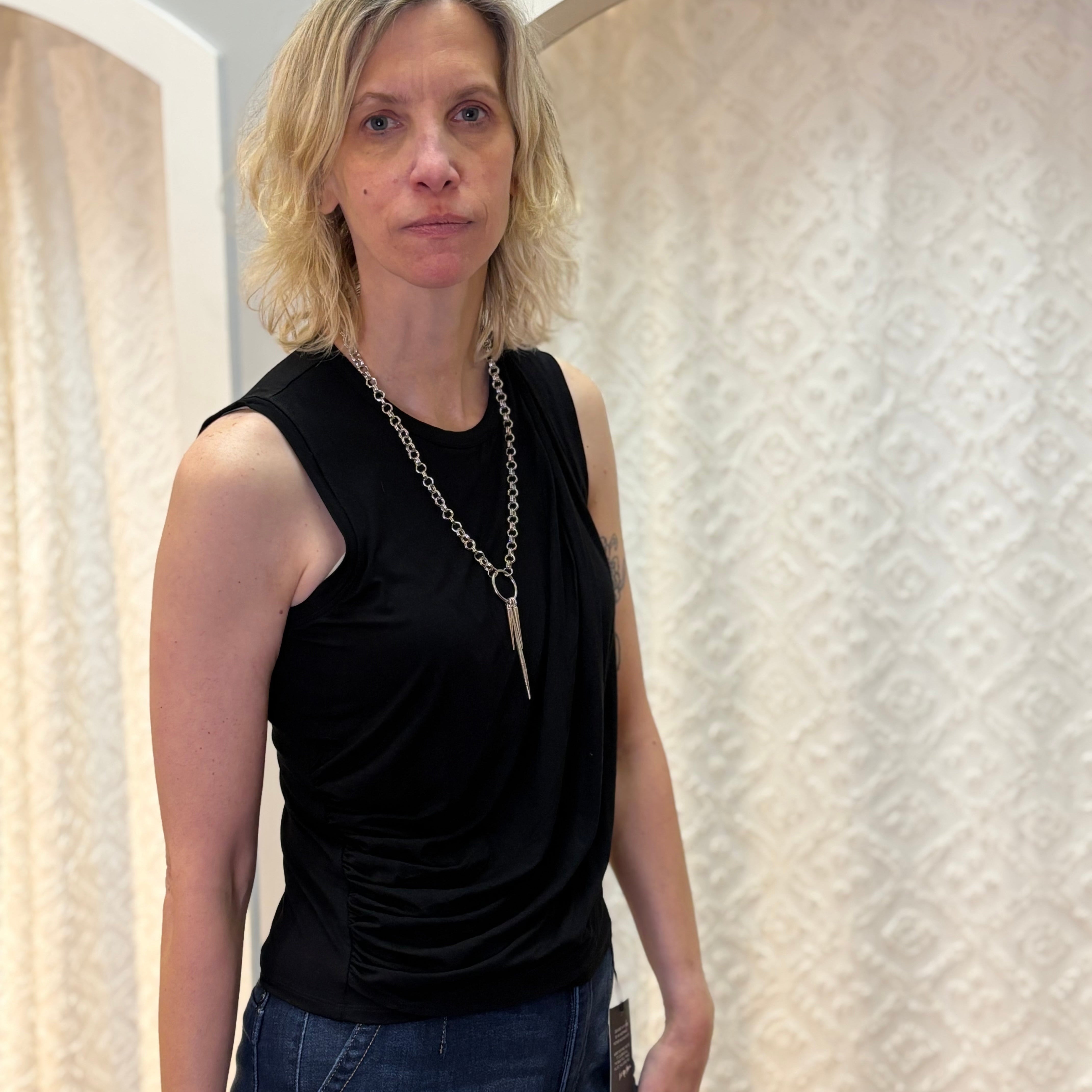 Meet your new layering MVP. This draped front tank features a flattering side-gathered design that beautifully skims and disguises the tummy area—perfect for those days you want effortless confidence. Crafted from a soft, stretchy rayon-elastane blend, it pairs seamlessly under jackets, blazers, or cardigans while still looking chic on its own.