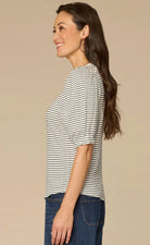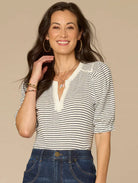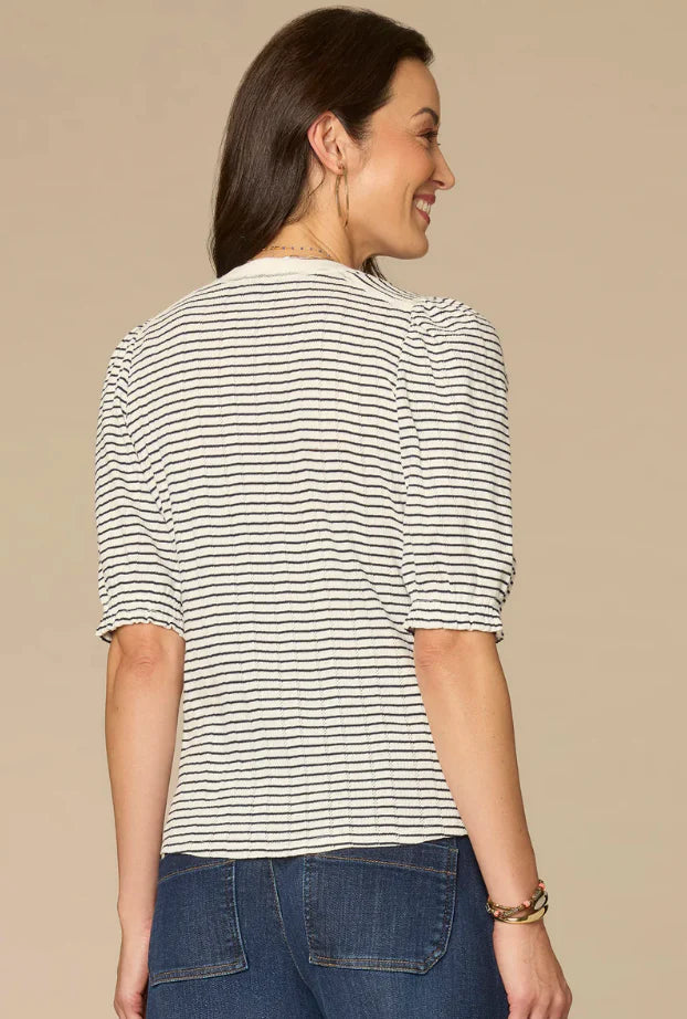 Striped Elbow Puff Half Placket Top with Lace Detail