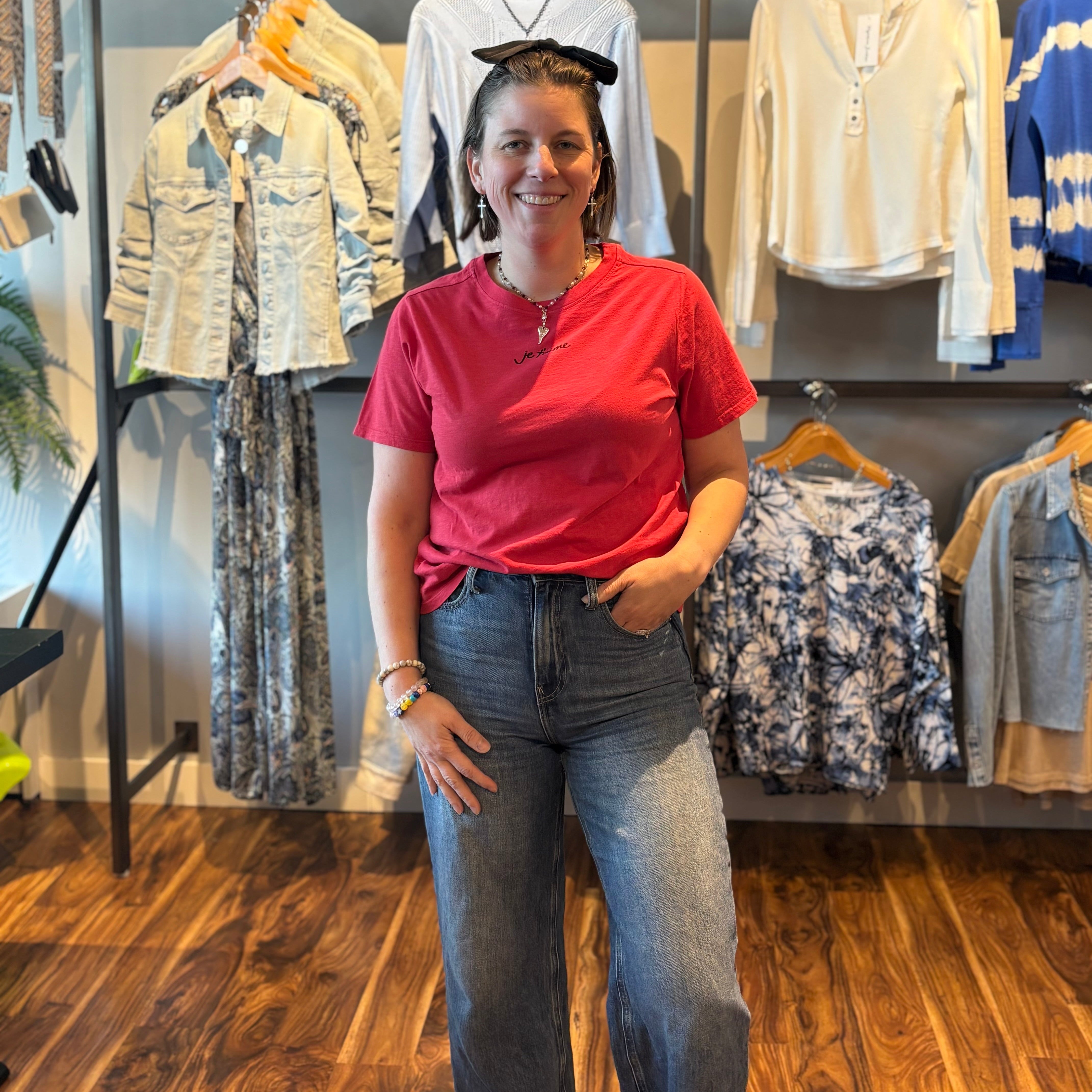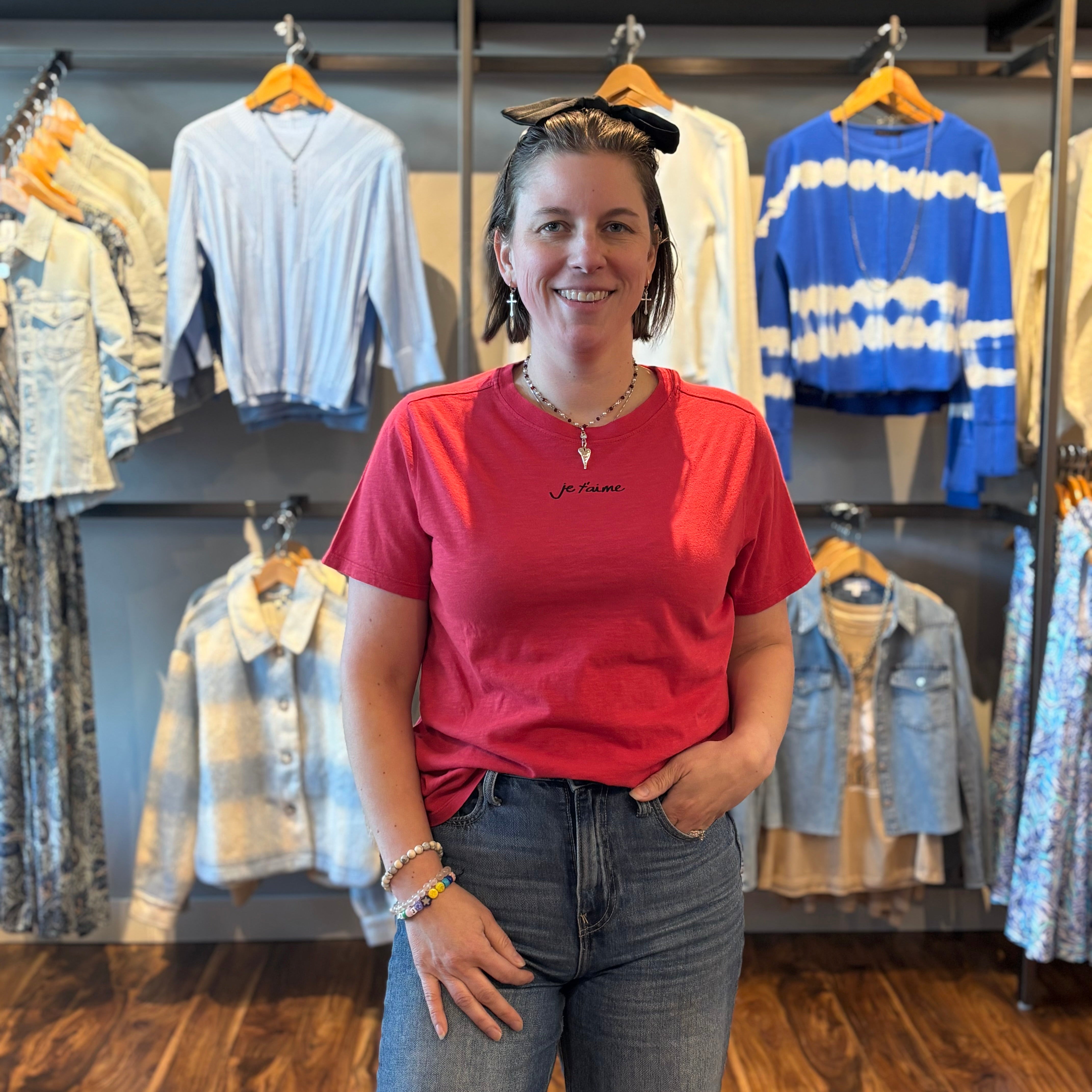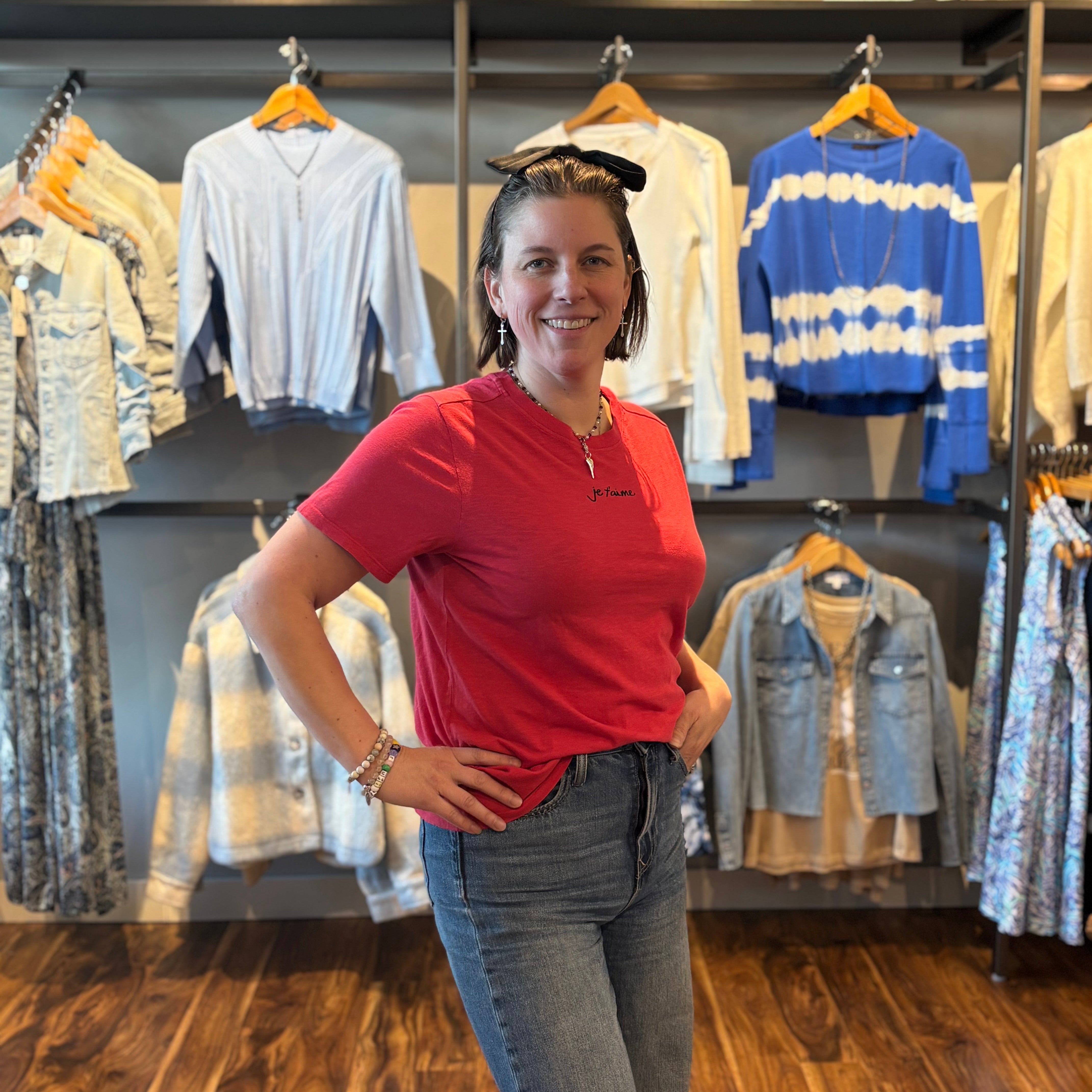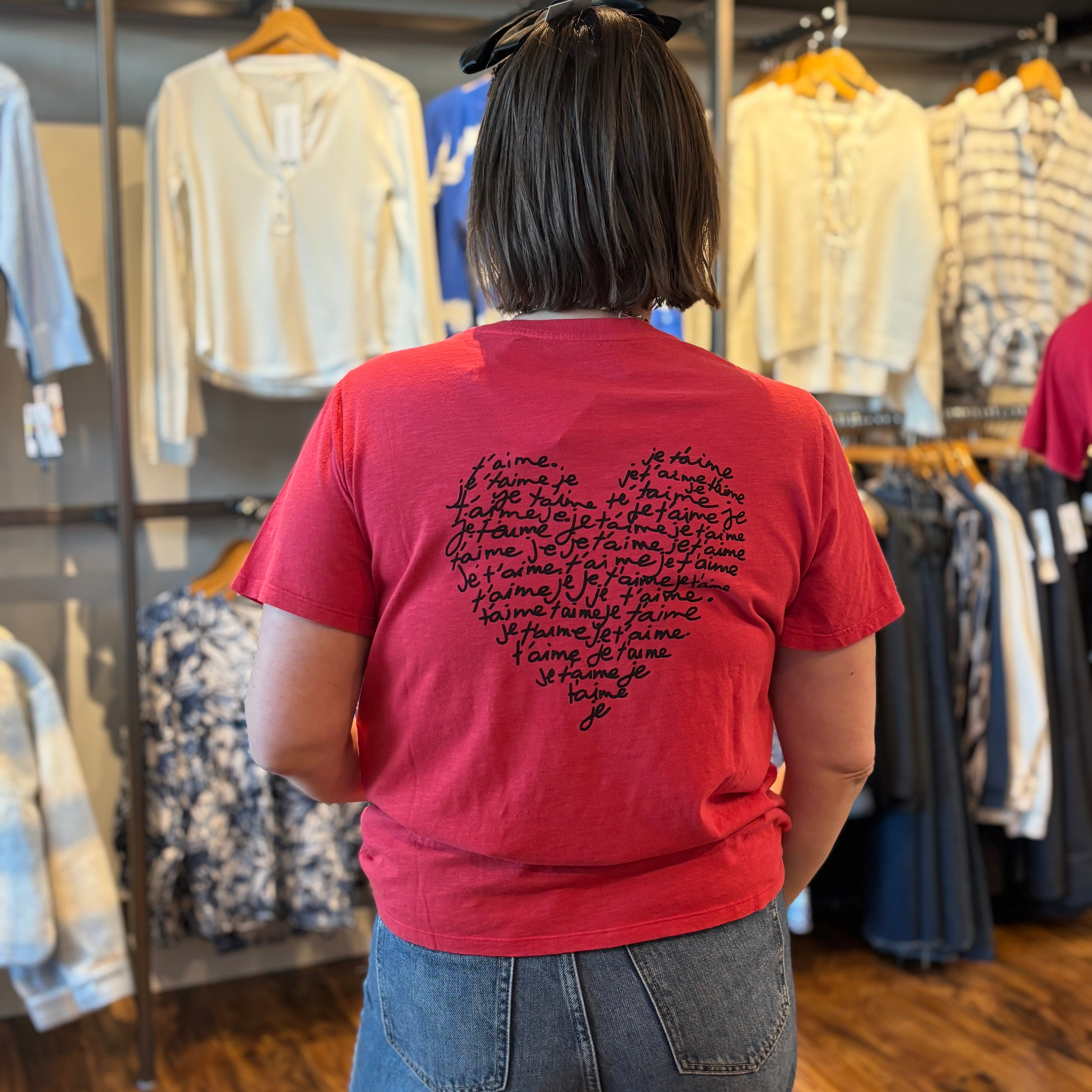 Simple in the front, statement in the back. This 100% cotton tee features a delicate “je t’aime” script across the chest and a playful heart graphic on the back filled with the same loving phrase repeated throughout. Soft, breathable, and perfectly everyday, it’s an effortless tee with a romantic twist.