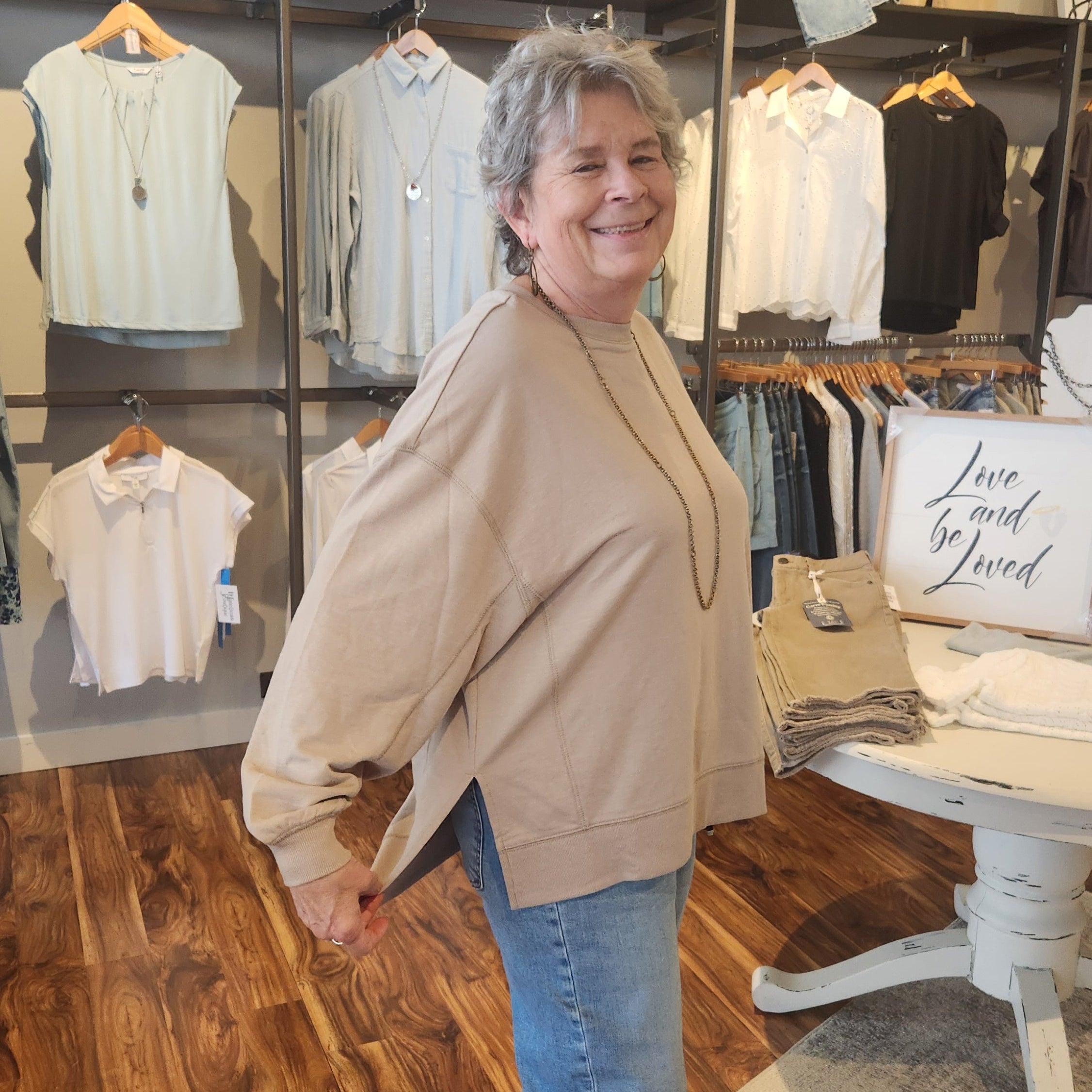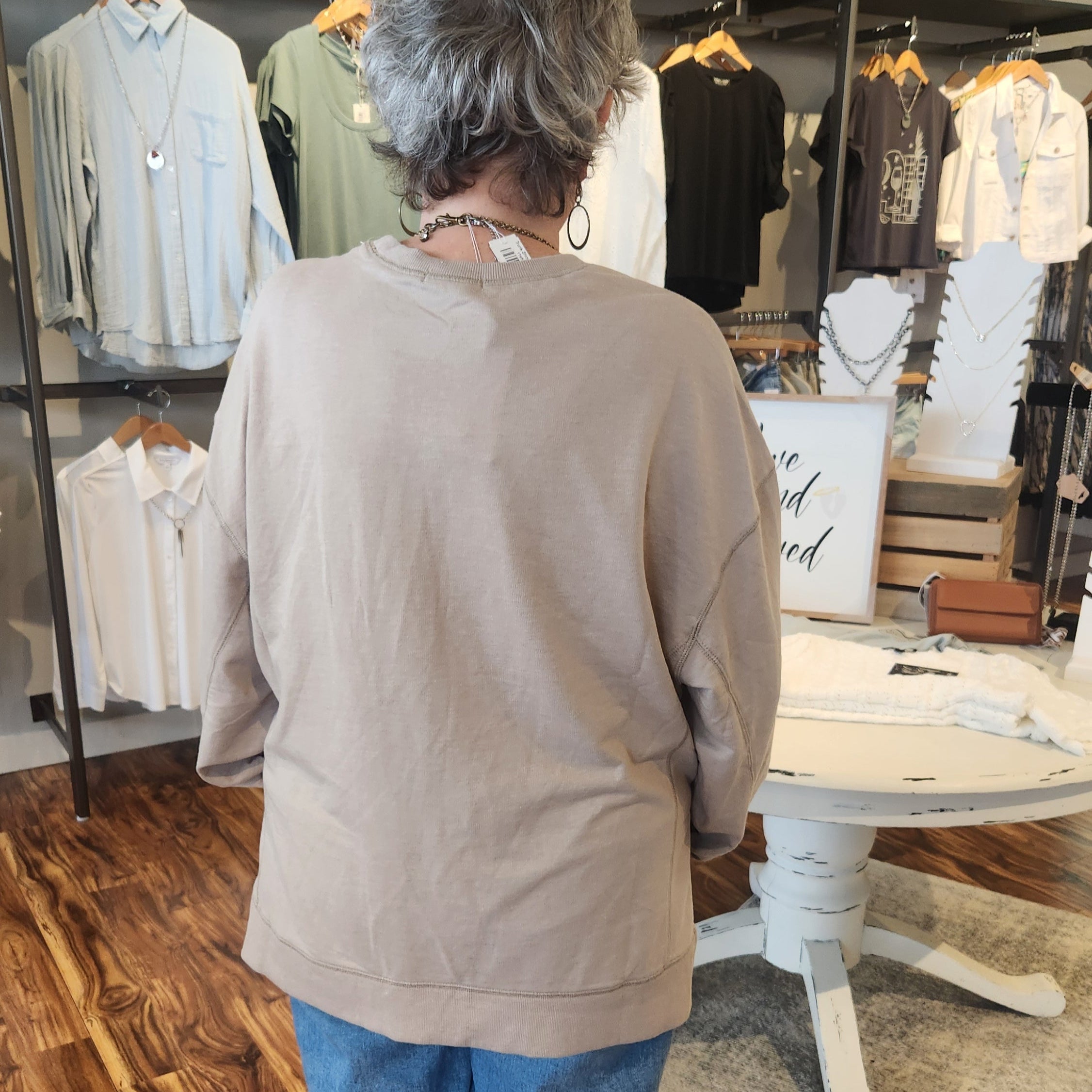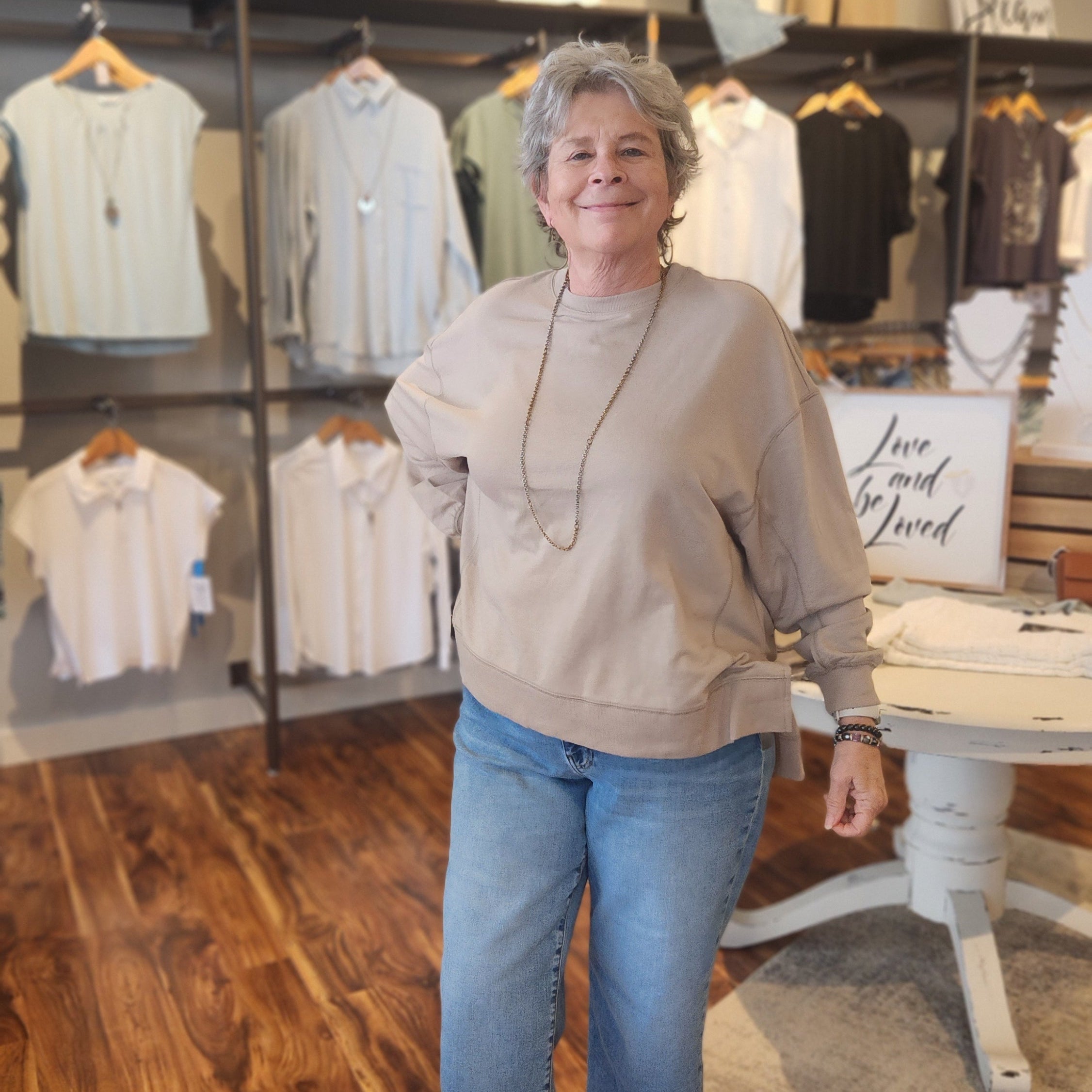 This cotton oversized sweatshirt features a stylish side slit and a longer back hem, adding a contemporary twist to a classic silhouette. Its great neutral color makes it easy to pair with any outfit, while the breathable cotton fabric ensures comfort throughout the day. Perfect for layering or casual wear, this piece combines modern design with everyday practicality.