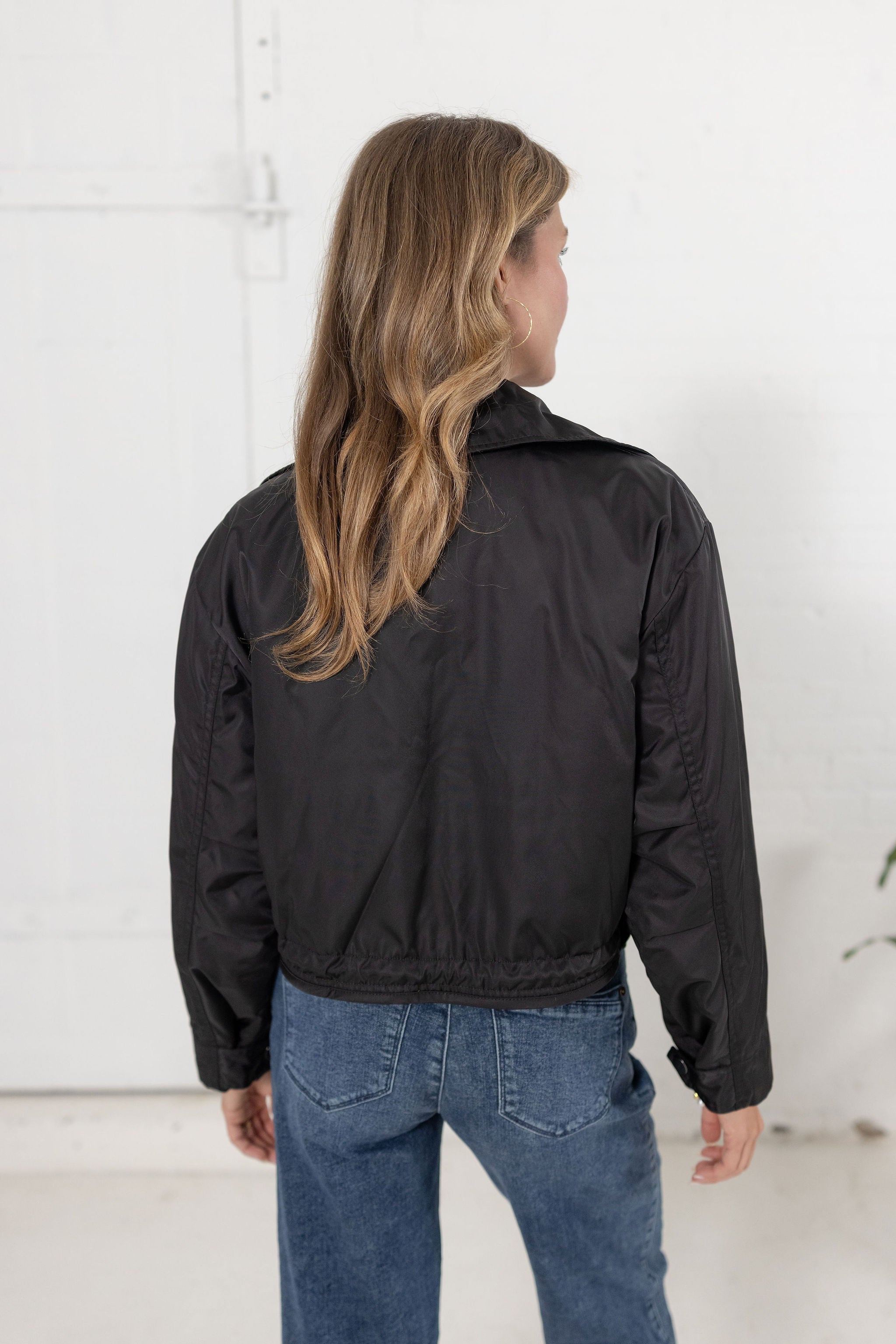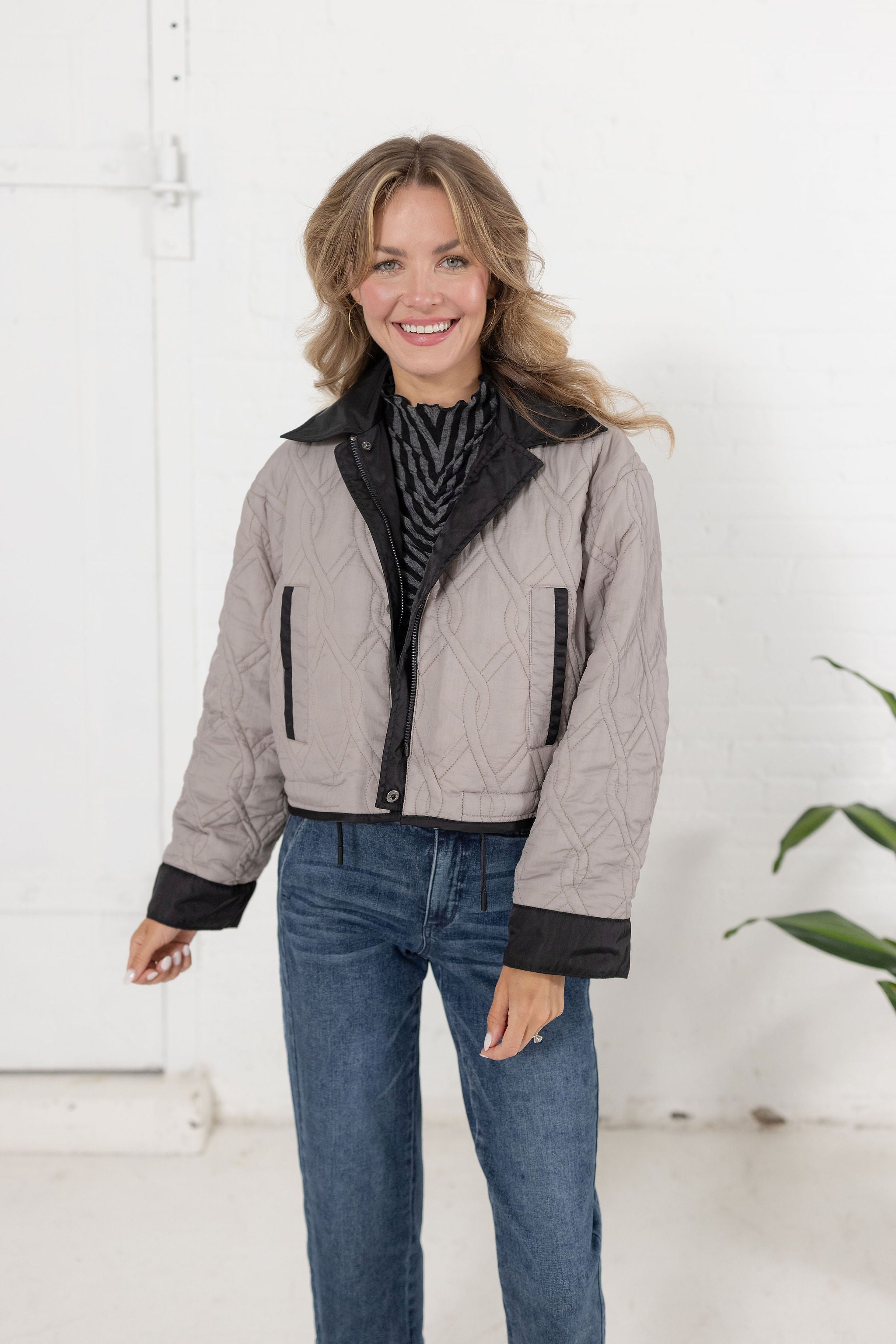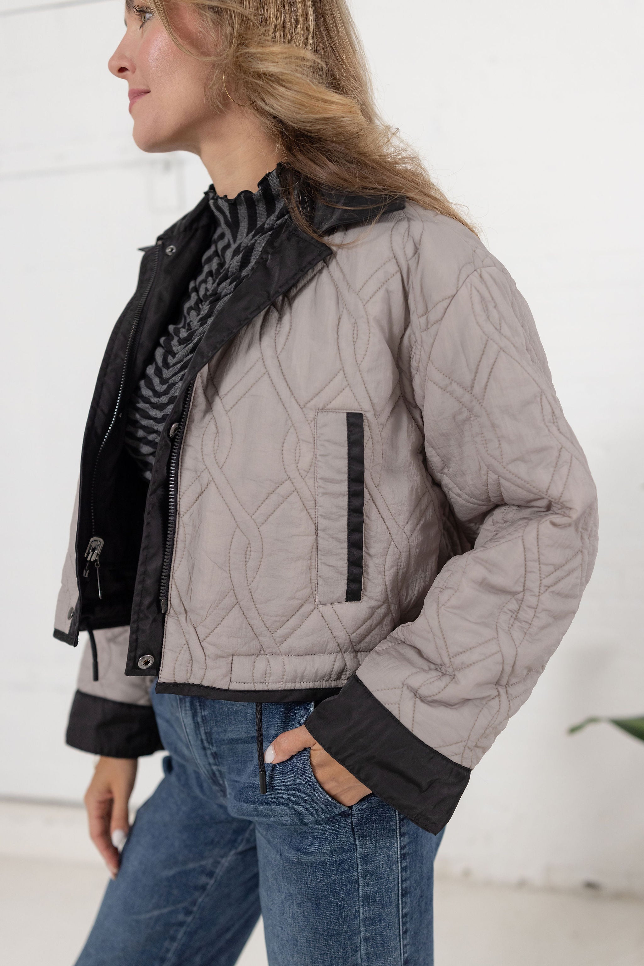 Slick, polished, and effortlessly modern, this Two-in-One Reversible Jacket is the ultimate cool-girl essential. Designed with a structured collar, oversized patch pockets, and a cropped hem with adjustable ties, it balances utility and style with ease. One side features a sleek black finish for timeless edge, while the reverse offers a quilted grey with contrast collar and pocket details—giving you two looks in one chic layer.