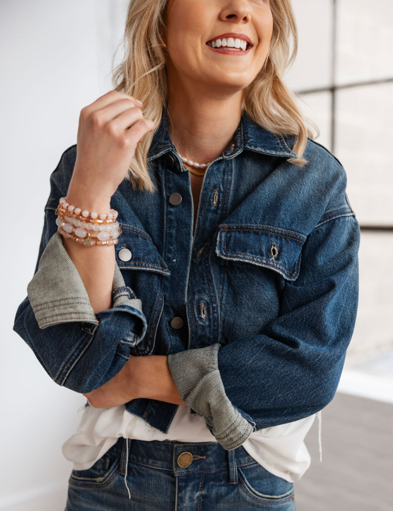 This cropped denim jacket is a modern take on a timeless wardrobe staple. Featuring a structured silhouette with double chest pockets and silver button detailing, it combines classic utility with contemporary style. The dark wash and rolled-up sleeves add versatility, making it perfect for layering over dresses, tops, or casual tees. Crafted from durable yet comfortable denim, this jacket is a go-to piece for effortless, year-round styling.