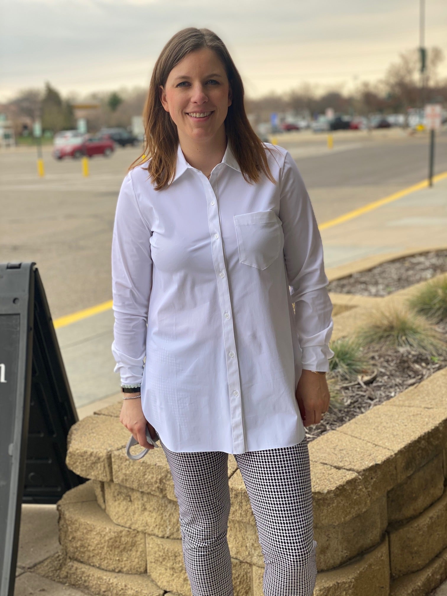 Our popular, legging-friendly Schiffer Button Down – crafted from soft, 4-way stretch Microfiber – is a collared long-sleeved shirt that tails longer in the back than front and offers a neat, rounded raw-cut hem. It resists wrinkles and travels wonderfully. Style this classic, legging-friendly shirt with denim leggings, ankle boots and a faux leather moto jacket. Or wear the Schiffer as a shacket over a turtleneck or the Classic Top.