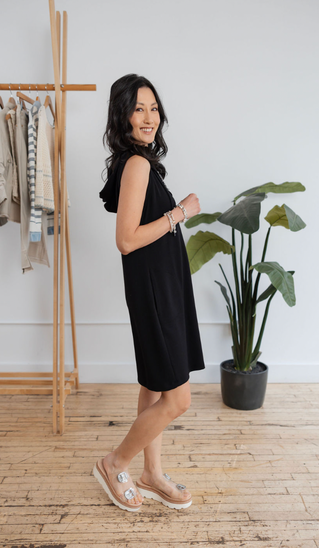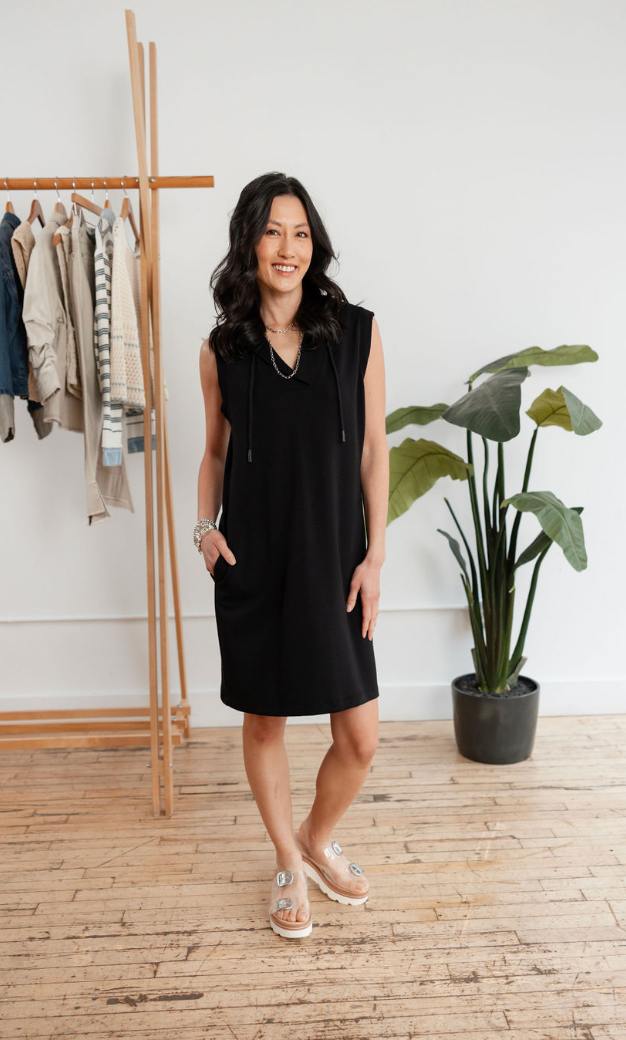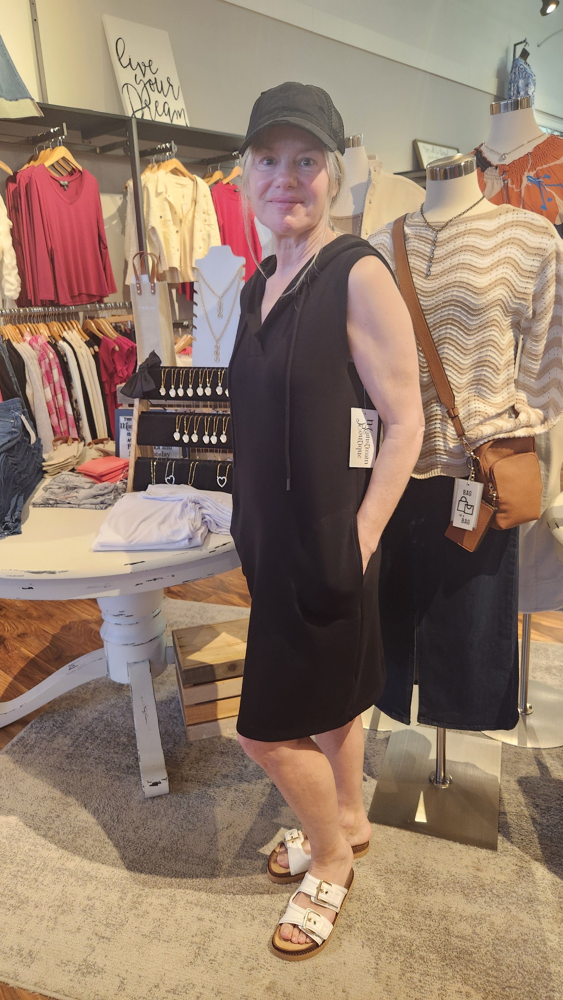 This sleeveless black dress is the epitome of casual sophistication and comfort. Featuring a relaxed fit and a sporty hood with adjustable drawstrings, it blends modern athleisure with classic elegance. The lightweight fabric drapes effortlessly, while the side pockets add both practicality and style. Perfect for dressing up with accessories or keeping it laid-back with sneakers, this versatile piece is a wardrobe essential for any occasion.