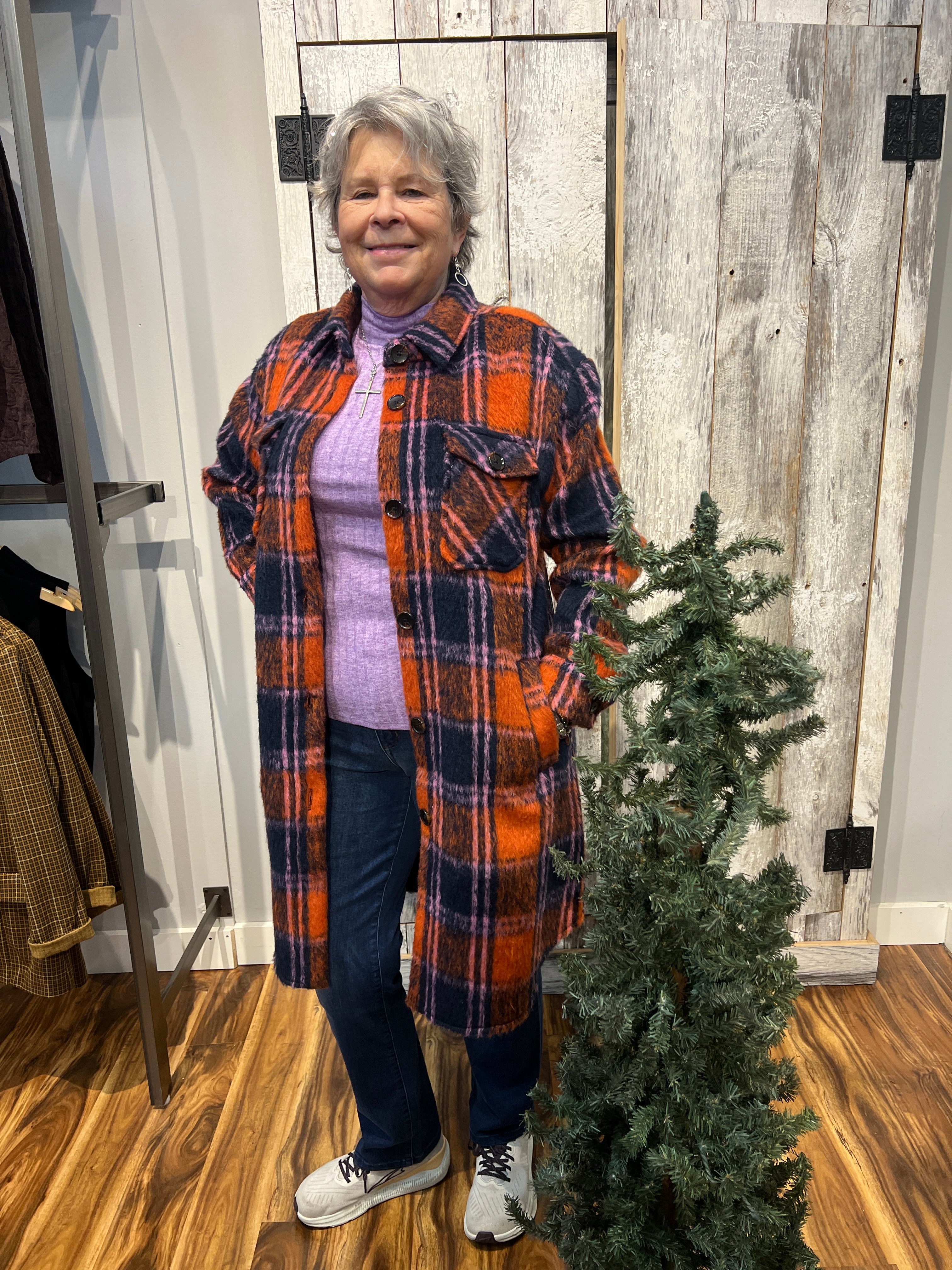 Make a statement in our stunning Orange, Pink, and Purple Long Shacket, the perfect blend of warmth, style, and versatility. Featuring a bold plaid design in rich, eye-catching hues, this longline shacket (shirt-jacket) adds a playful yet sophisticated touch to any outfit. Crafted from a cozy, mid-weight fabric, it’s ideal for layering during chilly days while keeping you effortlessly stylish.