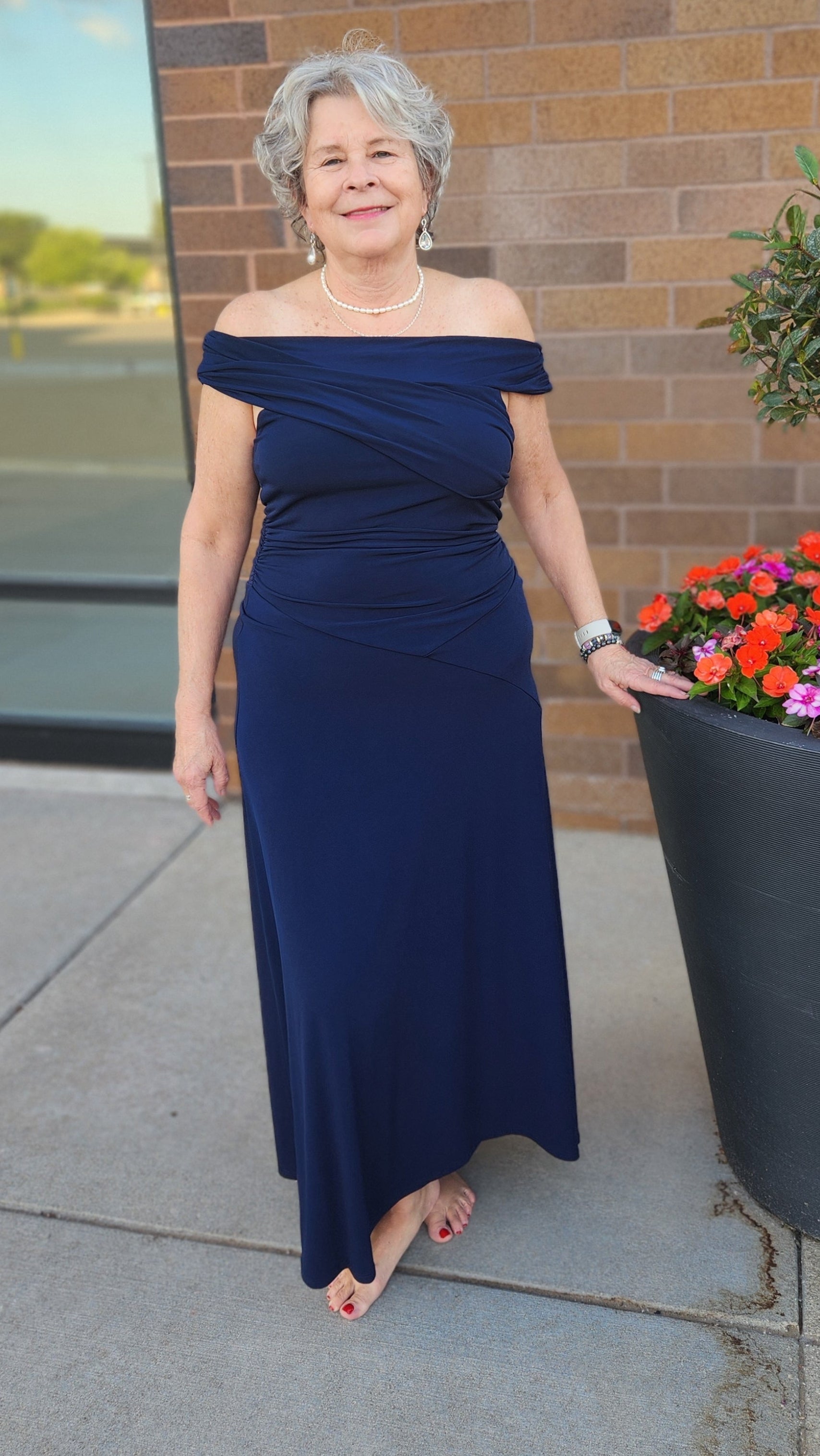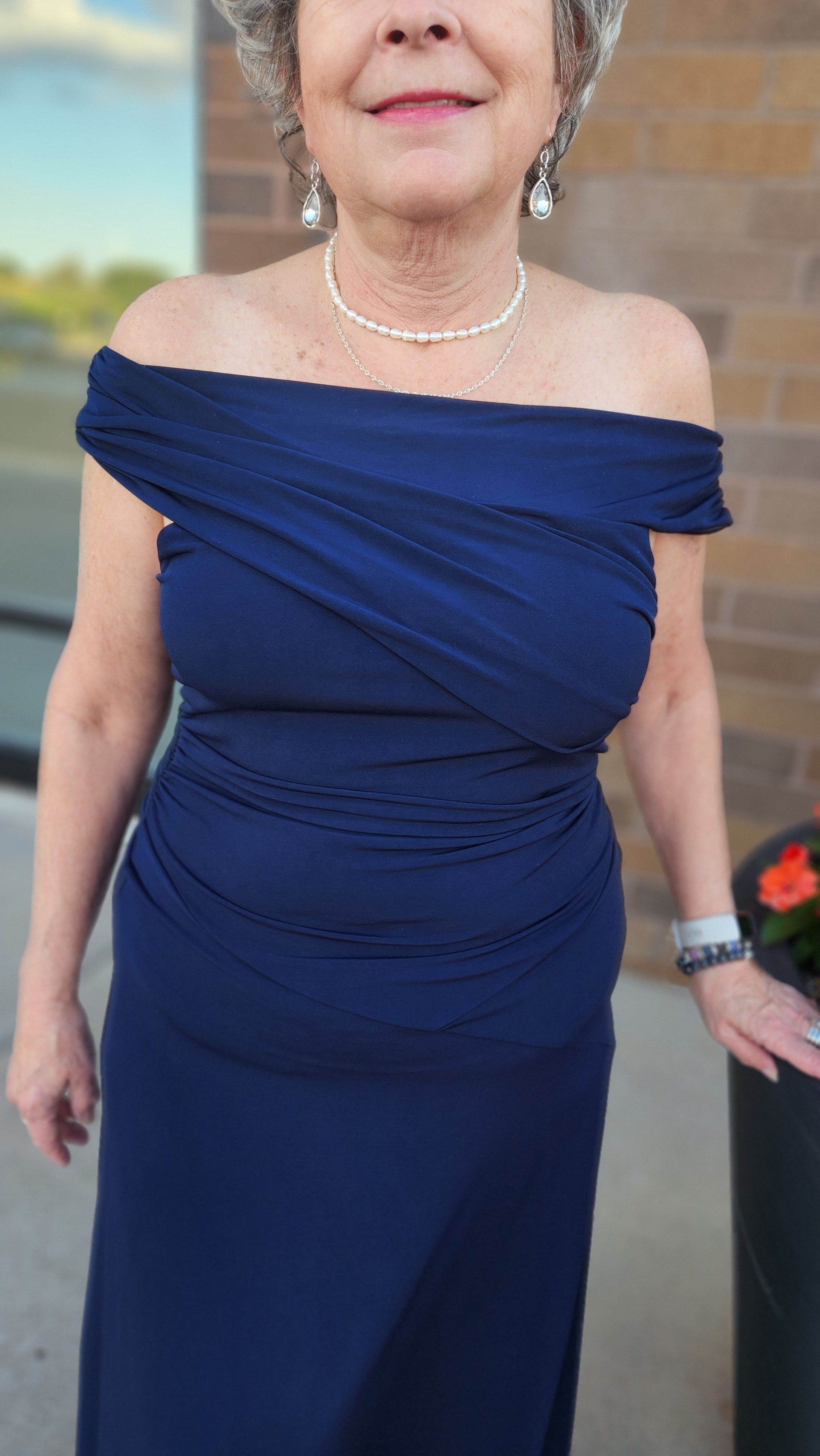 This ruched off-the-shoulder maxi dress in classic navy exudes timeless elegance. Designed to flatter with its subtle ruching, it offers a sophisticated silhouette that gracefully enhances your natural curves. The versatile off-the-shoulder style adds a refined touch perfect for both formal events and upscale casual occasions. Its maxi length ensures a poised, elongating effect, making it a lasting staple for any wardrobe seeking understated luxury.