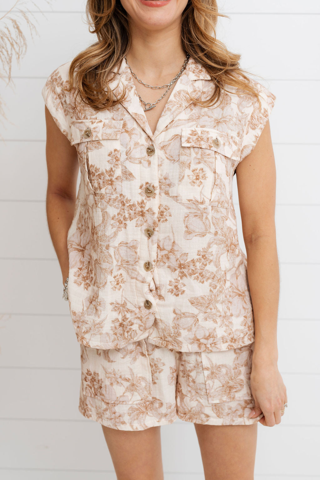 Light, airy, and effortlessly cool — this sleeveless camp shirt is crafted from breathable cotton gauze for a relaxed, laid-back feel. Designed with a button-down front, classic collar, and an easy fit, it’s the perfect warm-weather staple. Wear it solo or pair it with the matching shorts for a coordinated look that’s as comfortable as it is stylish. Whether you're headed to the beach, brunch, or just relaxing at home, this set is your go-to for effortless summer style.