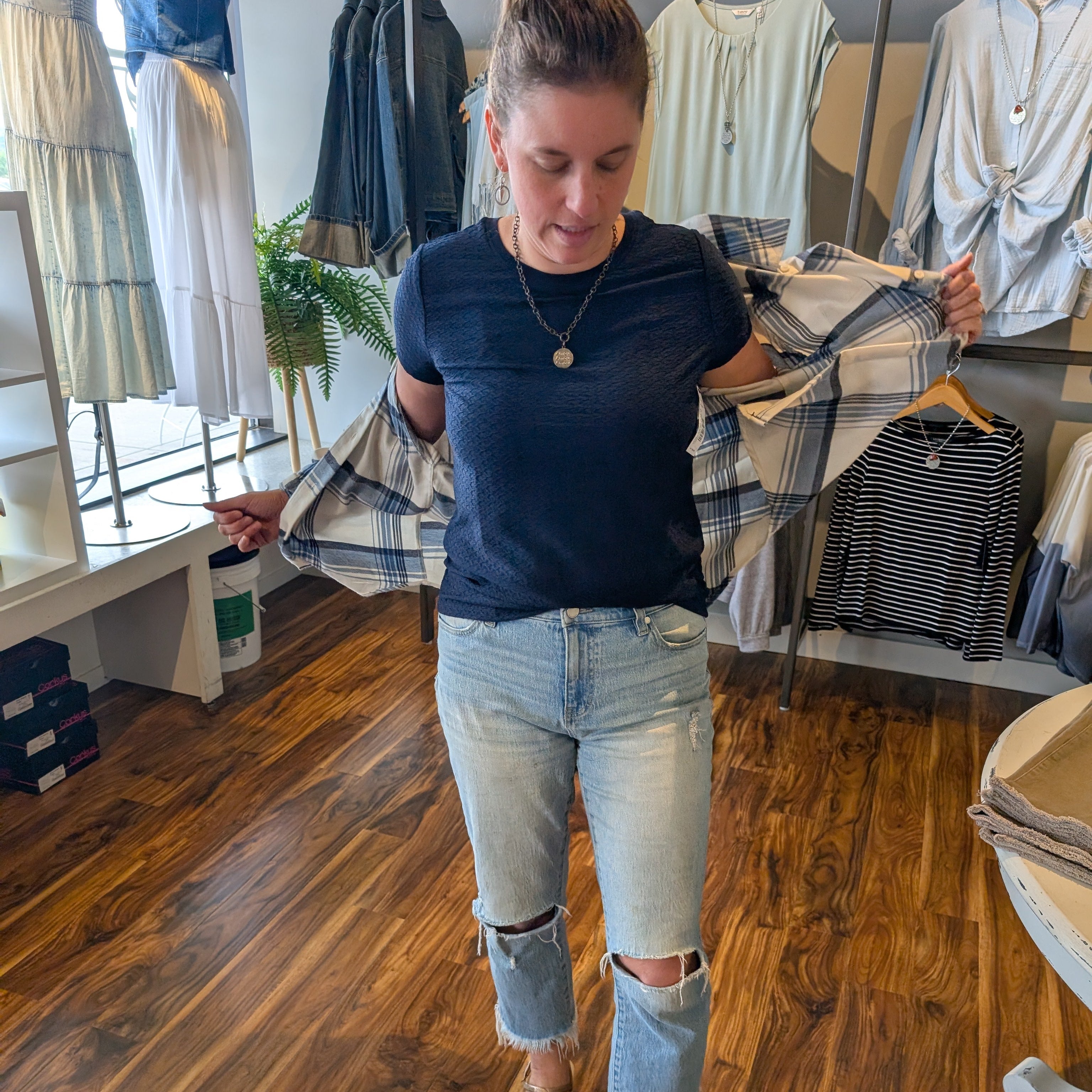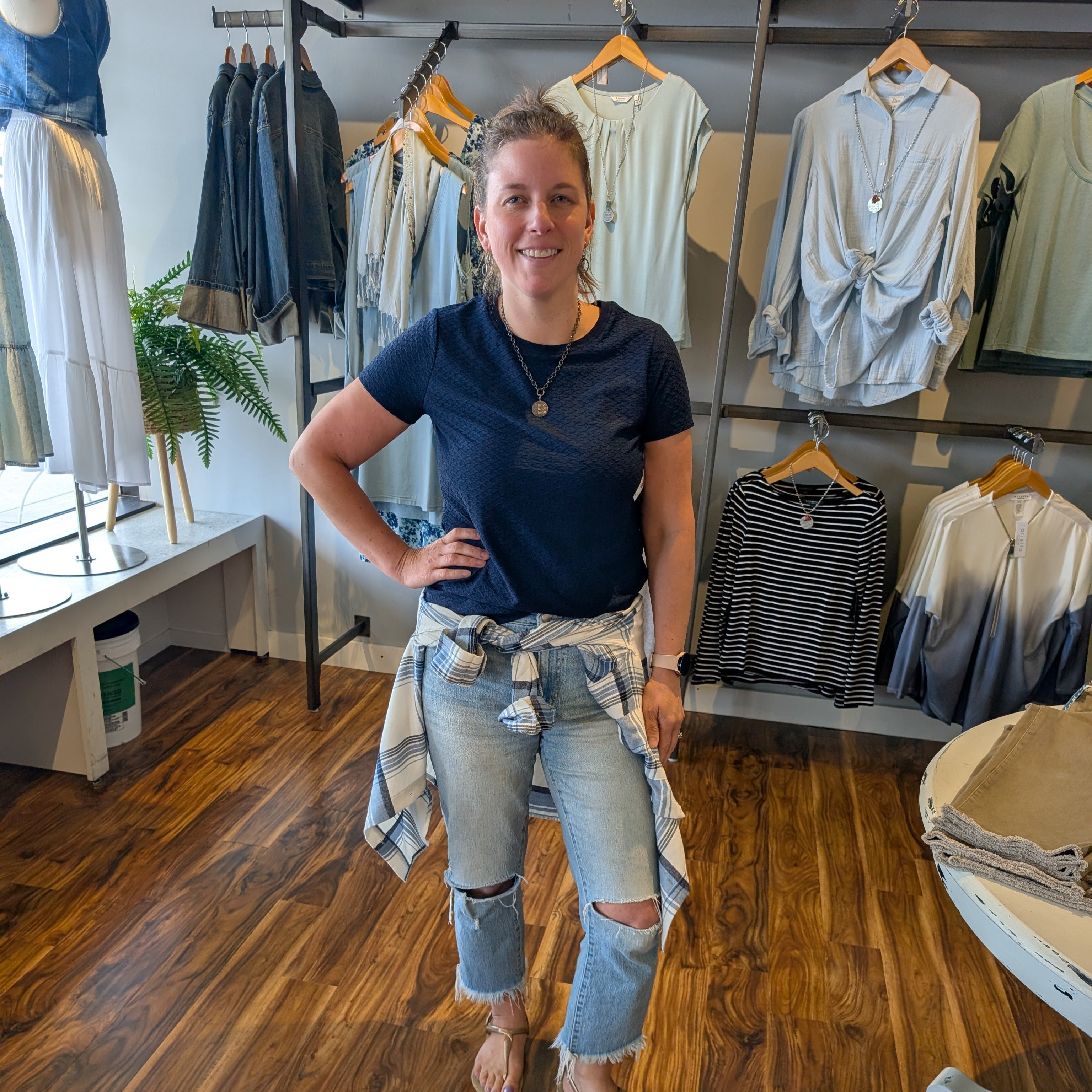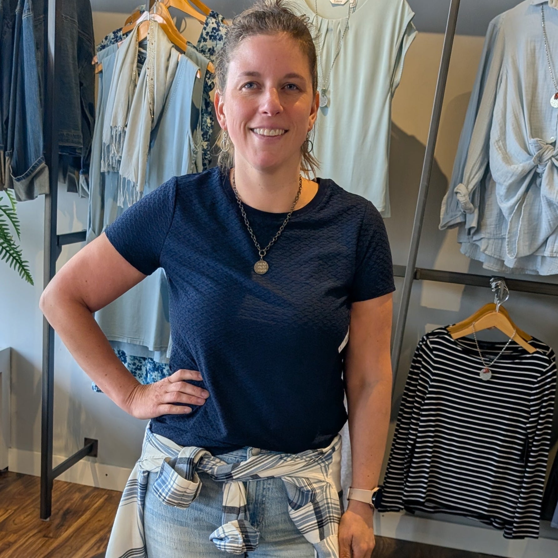 This SS Crew Neck Textured Knit Top offers a refined classic fit with a subtle textured fabric that enhances its versatility. Designed for women seeking both comfort and style, it can be effortlessly dressed up for a polished look or dressed down for casual wear, making it a reliable staple in any wardrobe.